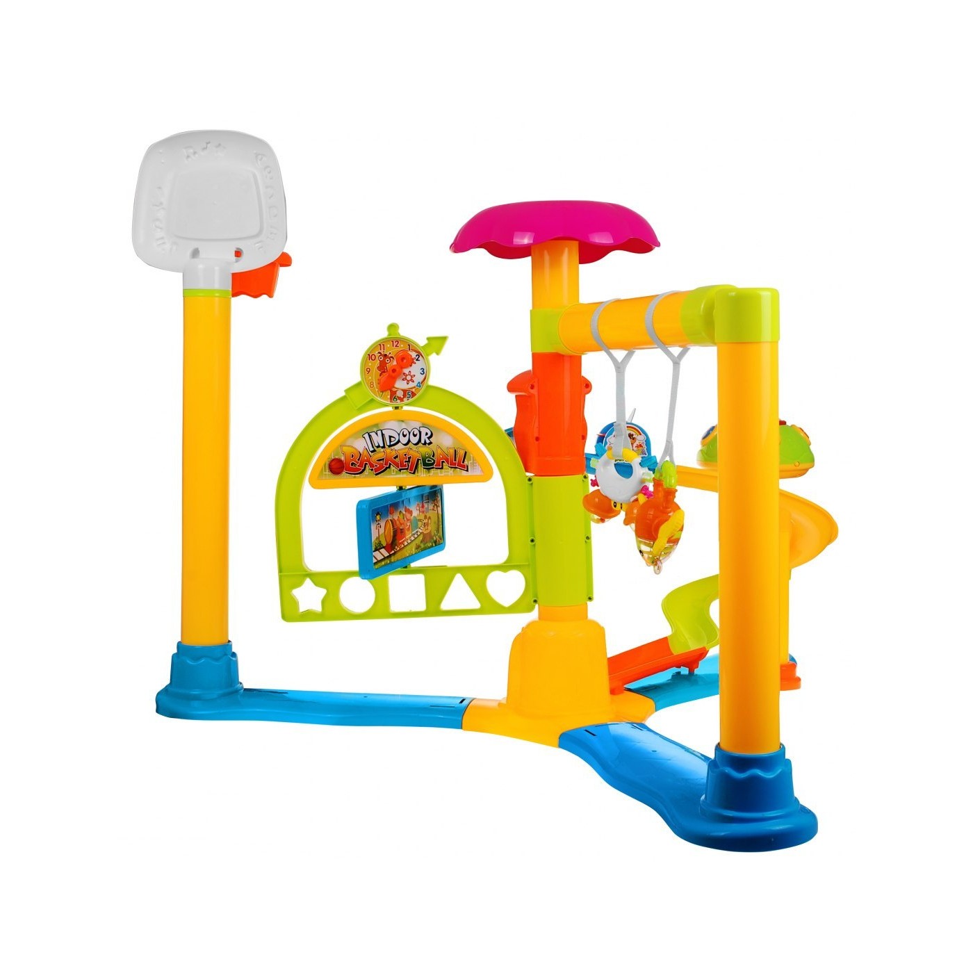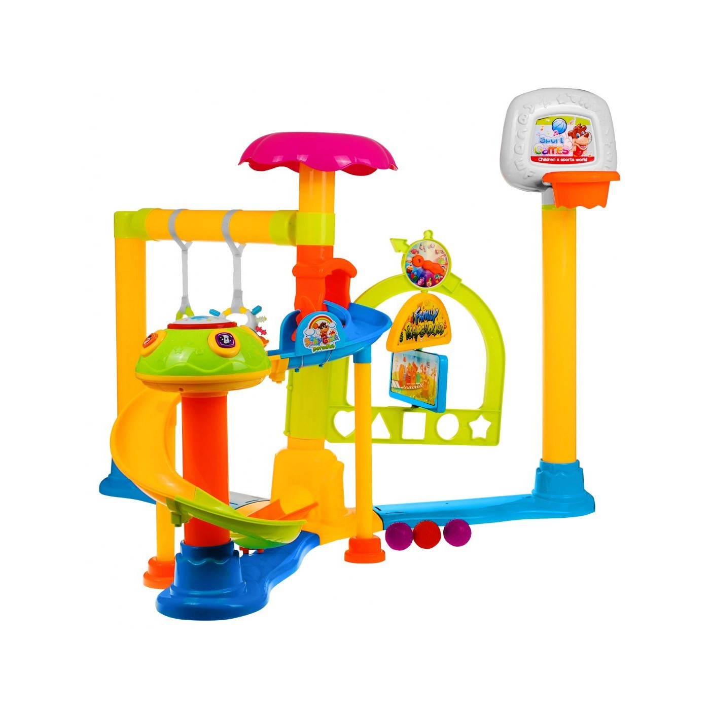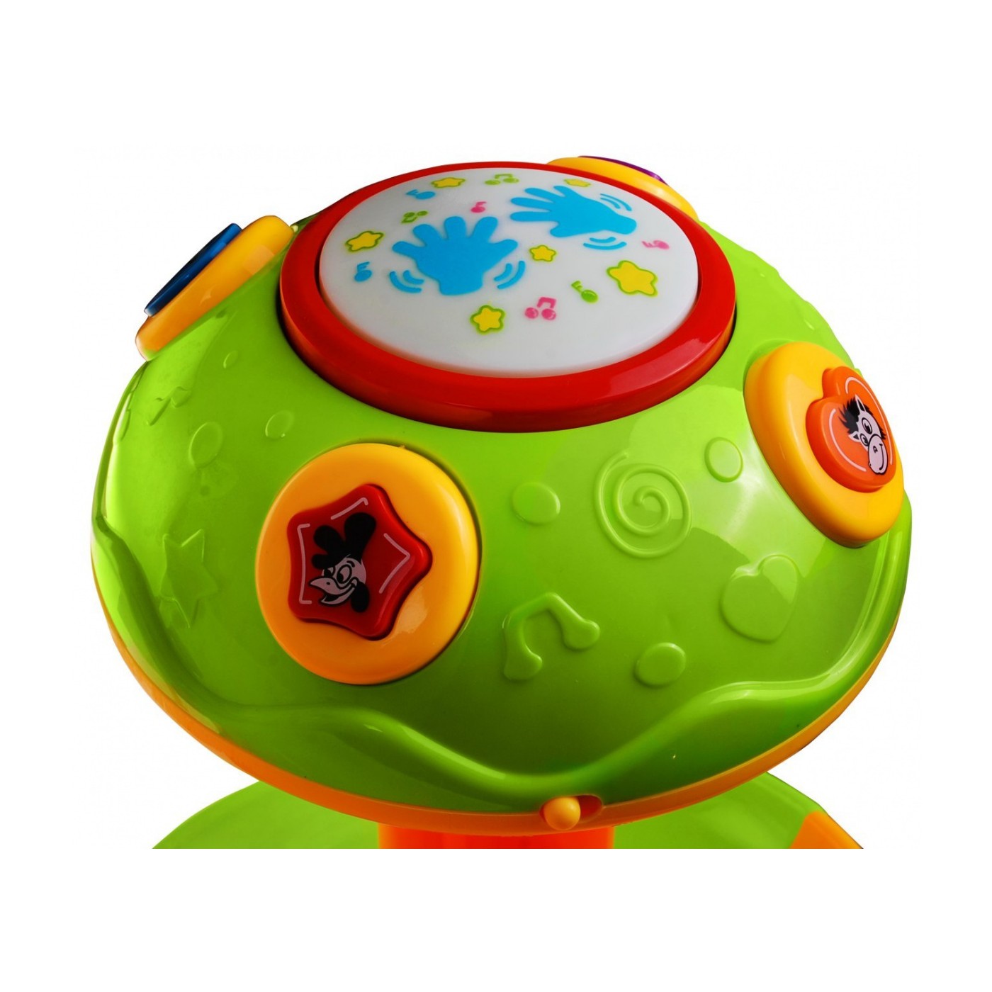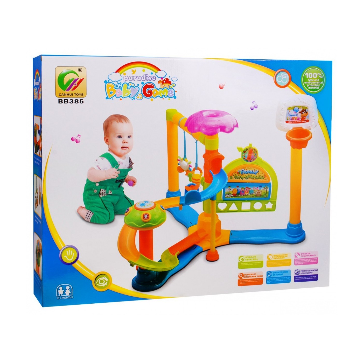 | | Cały zestaw można podzielić na kilka części: - część 1 - wesoła zjeżdżalnia. Do fioletowego kwiatuszka od góry wrzucamy kolorowe kulki - szalony wyścig po kolorowej zjeżdżalni czas zacząć ! - część 2 - stojak z kolorowymi podwieszanymi dużymi grzechotkami. Grzechotki można w łatwy sposób odczepić od stojaka - umieszczone są na bezpiecznych rzepach. - część 3 - mini-kosz do koszykówki. Maluchy za pomocą kolorowych piłeczek mogą ćwiczyć celność. Dodatkowo zestaw zawiera dużego dźwiękowego grzybka. Po naciśnięciu jednego z 4 przycisków każdy zwierzak wyda swój odgłos, kolejne naciśnięcie uruchomi wesołe melodyjki, w rytm których wplecione są odgłosy zwierzaków. Biały duży przycisk uruchamia wesołe oklaski. |