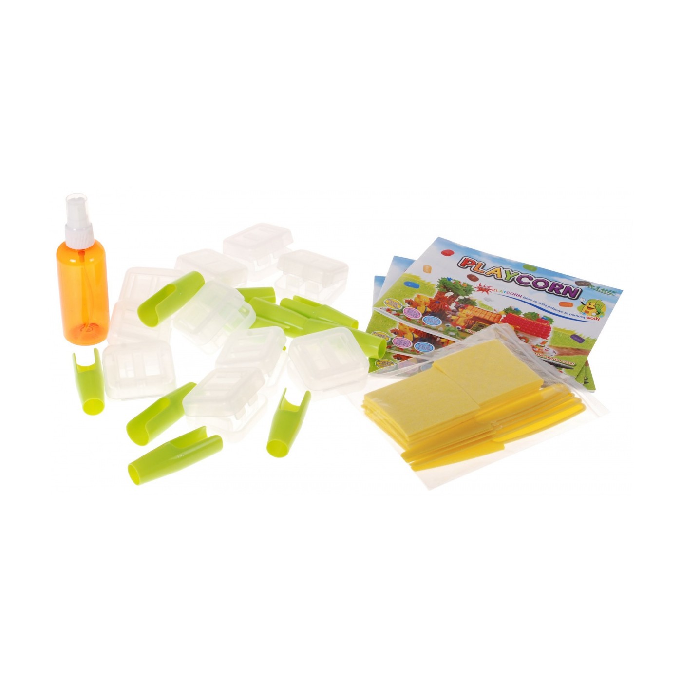 Zestaw PLAYCORN 5000 to zabawka konstrukcyjna przyjazna środowisku. Składa się z kolorowych elementów kukurydzianych, które łączymy ze sobą za pomocą wody. Używając specjalnej gąbeczki delikatnie zwilżamy wodą elementy i dowolnie je łączymy.