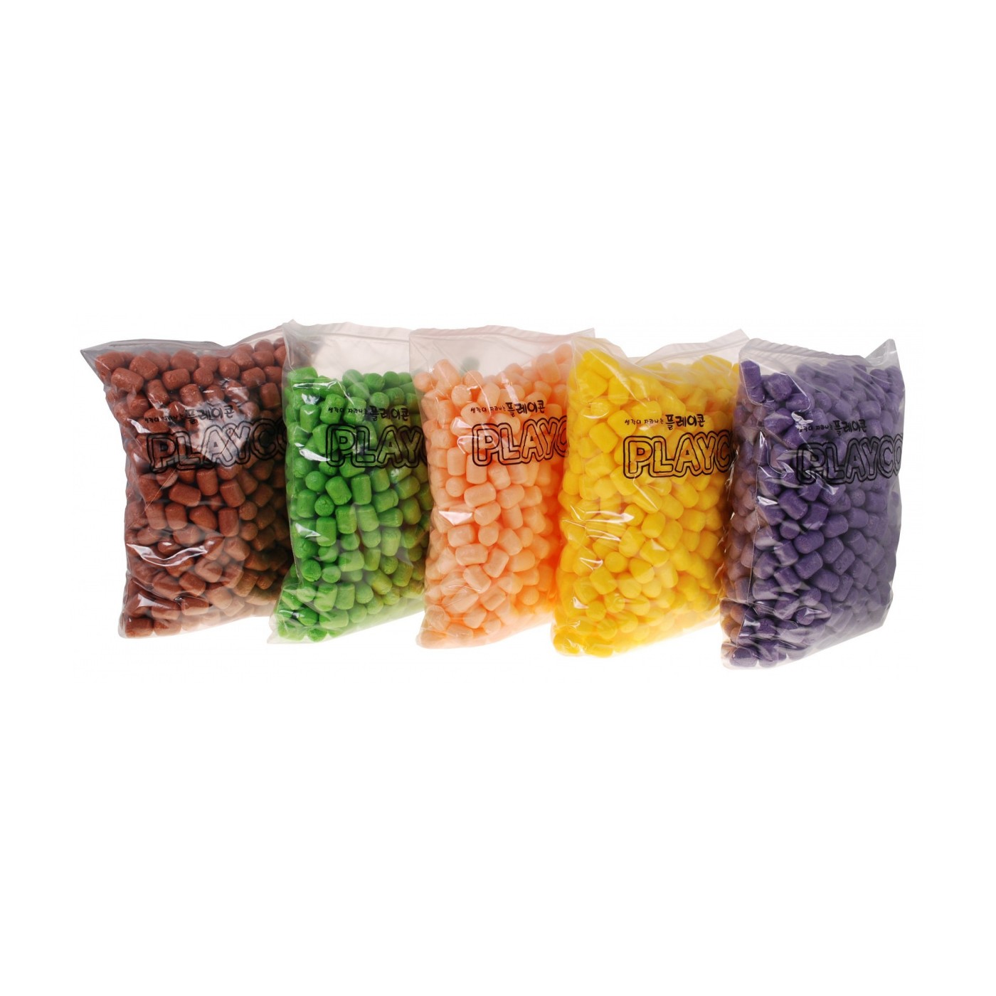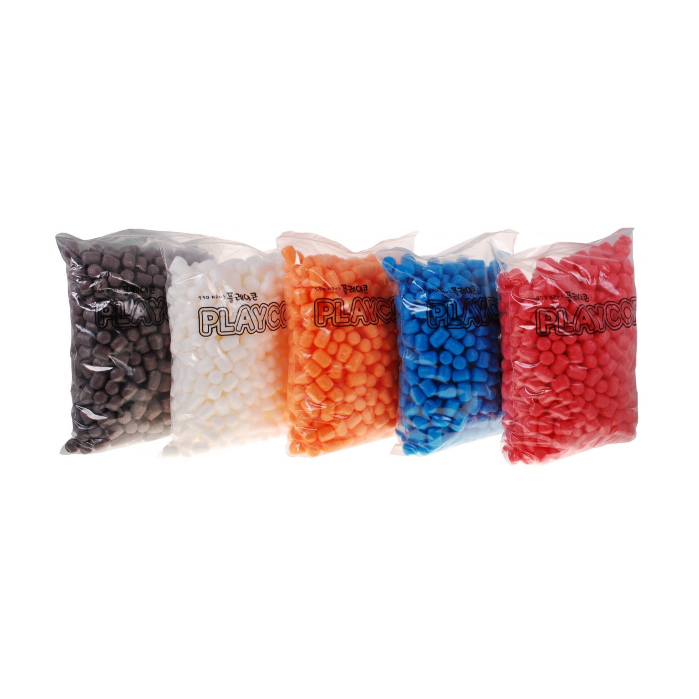 W SKŁAD ZESTAWU WCHODZĄ: - kolorowe kukurydziane elementy 5000 sztuk, - 3x forma do cegieł, - gąbka, -5x bezpieczny nóż - 5x kolorowa podkładka, - kredka PLAYCORN, - kartka do rysowania, - pojemnik na wodę, - instrukcja w języku POLSKIM.