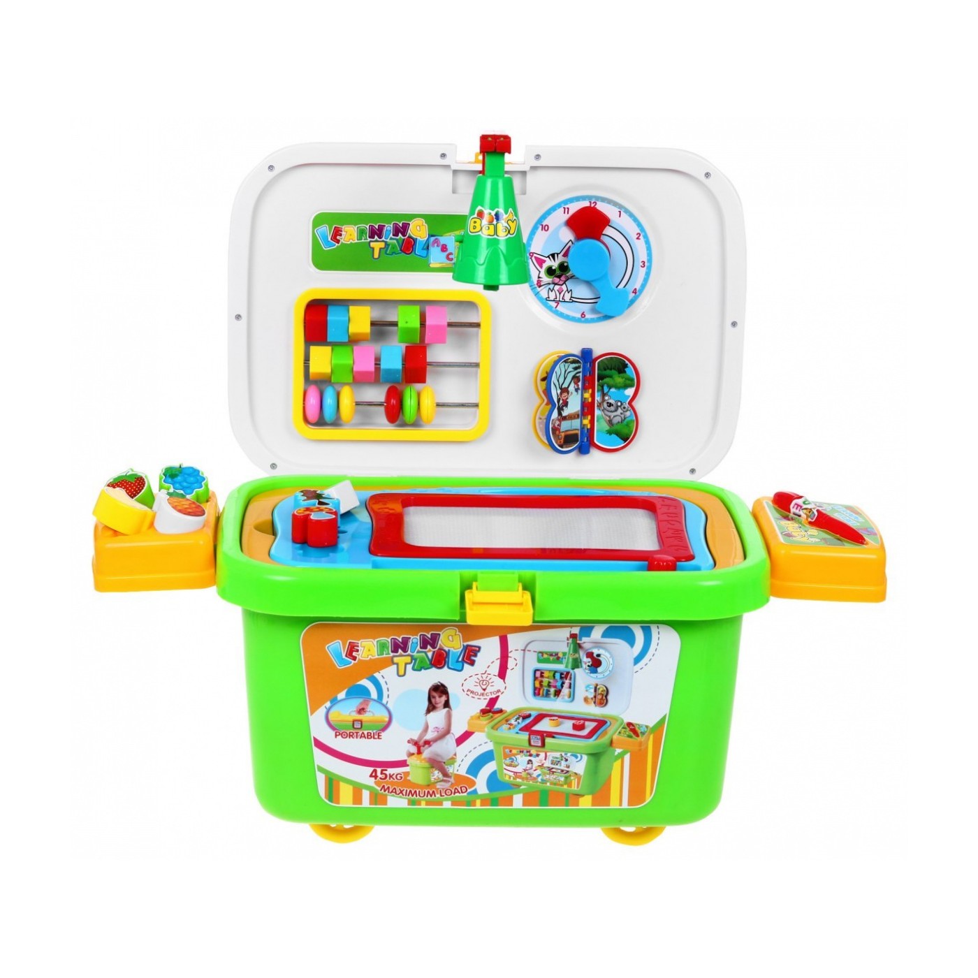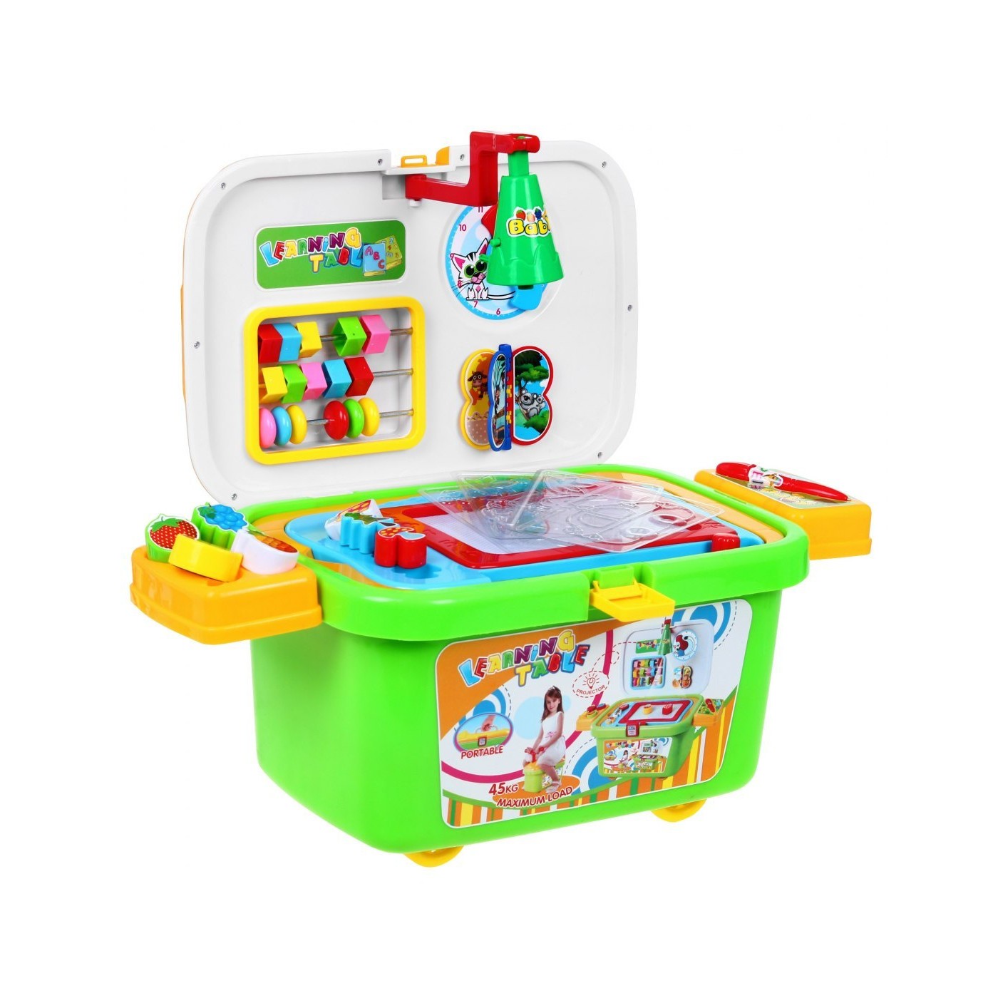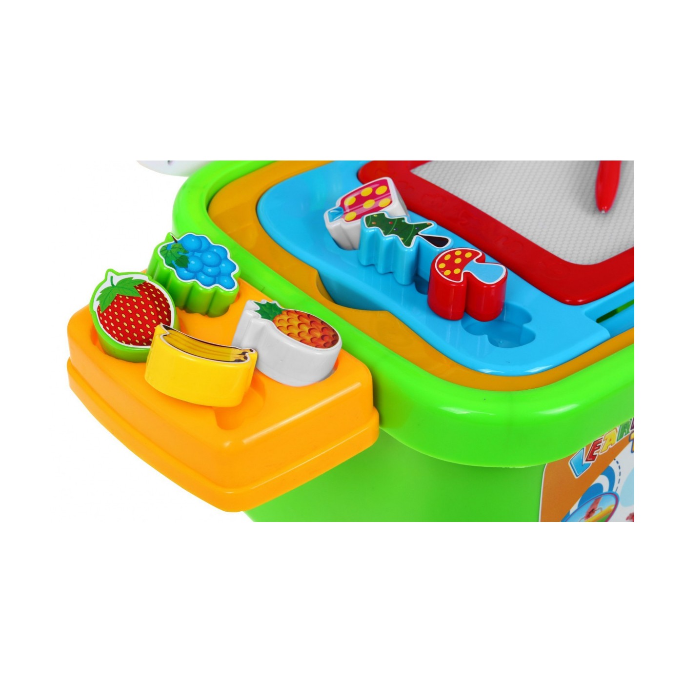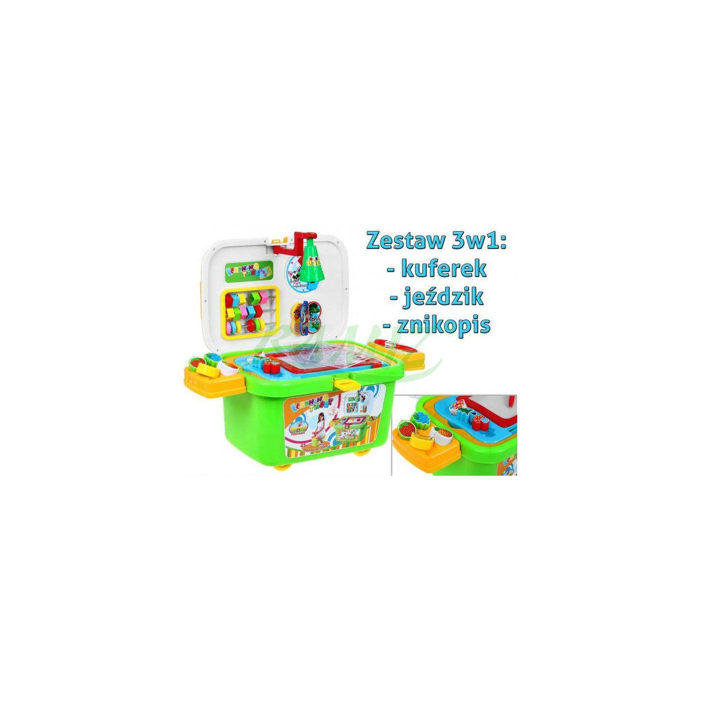 | Zabawkę zaprojektowano z myślą o najmłodszych pociechach, dlatego też pudełko ma żywe, przyjemne dla oka kolory, a poszczególne elementy posiadają dodatkowe barwne dekoracje. Kuferek jest pełne niespodzianek. Gdy skrzynia się otworzy dziecko trafi do krainy czarów. Znajdziemy tu miedzy innymi: - przenośny znikopis, po którym można pisać, malować, odbijać pieczątki, - duże kolorowe liczydło, - zegar, - 7 sztuk pieczątek, - naklejki, aby jeszcze bardziej ozdobić kolorowe pudełko, - 4 szablony ze wzorami do odrysowywania, - lampka - projektor, zasilana bateriami typu AG13 (3 x 1,5V - dołączone do zestawu), - kierownicę, - dwie boczne półeczki z pojemnikami na pieczątki i długopis. Ta wielofunkcyjna zabawka jednocześnie rozwija wyobraźnię, koncentrację i koordynację ruchową malucha. Jednocześnie uczy i bawi - nauka poprzez kreatywną zabawę. Poprzez zabawę maluch uczy się logicznego myślenia, rozpoznawania kolorów i kształtów. Ćwiczy zdolności manualne, uczy się łączenia kolorów, poznaje litery, cyfry oraz symbole matematyczne.