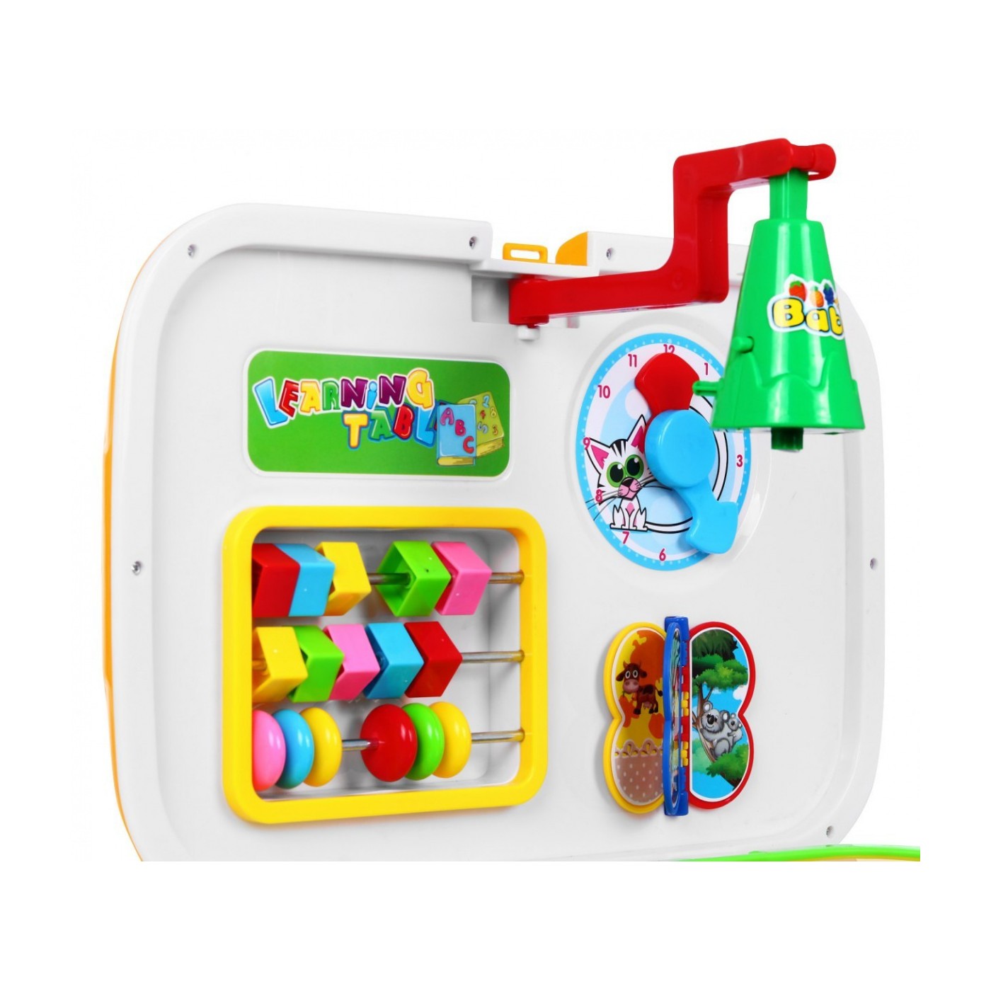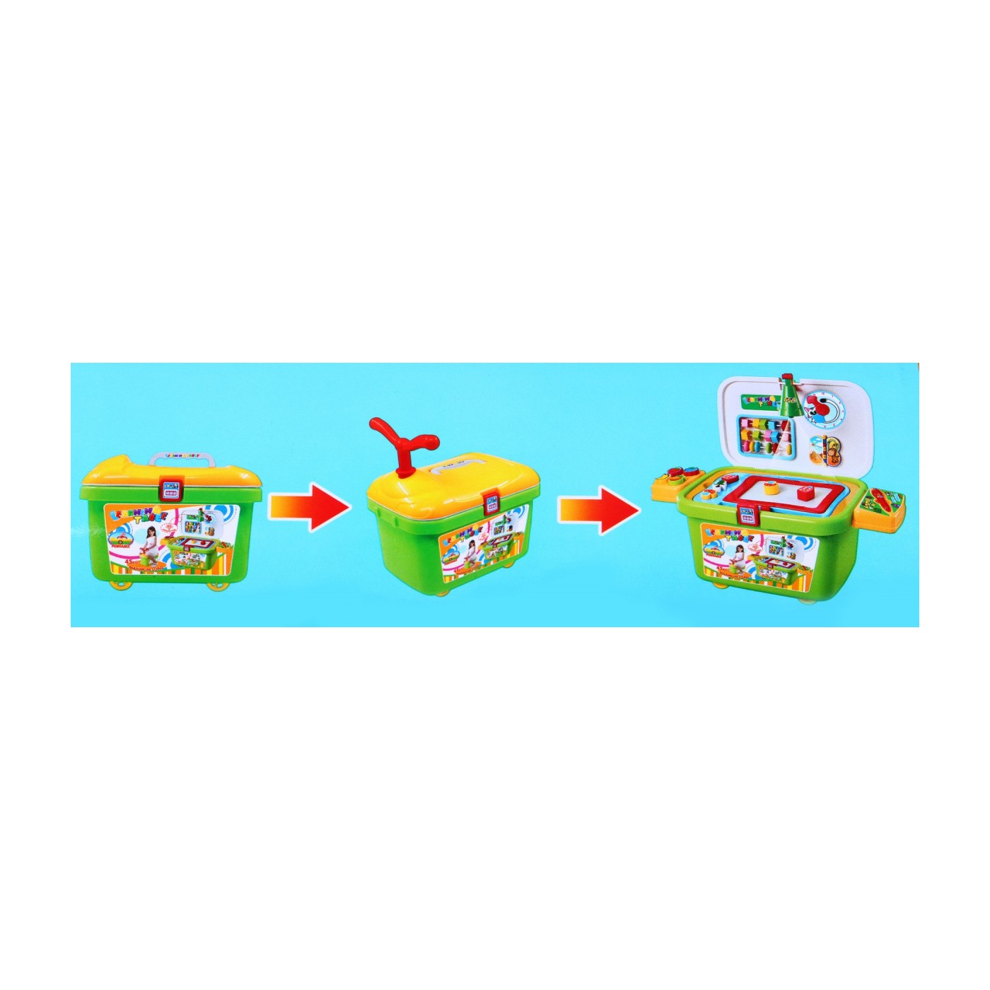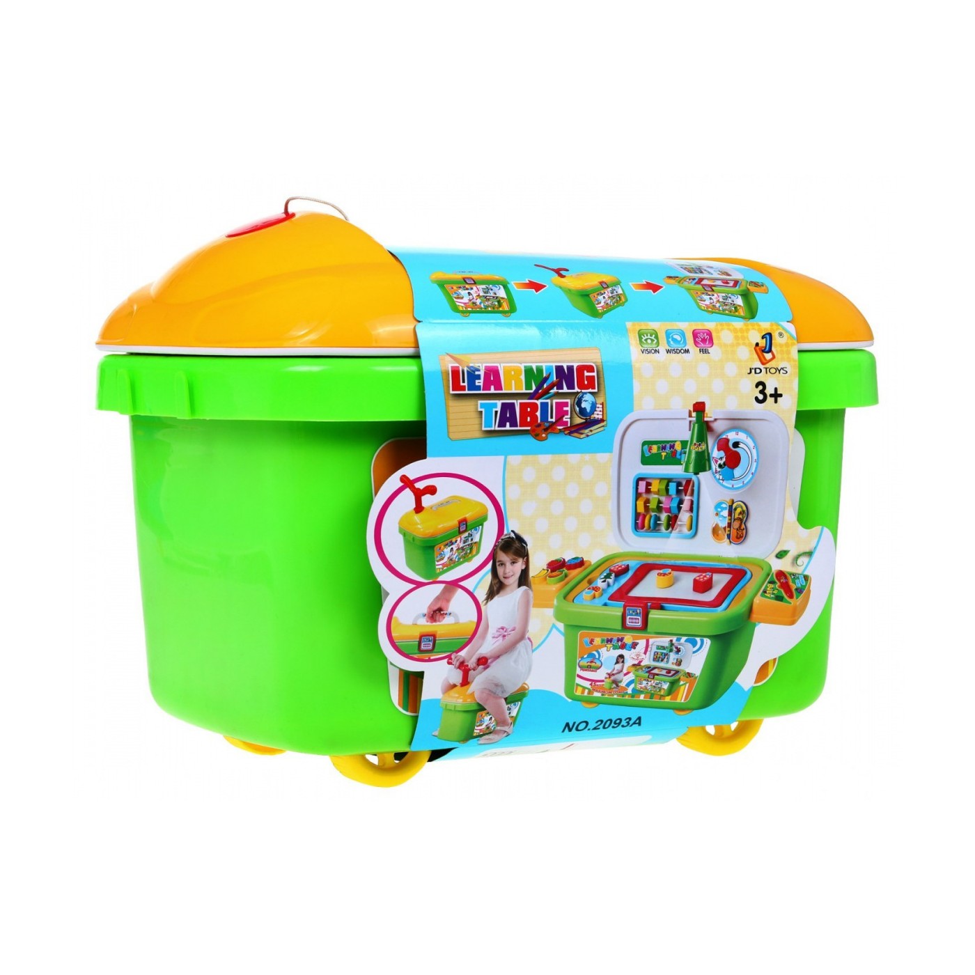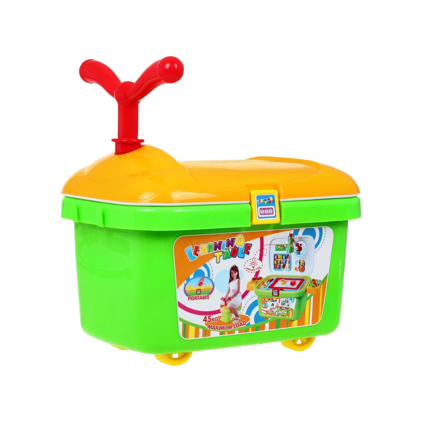 | Zabawkę zaprojektowano z myślą o najmłodszych pociechach, dlatego też pudełko ma żywe, przyjemne dla oka kolory, a poszczególne elementy posiadają dodatkowe barwne dekoracje. Kuferek jest pełne niespodzianek. Gdy skrzynia się otworzy dziecko trafi do krainy czarów. Znajdziemy tu miedzy innymi: - przenośny znikopis, po którym można pisać, malować, odbijać pieczątki, - duże kolorowe liczydło, - zegar, - 7 sztuk pieczątek, - naklejki, aby jeszcze bardziej ozdobić kolorowe pudełko, - 4 szablony ze wzorami do odrysowywania, - lampka - projektor, zasilana bateriami typu AG13 (3 x 1,5V - dołączone do zestawu), - kierownicę, - dwie boczne półeczki z pojemnikami na pieczątki i długopis. Ta wielofunkcyjna zabawka jednocześnie rozwija wyobraźnię, koncentrację i koordynację ruchową malucha. Jednocześnie uczy i bawi - nauka poprzez kreatywną zabawę. Poprzez zabawę maluch uczy się logicznego myślenia, rozpoznawania kolorów i kształtów. Ćwiczy zdolności manualne, uczy się łączenia kolorów, poznaje litery, cyfry oraz symbole matematyczne.
