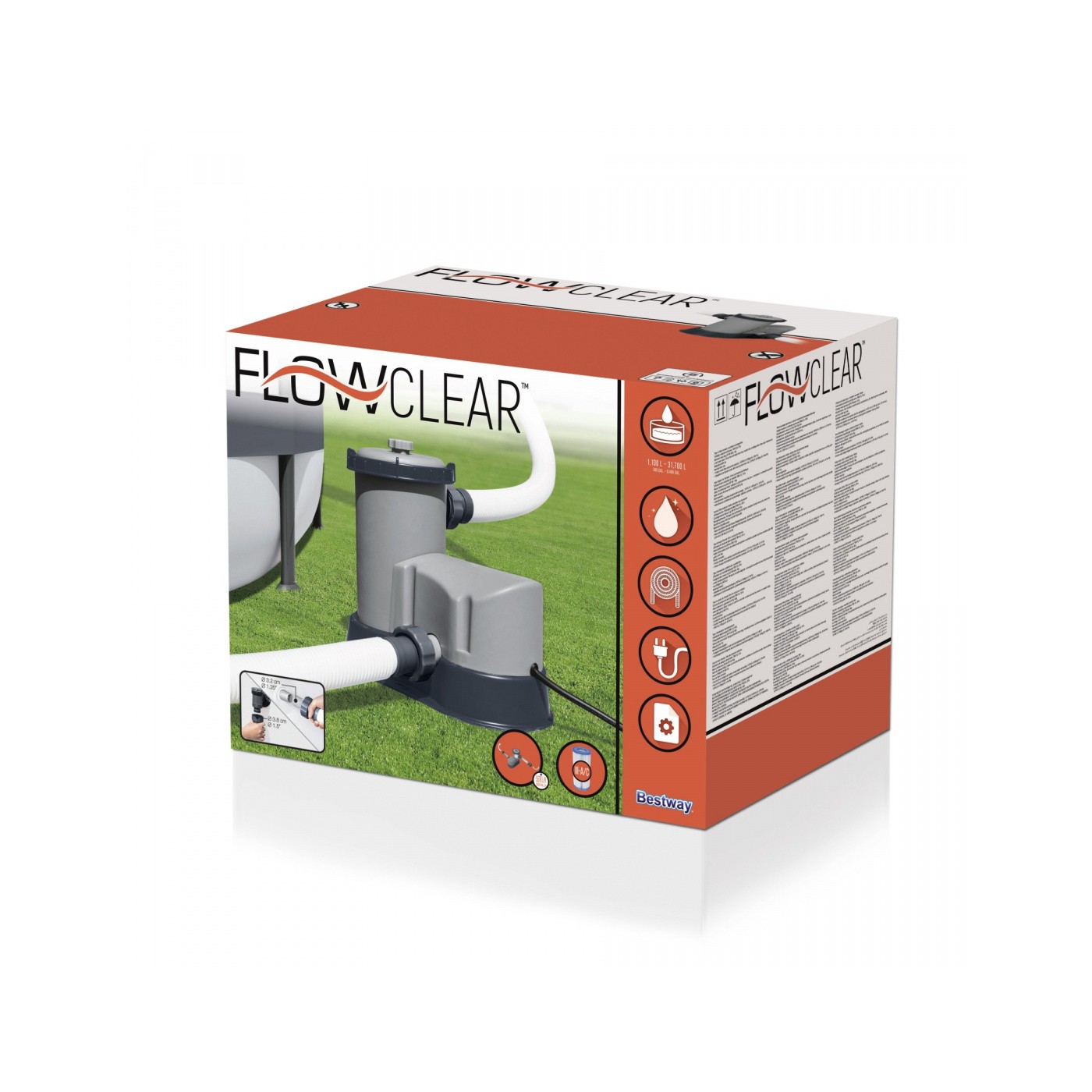 Pompa filtrująca FLOWCLEAR™ 5678L/h - 1500gal/h [58389] Specyfikacja Wkład filtrujący Filtr 58012 [III] Średnica węża 3,8cm / 1,5in. Adapter 3,2cm/3,8cm - 1,25in./1,5in. Wydajność pompy 5678L/h - 1500gal./h Przepływ wody w układzie 3974L/h - 1050gal./h Zalecana wielkość basenu 1100L - 31700L / 300gal. - 8400gal. Zasilanie 220-240V~, 86W Zawartość zestawu - pompa,