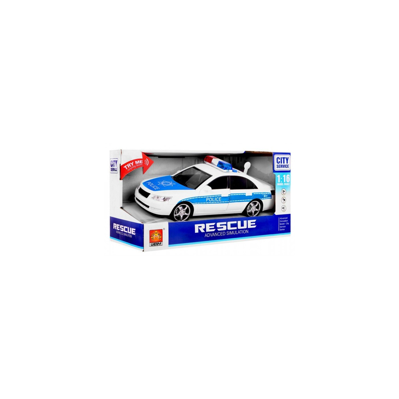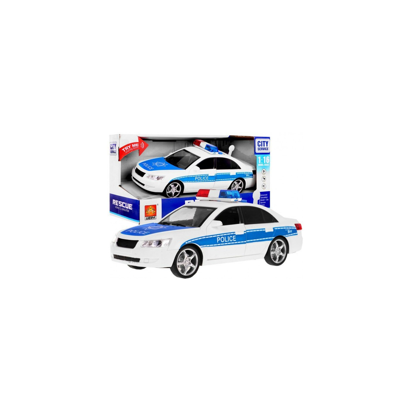 | Opis | AUTKO POLICJA pojazd z dźwiękami - otwierane drzwi + migający kogut (WY560A) |