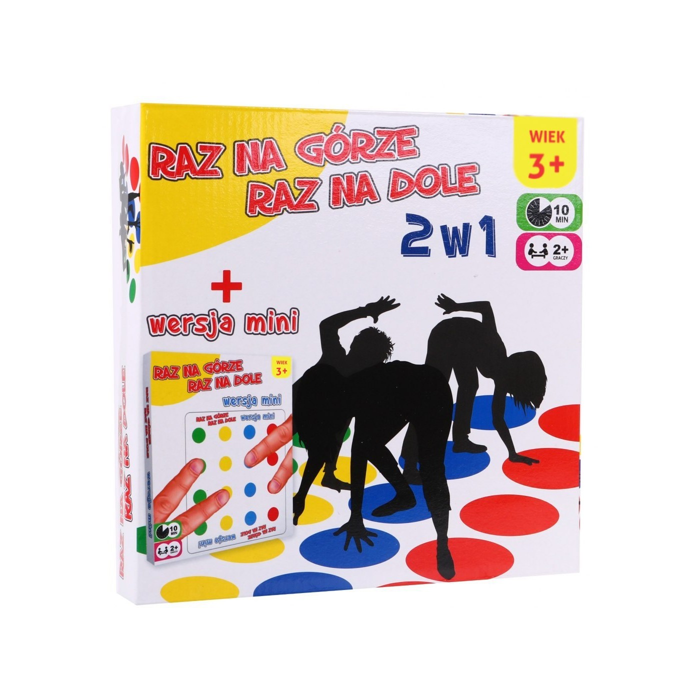 | Gra idealnie łączy gimnastykę ze świetną zabawą! Sędzia kręci strzałką i wskazuje kolor, na który trzeba przenieść stopę lub dłoń. Głównym zadaniem będzie utrzymanie równowagi stając na rękach i stopach na coraz to innych kolorowych polach maty, nie jest to takie proste w bliskim towarzystwie innych graczy. Mata dostarczy Waszym pociechom mnóstwo zabawy w trakcie której usprawnią swoje mięśnie, poprawią zwinność, giętkość i elastyczność. Jeśli gra więcej niż dwóch graczy, gra stanie się jeszcze ciekawsza. W takim przypadku, można wykonywać ruchy na zmianę – będzie trudniej i ciekawiej. Gdy gra więcej osób można podzielić się na drużyny. Każda odmiana i pomysł urozmaici tylko rozgrywkę. Zasady gry Raz na górze raz na dole: 1. Zadaniem graczy jest umieszczanie ręki lub nogi (a konkretnie dłoni lub stopy) na wskazanym przez wskazówki polu. Pole zajmuje gracz, który jako pierwszy je zajął. Jeśli nie możecie ustalić, kto był pierwszy, decyduje o tym sędzia. Decyzja sędziego jest ostateczna i nieodwołalna. 2. Po wykonaniu swojego ruchu nie można się już poruszać. Tylko sędzia może pozwolić zawodnikowi na przesunięcie jednej kończyny, tak aby inny gracz mógł przestawić swoją. 3. Jeśli wszystkie sześć pól w jednym kolorze jest zajęte, zakręćcie strzałką jeszcze raz. 4. Jeśli sędzia podaję rękę/nogę i kolor, na którym właśnie stoisz, musisz przenieść się na inne pole w tym samym kolorze (jeśli wszystkie są zajęte, zakręć strzałką jeszcze raz). 5. Jeśli oprzesz się na macie łokciem lub kolanem, albo upadniesz na matę – odpadasz z gry ! 6. Wygrywa ten, kto najdłużej utrzyma się na macie !!! Zasady gry Raz na górze raz na dole mini: 1. Zakręć wskaźnikiem, który znajduje się na tarczy. 2. Wskazówka pokaże którego palca należy użyć oraz na który kolor go położyć. 3. Połóż palce zgodnie z informacją na tarczy, pamiętaj aby jak najbardziej utrudnić grę innym osobom. 4. Wygrywa ostatnia osoba, która zdoła utrzymać się na polu gry. 5. Do zestawu dodano dodatkowe naklejki, które urozmaicą grę. Naklejki należy nakleić zgodnie z ilością graczy. Przyklej po 2 naklejki stóp i 2 naklejki dłoni na paznokcie oraz zamiast tarczy do wersji mini, użyj wersji standardowej. Gra przeznaczona jest dla dzieci od 5-go roku życia i posiada certyfikat CE. Liczba graczy 2+. | |