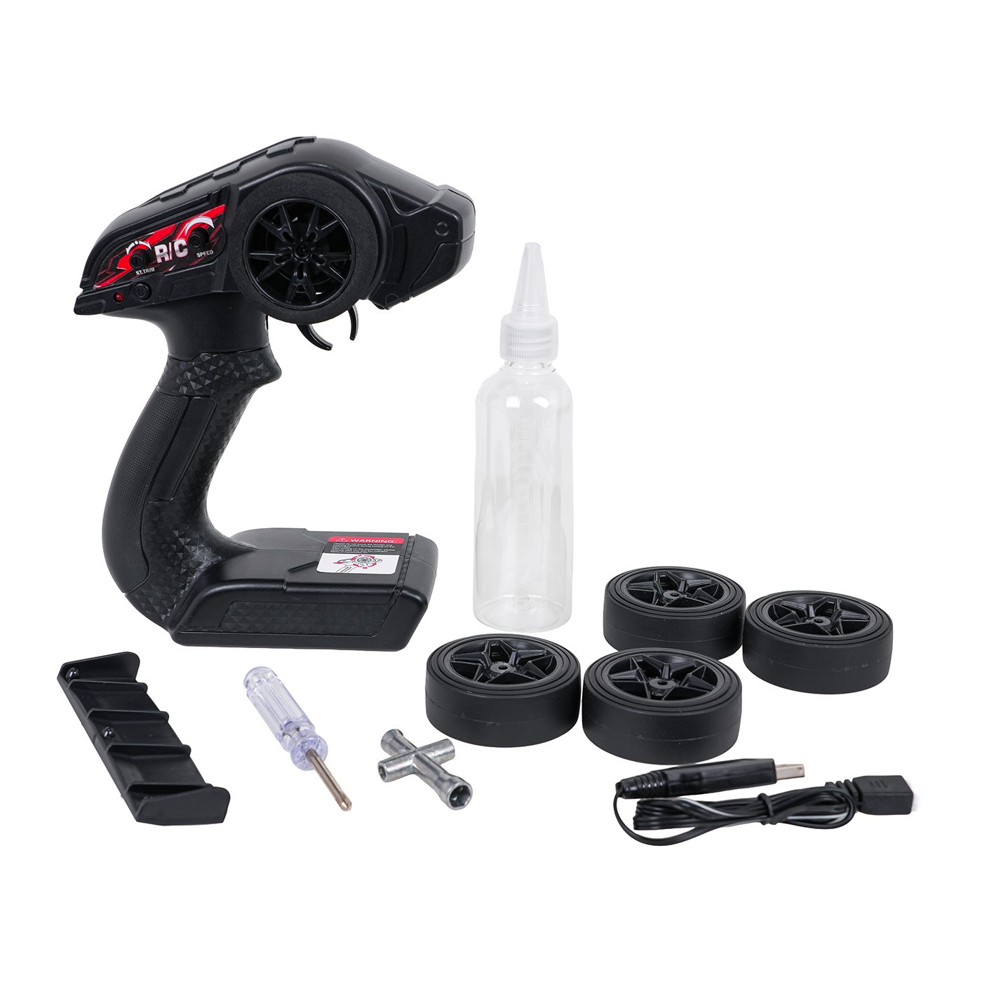 - pretekárske auto, - diaľkové ovládanie 2,4 GHz, - 7,4V batéria, - sada pneumatík s dezénom, - sadu driftových pneumatík, - Nabíjací kábel USB. - skrutkovač, - fľaša na vodu, - pokyny. |