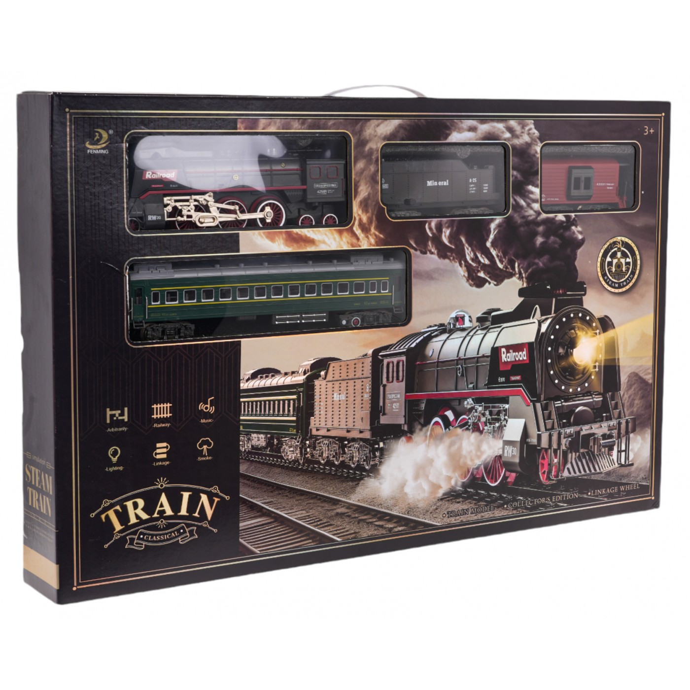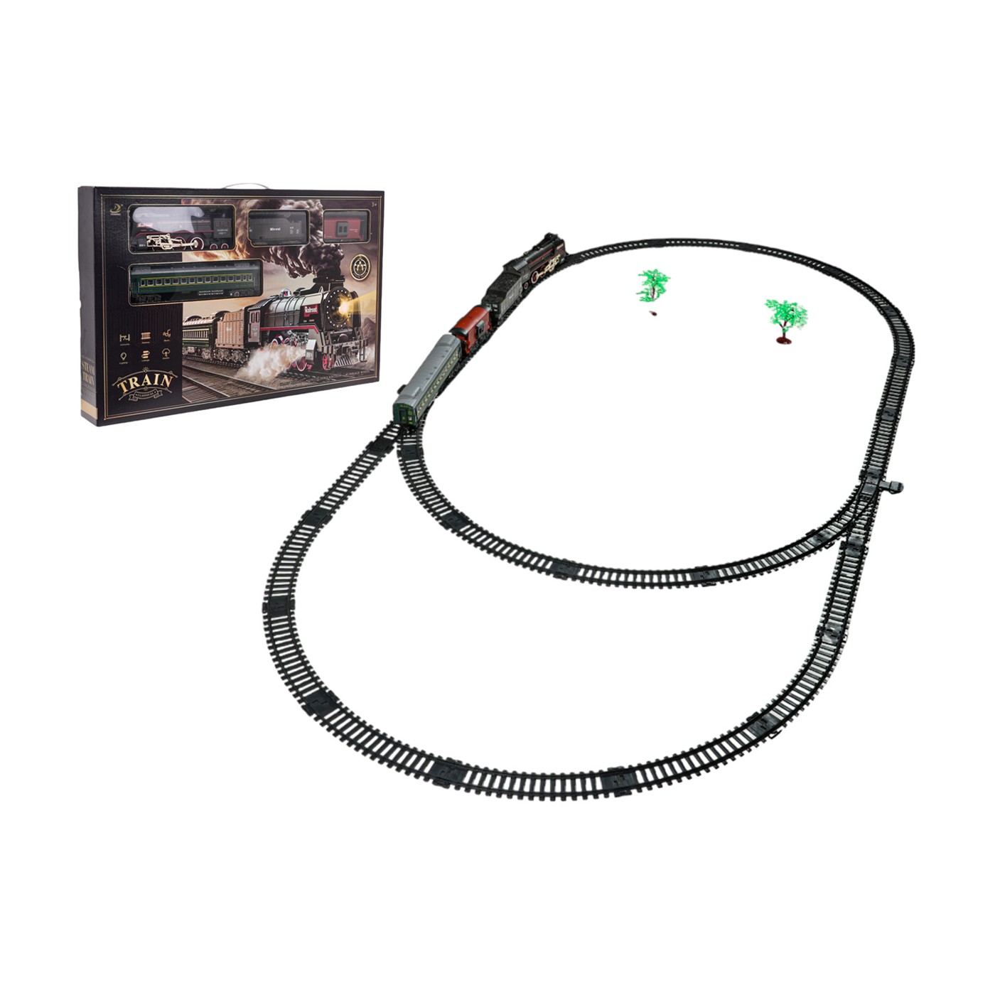 Retro súprava vláčika s dymovou funkciou a zvukmi jazdy, ako aj dráhami, ktoré sú súčasťou súpravy, je vhodná pre deti od 3 rokov. Hračka je napájaná 3,7 V 1200 mAh batériou (súčasťou balenia). Počas jazdy lokomotíva vypúšťa dym z komína a po stranách (po naplnení vodou - súčasťou súpravy je aj vodná pipeta a svieti aj svetlo inštalované v prednej časti. Koľaje sa jednoducho spájajú, vďaka čomu sú bezpečné a odolné pri používaní.