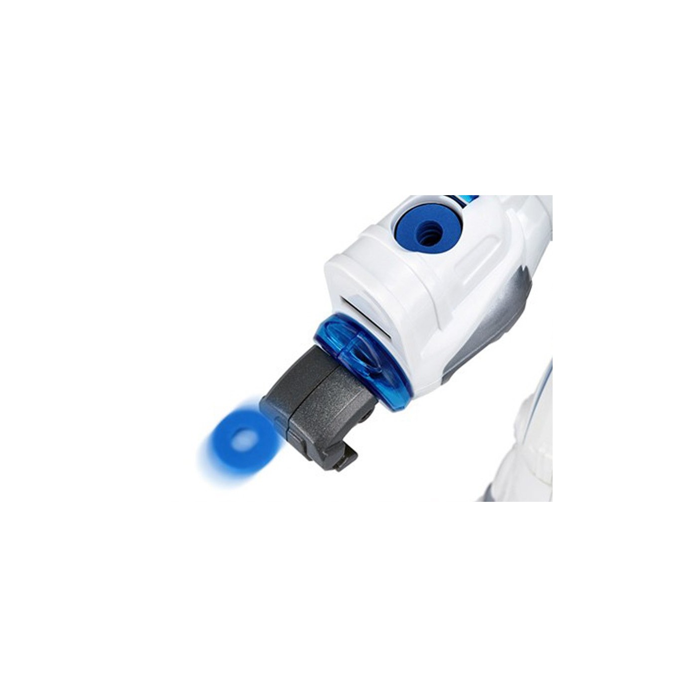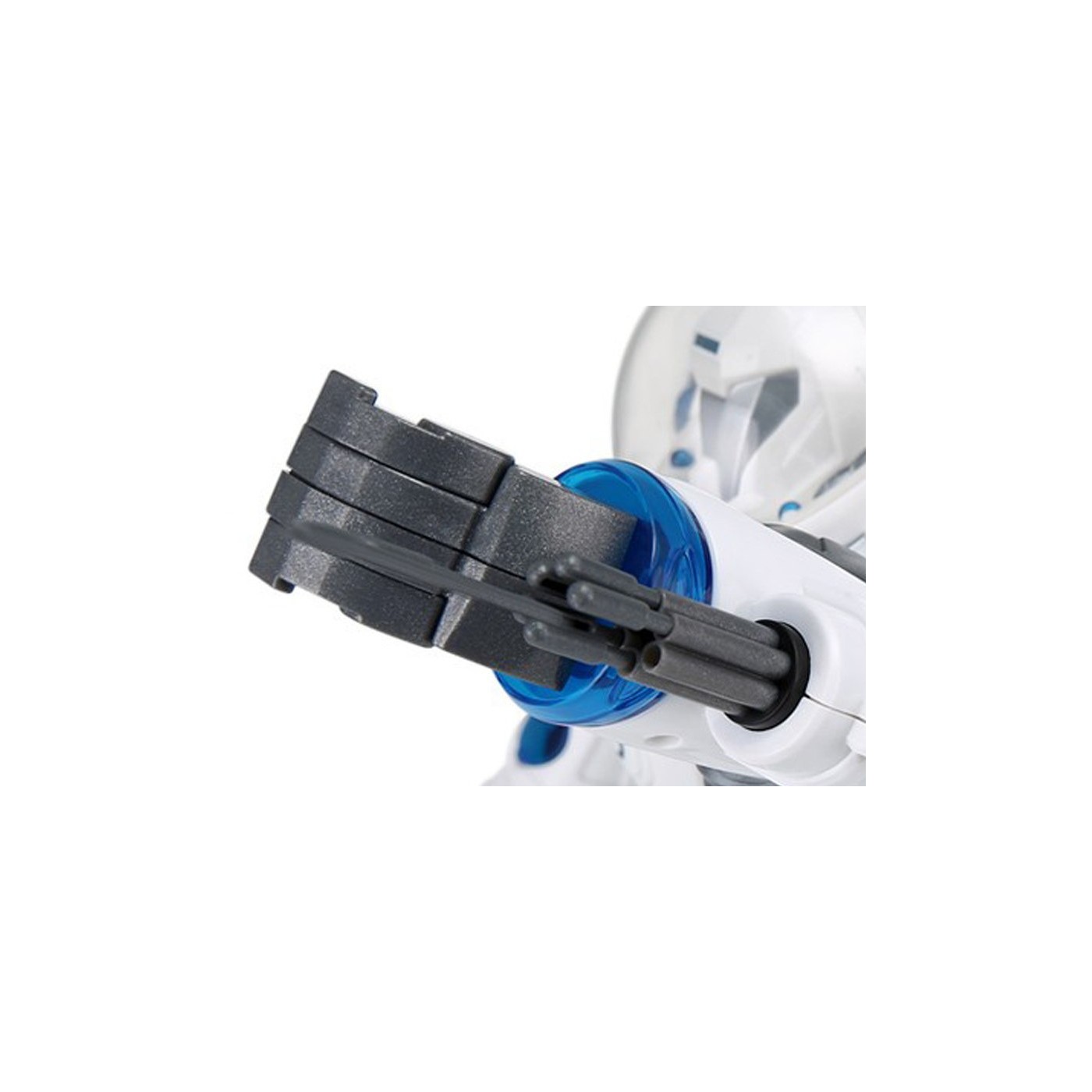 | Funkcje robota | - mówi, - tańczy, - świeci, - strzela z lewej ręki 6 pociskami, - strzela z prawej ręki 3 dyskami, - chodzi, - jeździ – napędzany 4 rolkami (po 2 na każdej nodze), - rusza rękoma (góra/dół), - możliwość programowania własnych ruchów, - regulacja głośności, - oszczędność baterii – tryb uśpienia włącza się po pewnym czasie gdy zabawka nie jest używana, - włącznik ON/OFF znajduj się na plecach robota, - przycisk RESET znajduje się na przodzie robota. |