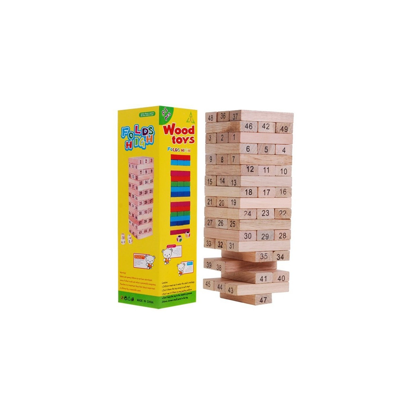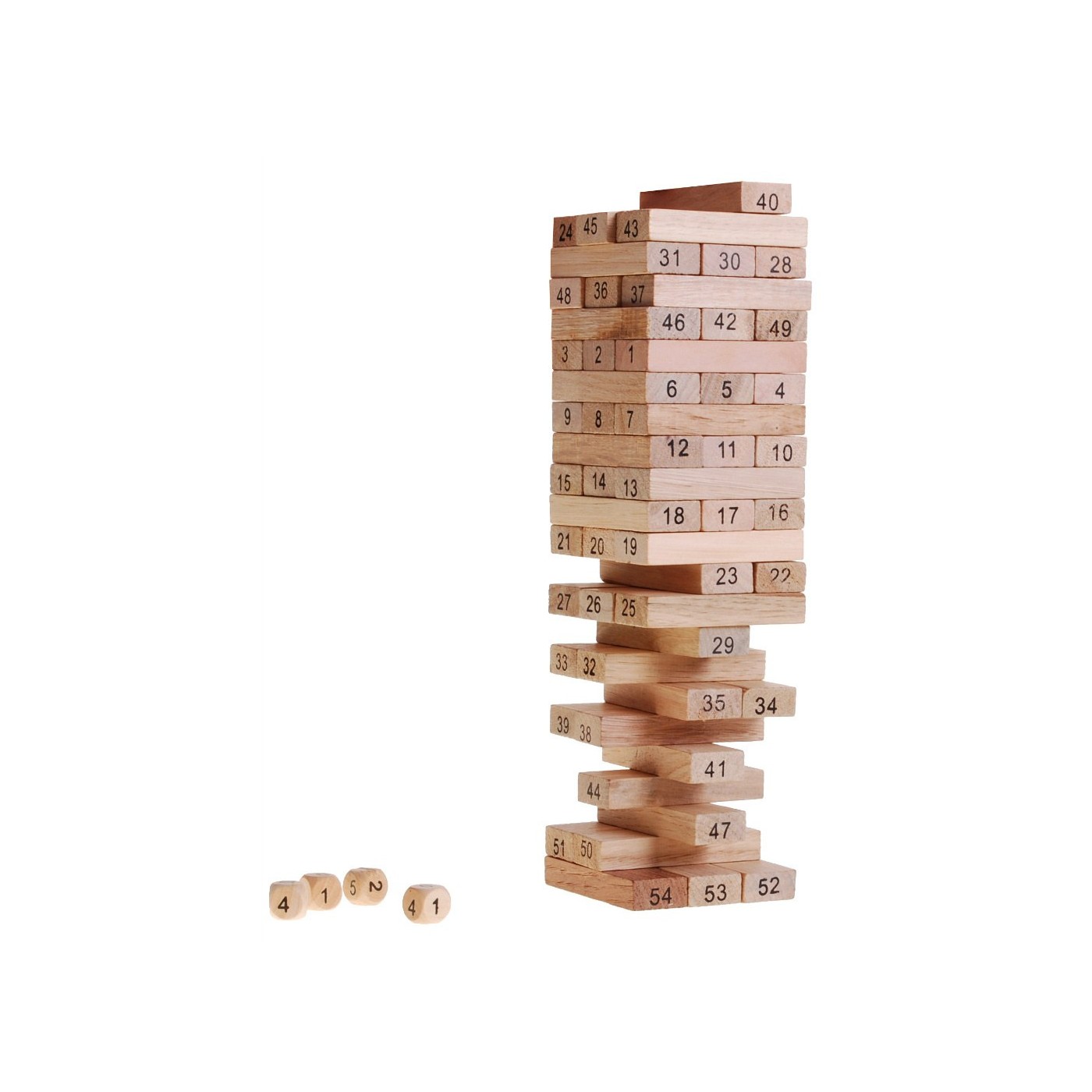 | Jeden z graczy buduje wieżę, której każde piętro składa się z trzech klocków. Do stworzenia stabilnej konstrukcji potrzebna jest twarda i równa powierzchnia. Każde piętro budowli składa się z trzech klocków, które układa się pod odpowiednim kątem naprzemiennie w stosunku do poprzedniego poziomu. Zasady gry możemy ustalić sami, poniżej proponujemy kilka wariantów: 1. Wariant pierwszy: zadaniem graczy jest naprzemienne wyciąganie po jednym klocku z dowolnego piętra wieży, który umieszczają następnie na szczycie wieży. W tym wariancie, nie używamy kostek do gry. 2. Wariant drugi: rzucając 4 kostki sumujemy liczby i wyciągamy klocek z liczbą jaką wyrzuciliśmy za pomocą kostek. Właściwy klocek umieszczamy następnie na szczycie wieży. Przy każdej operacji należy uważać, by nie zniszczyć całej konstrukcji. Ilość graczy: dowolna.