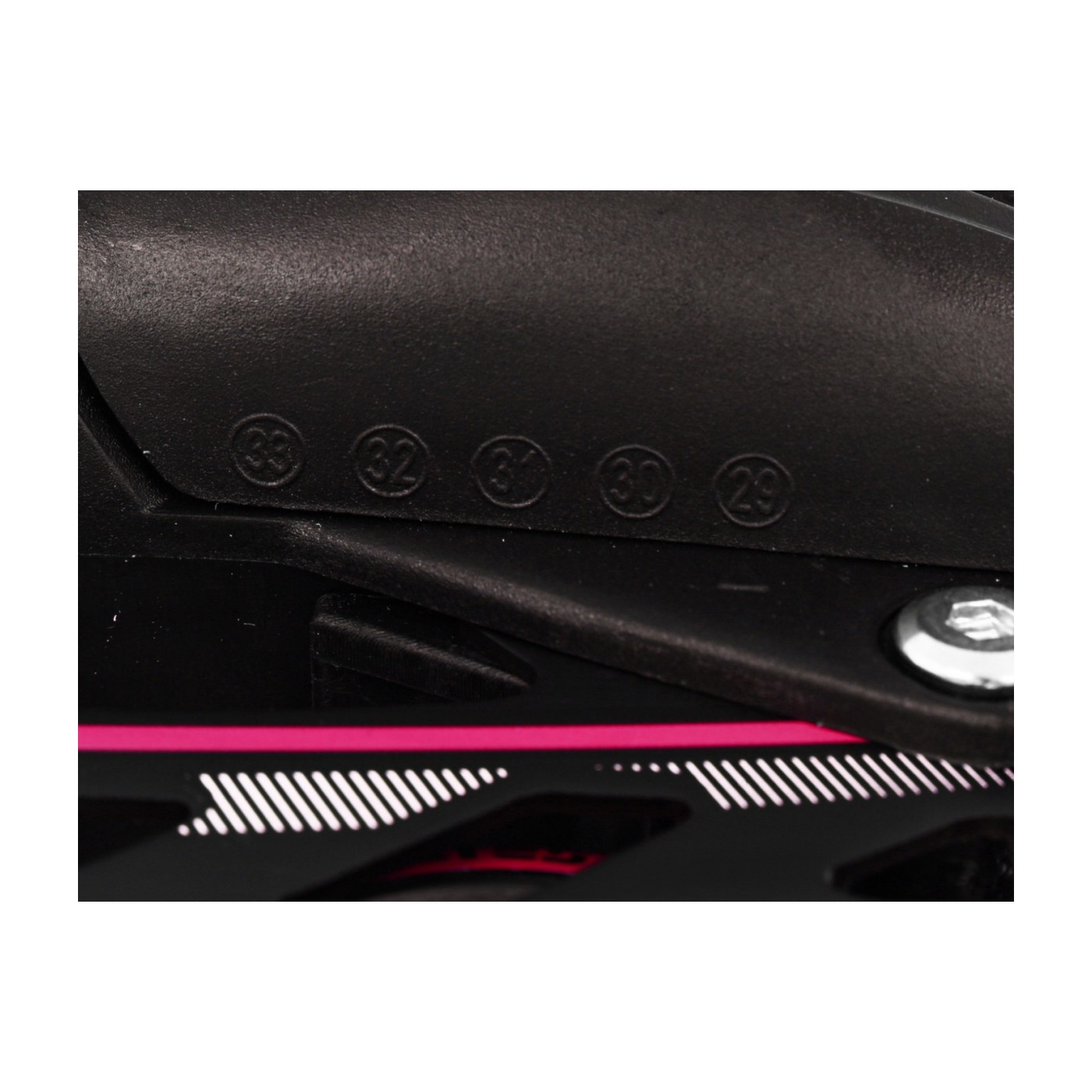 | Buty | - 5 stopniowy system regulacji rozmiaru za pomocą przycisku (29-33) - wewnętrzna długość buta od 16,5 cm do 20 cm, - półtwarda konstrukcja zapewniająca elastyczność buta i bezpieczeństwo kostki - zapięcie trzy sekwencyjne: - sznurowadła - pasek na rzep - klamra (regulacja + zabezpieczenie przed otwarciem) - hamulec w prawej rolce - system wentylacji - półprzepuszczalna membrana - wkładka profilowana - wkładka rolki wypełniona miękką pianką EVA pokryta zewnętrzna warstwą materiału Velvet |