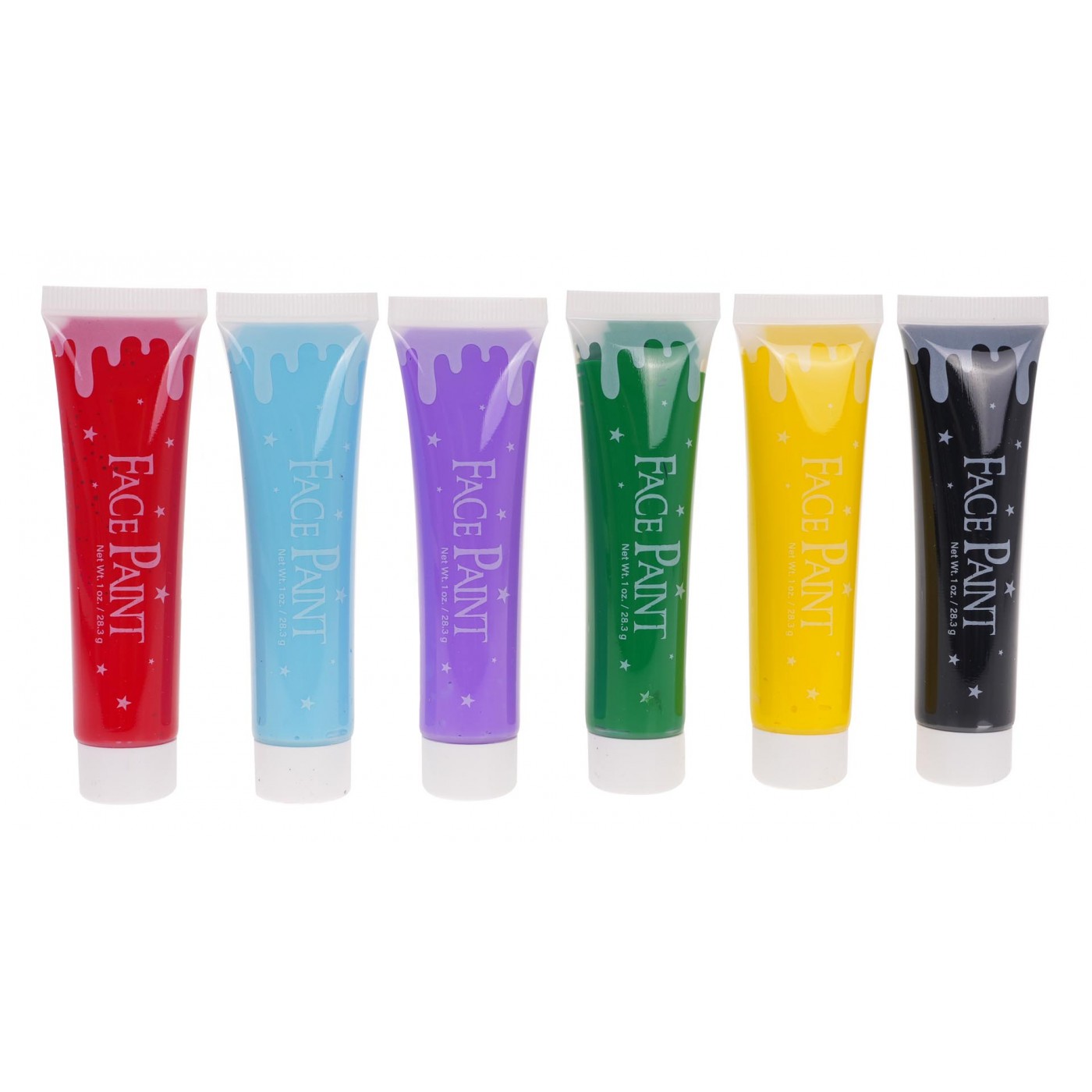 - 6 x farba na tvár v tube (čierna, žltá, zelená, fialová, modrá, červená). |