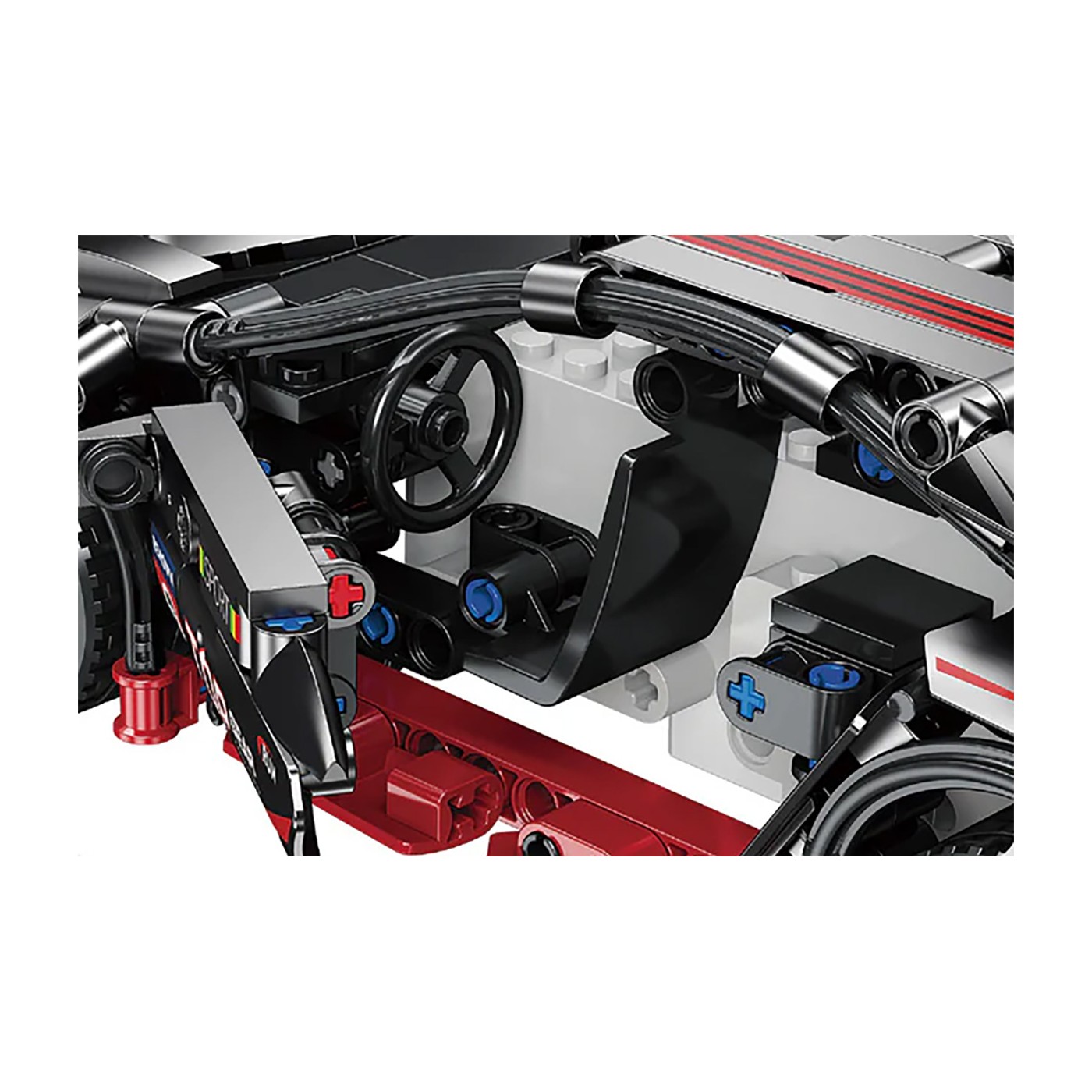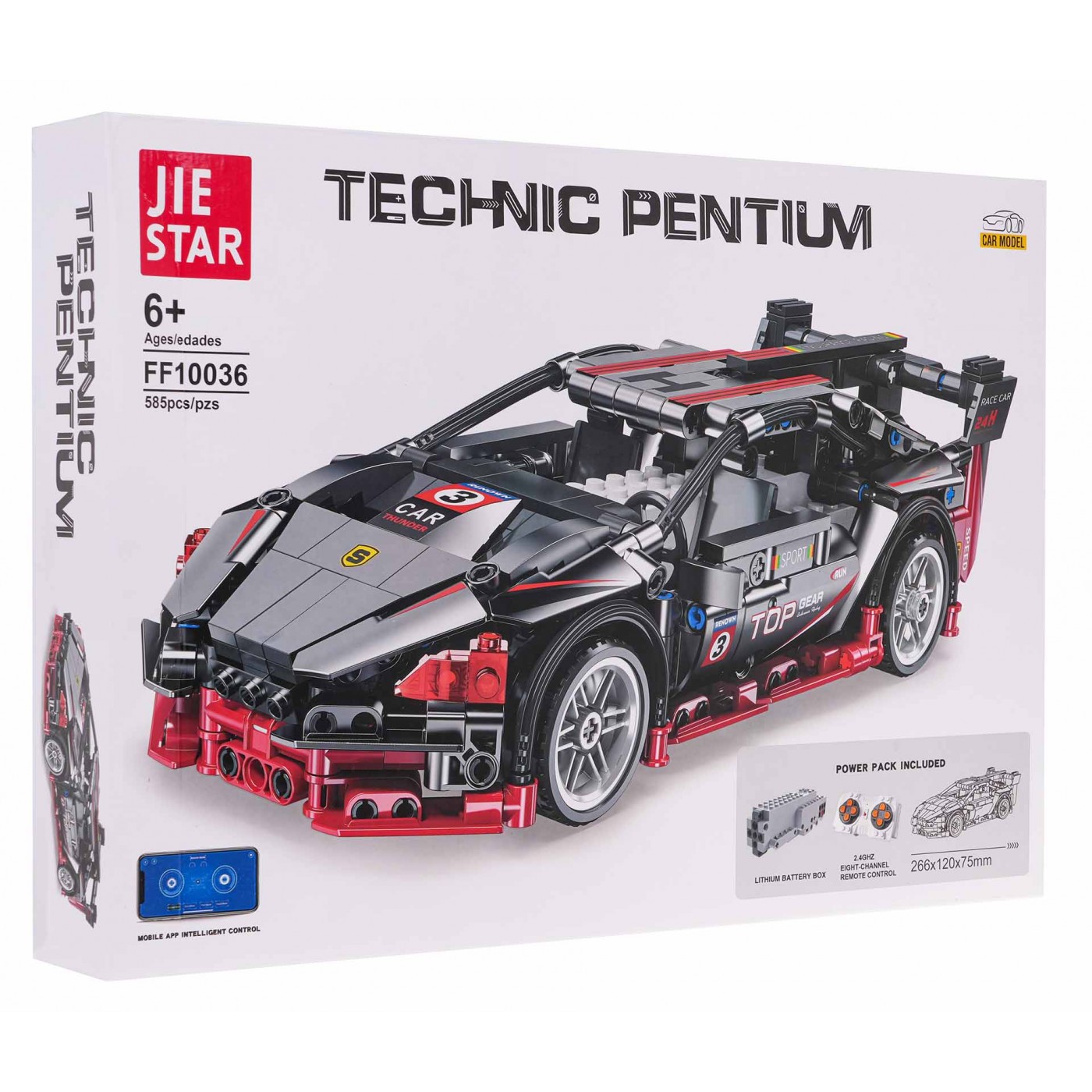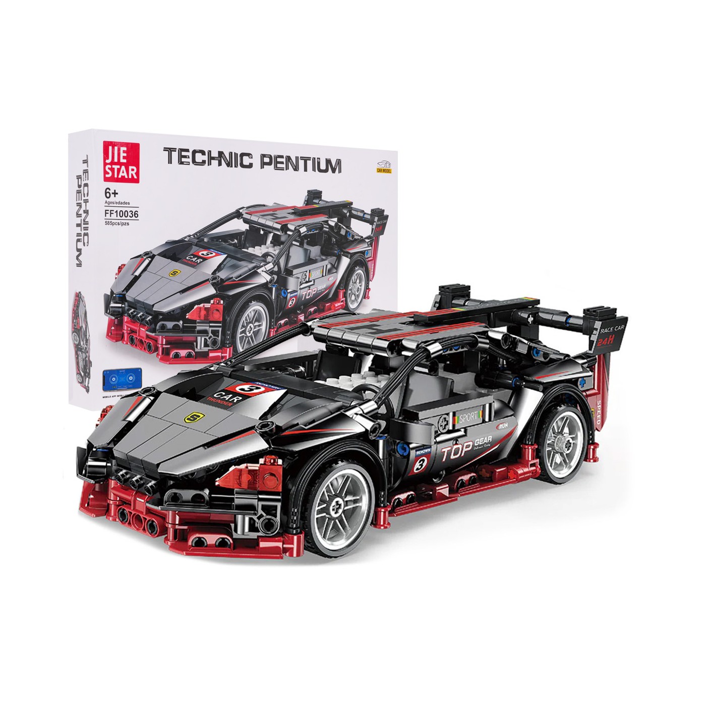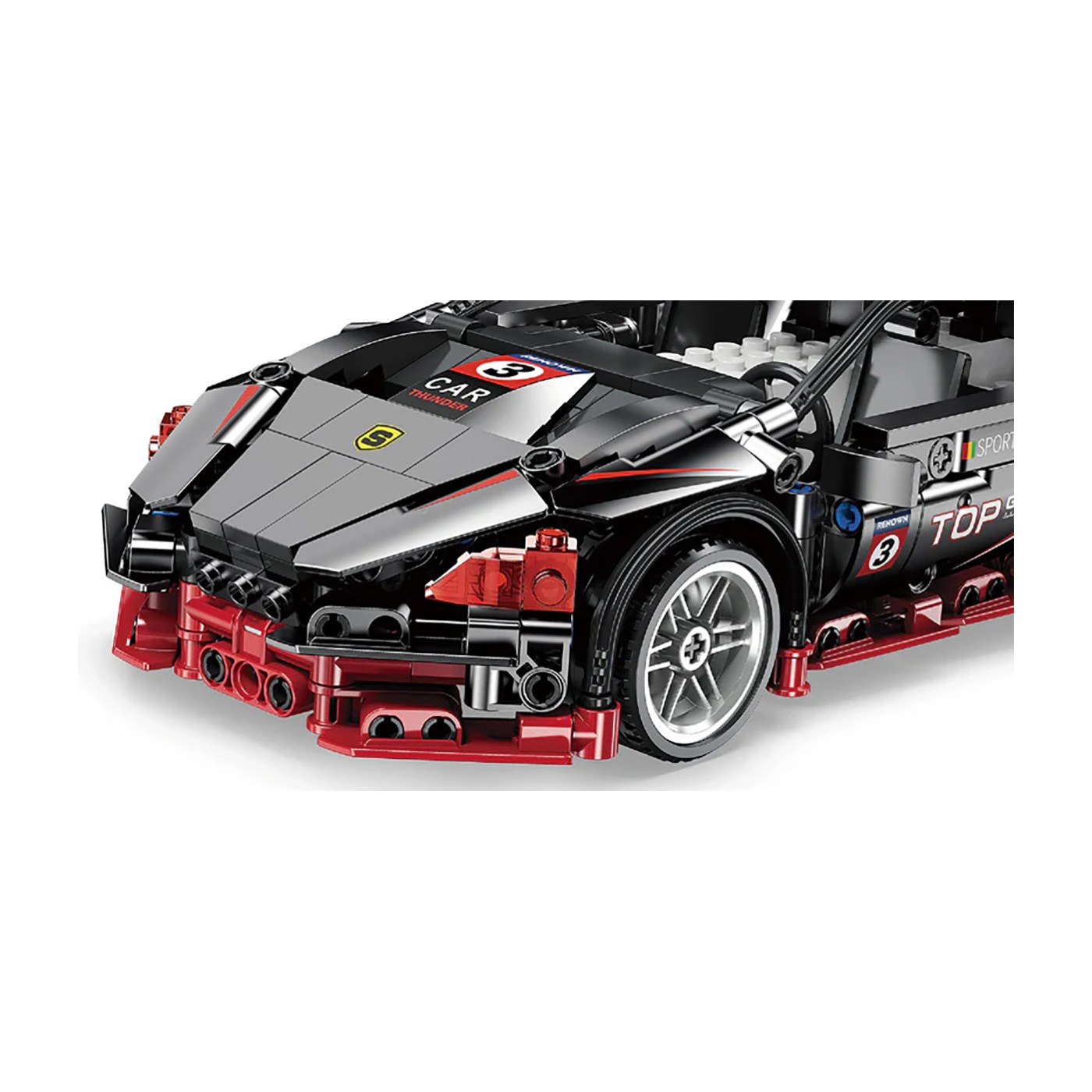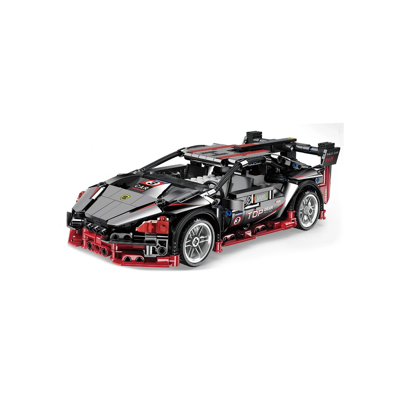 Sada 585 stavebných kociek na svojpomocnú stavbu čierneho športového auta s funkciou diaľkového ovládania. Hračka je určená pre deti od 6 rokov. Bloky a prvky auta sú vyrobené z vysoko kvalitného plastu. Auto má pohyblivé prvky, ako napríklad otváracie dvere.
