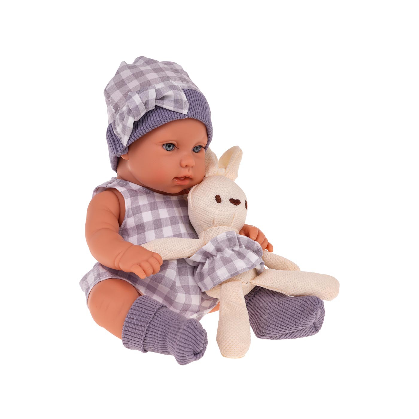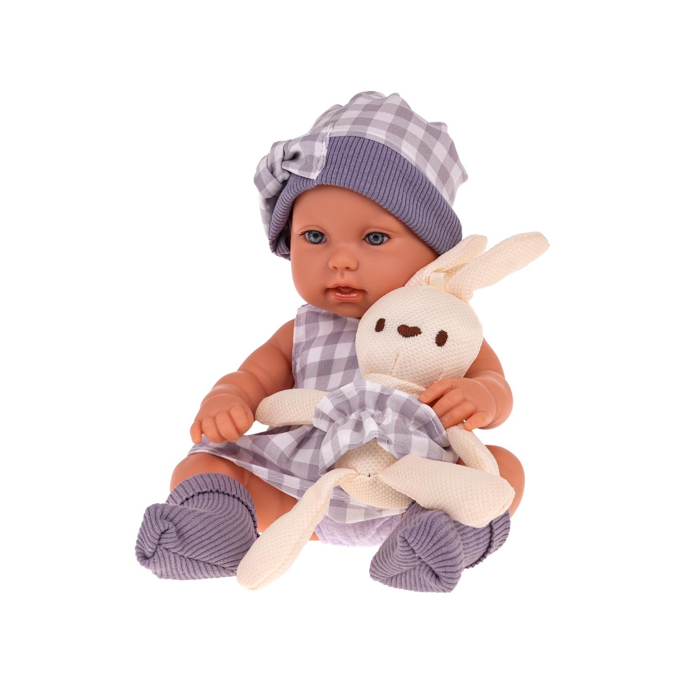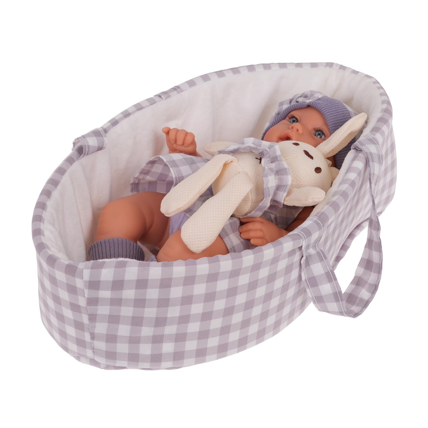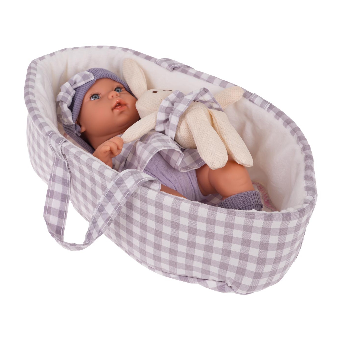 Set bábiky pre deti s príslušenstvom pre deti od 3 rokov. Súprava obsahuje krásne bábätko v šatách s plyšovým zajačikom a košíkom na prenášanie, aby si ho vaše dieťatko mohlo vziať kamkoľvek so sebou. Bábika je dokonale spracovaná, s dôrazom na každý detail a úplne bezpečná pre dieťa. Má odnímateľné šaty, čiapku, nohavičky a ponožky. Pohyblivé nožičky a rúčky uľahčujú obliekanie. Hračka stimuluje motorický vývoj dieťaťa.
