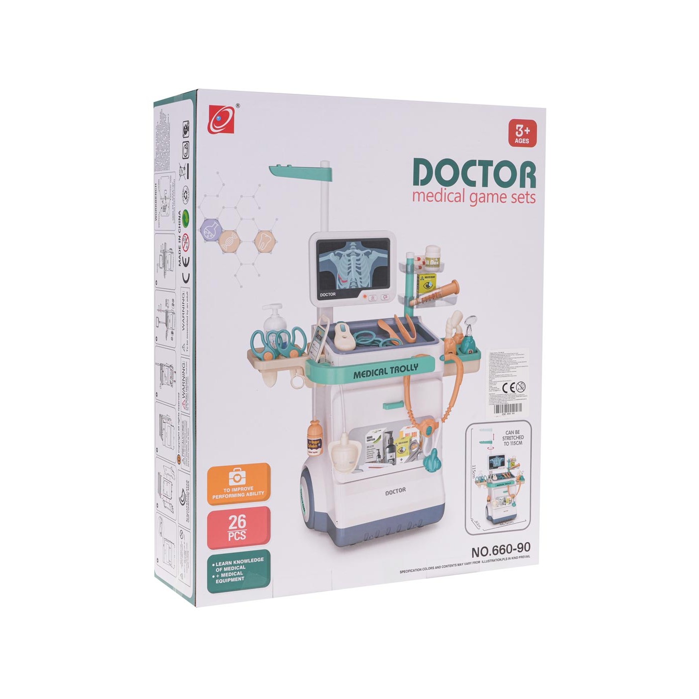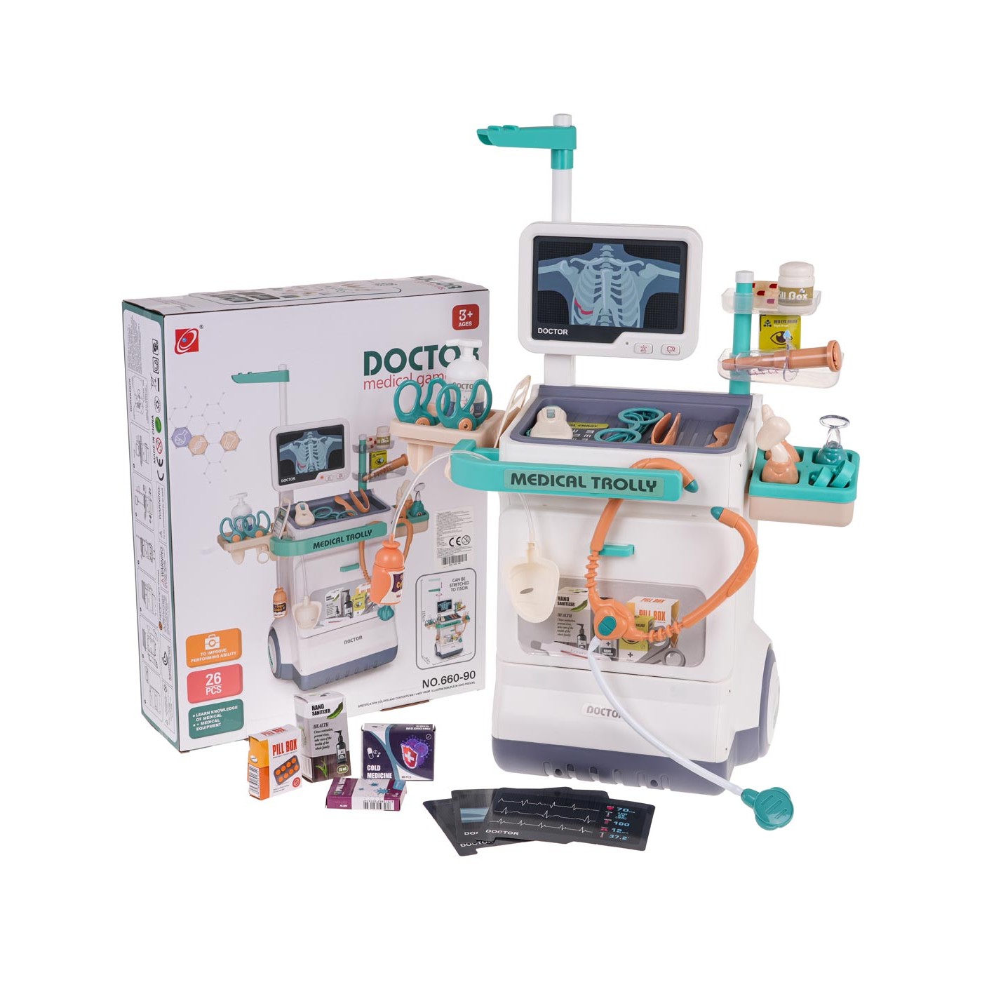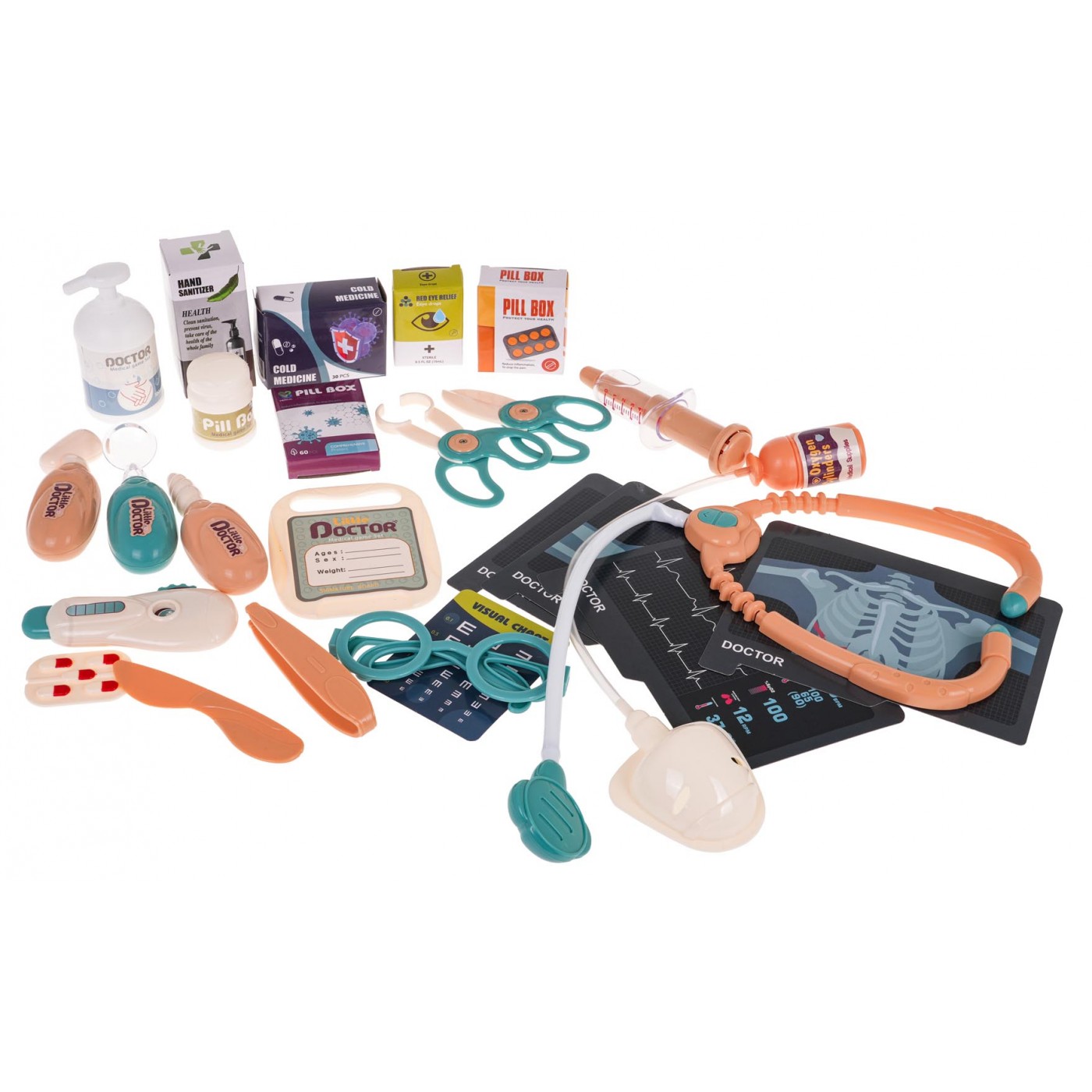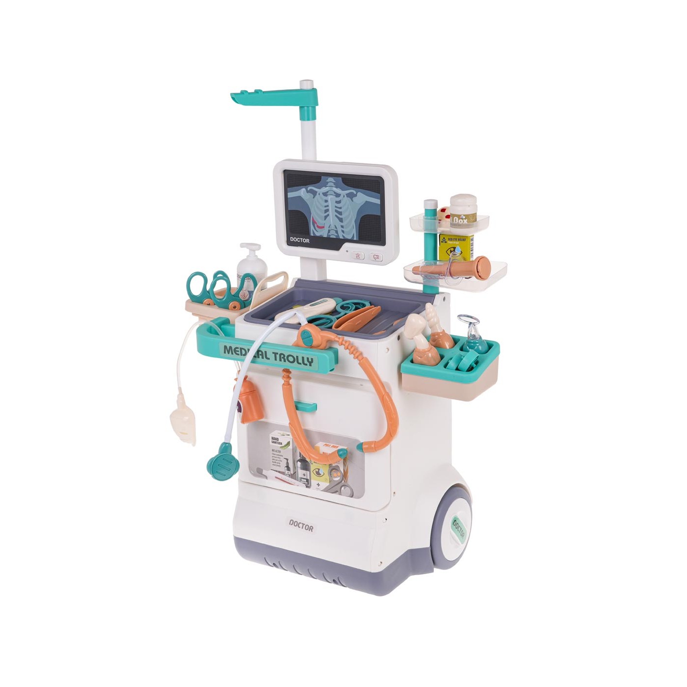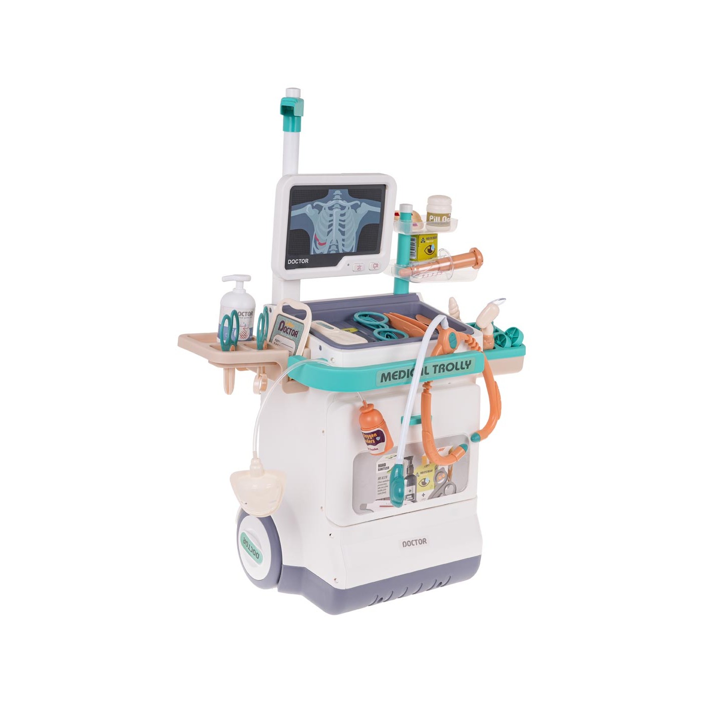 Interaktívna, bohato vybavená zdravotná súprava so zvukovými a svetelnými efektmi, pre deti od 3 rokov. Súprava pozostáva zo solídne vyrobeného ľahkého vozíka s veľkými kolesami a šikovnou rukoväťou a množstva lekárskych nástrojov. S touto sadou sa dieťa môže zahrať na lekára, očného lekára, kardiológa či zubára. Môžeme si vymieňať röntgenové alebo EKG fotografie a pomocou tlačidiel aktivovať tlkot srdca alebo zvuky budíka na monitorovacej obrazovke. Monitorovací panel je napájaný 2 x AAA 1,5 V batériami (nie sú súčasťou balenia).