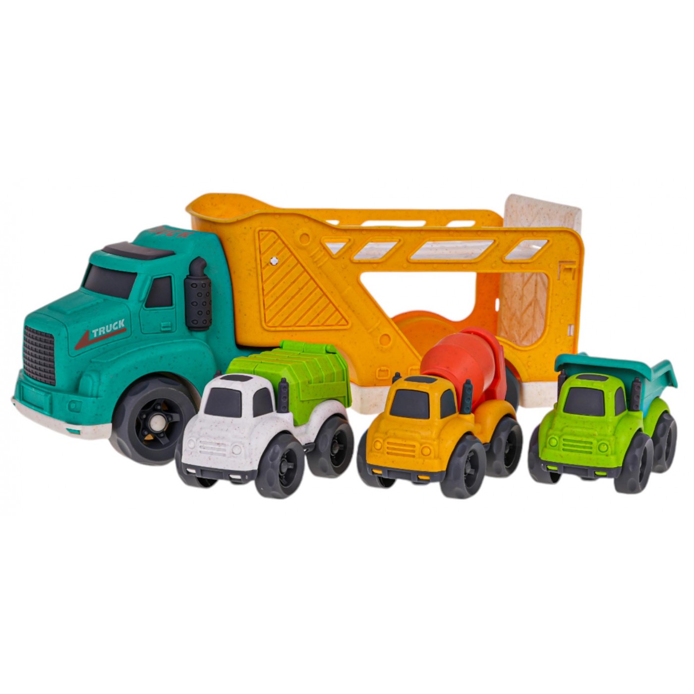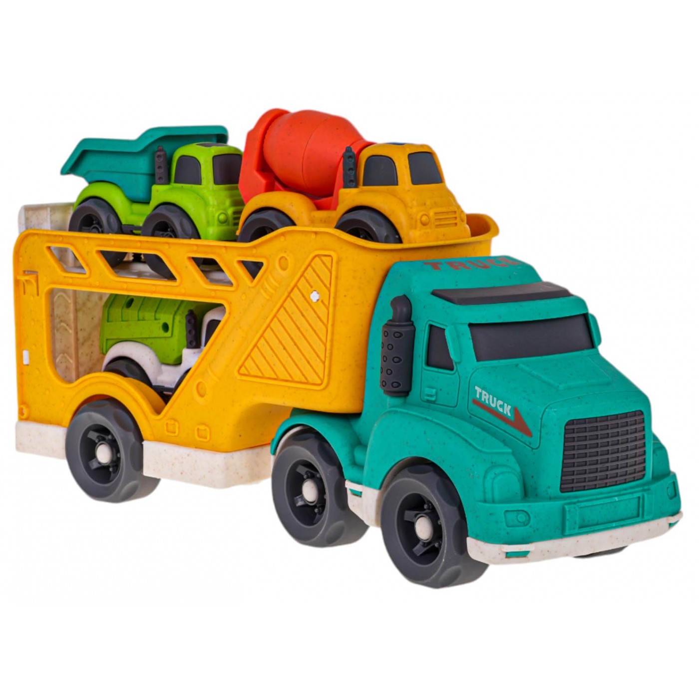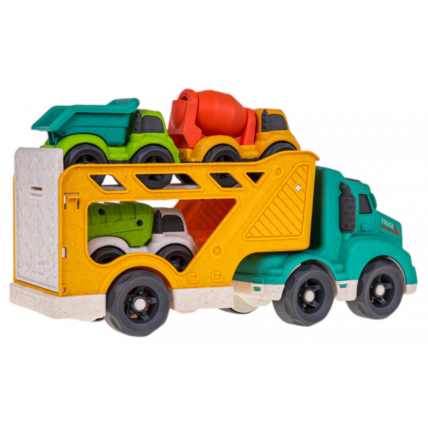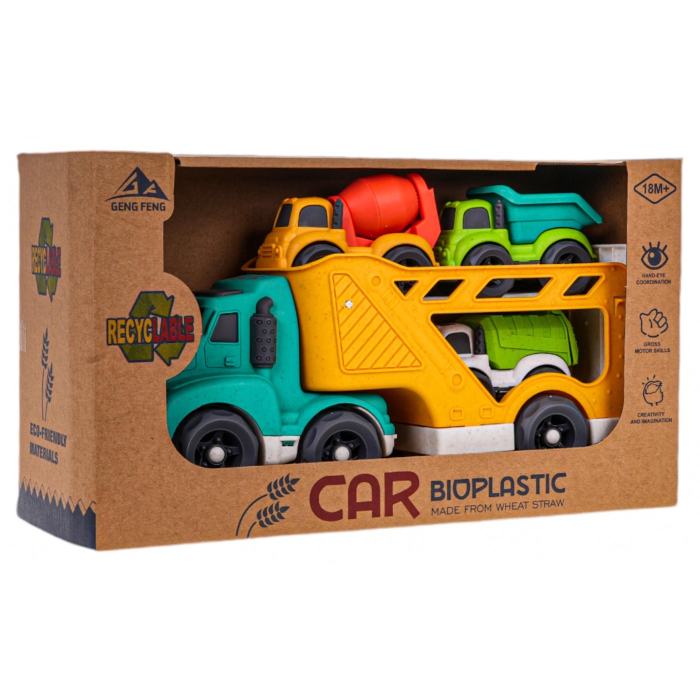 Sada vozidiel z bioplastu pre deti od 18 mesiacov. Súprava pozostáva z veľkého prívesu s pohyblivou plošinou a áut. Ekologický plast je bezpečný pre deti a šetrný k životnému prostrediu. Vozidlá sú farebné, odolné a odolné voči poškodeniu a majú pohyblivé časti. V domiešavači betónu môžeme ručne otáčať betónovou žiarovkou, v sklápači môžeme zdvíhať a spúšťať príves a v smetiarskom aute môžeme otvárať zadné poklop vozidla. Bábätko môže tiež ručne pohybovať vozidlom po zemi vďaka pohyblivým kolieskam.