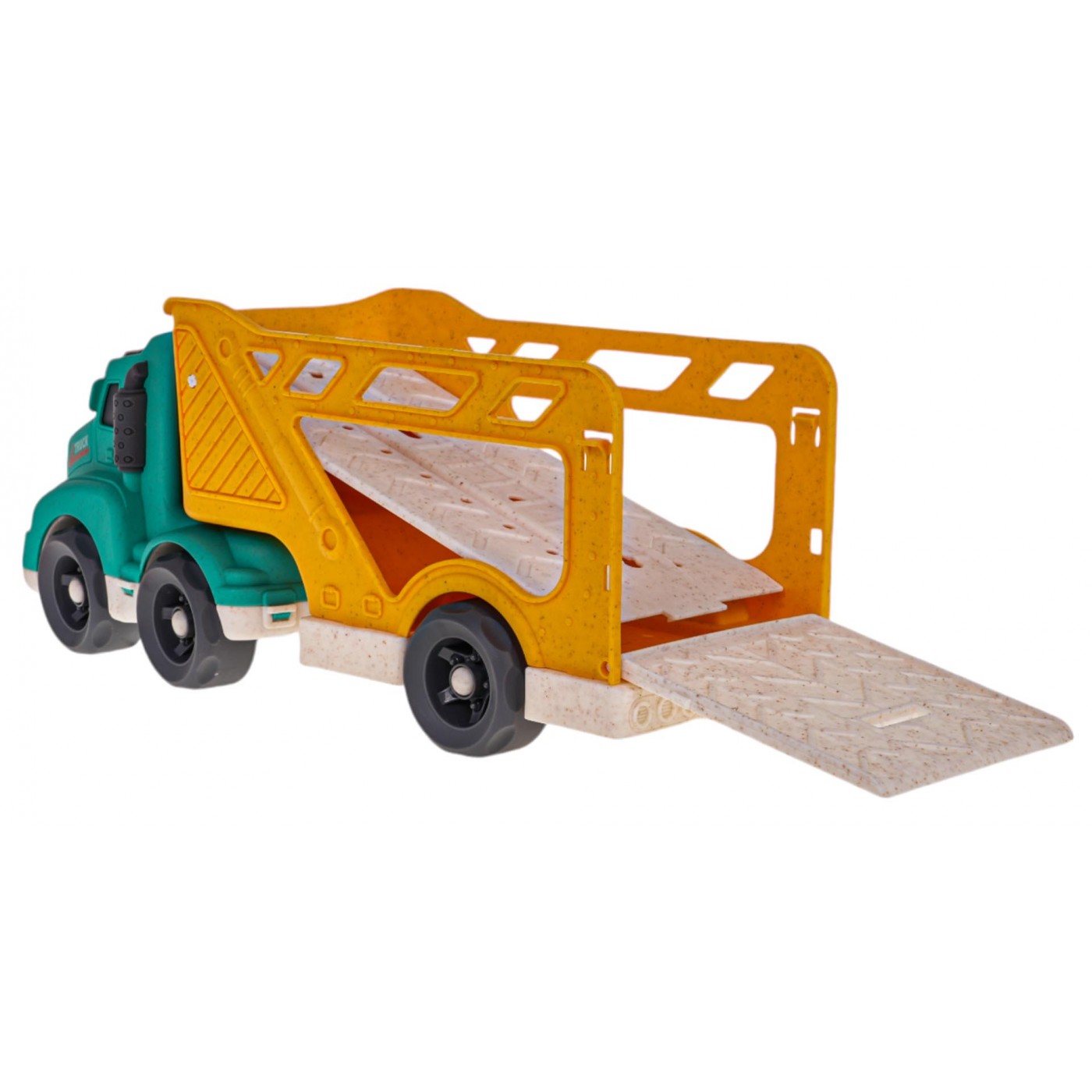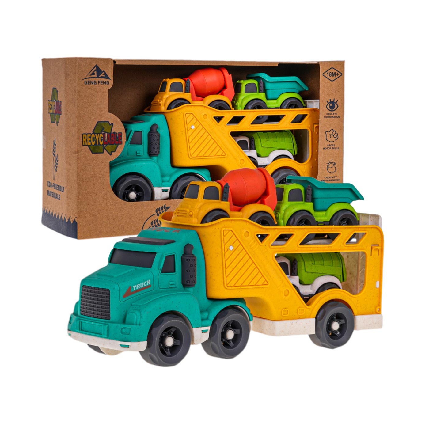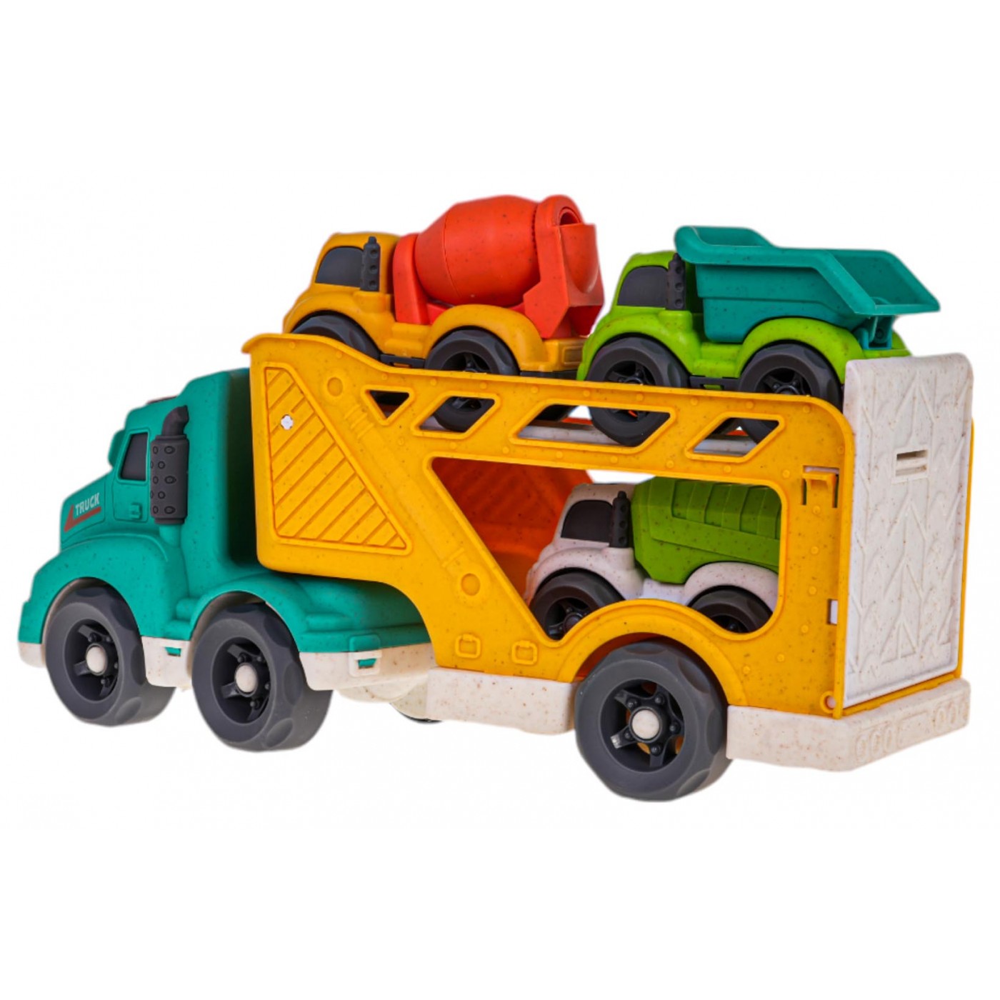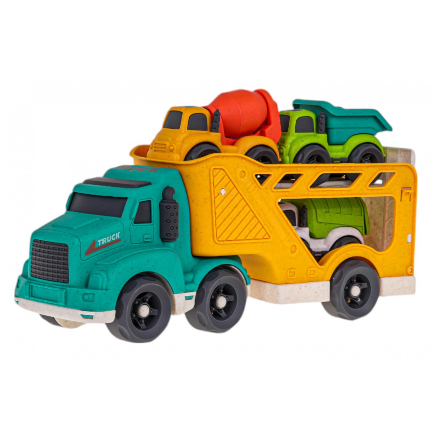 Sada vozidiel z bioplastu pre deti od 18 mesiacov. Súprava pozostáva z veľkého prívesu s pohyblivou plošinou a áut. Ekologický plast je bezpečný pre deti a šetrný k životnému prostrediu. Vozidlá sú farebné, odolné a odolné voči poškodeniu a majú pohyblivé časti. V domiešavači betónu môžeme ručne otáčať betónovou žiarovkou, v sklápači môžeme zdvíhať a spúšťať príves a v smetiarskom aute môžeme otvárať zadné poklop vozidla. Bábätko môže tiež ručne pohybovať vozidlom po zemi vďaka pohyblivým kolieskam.