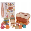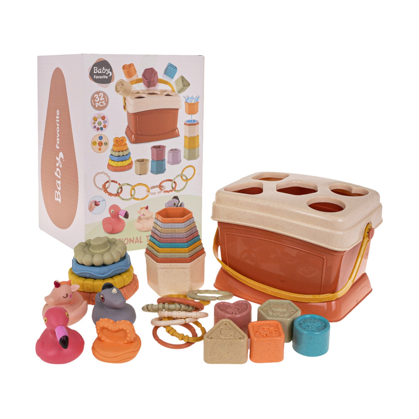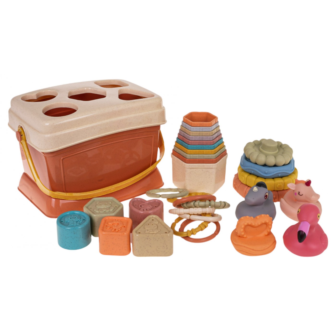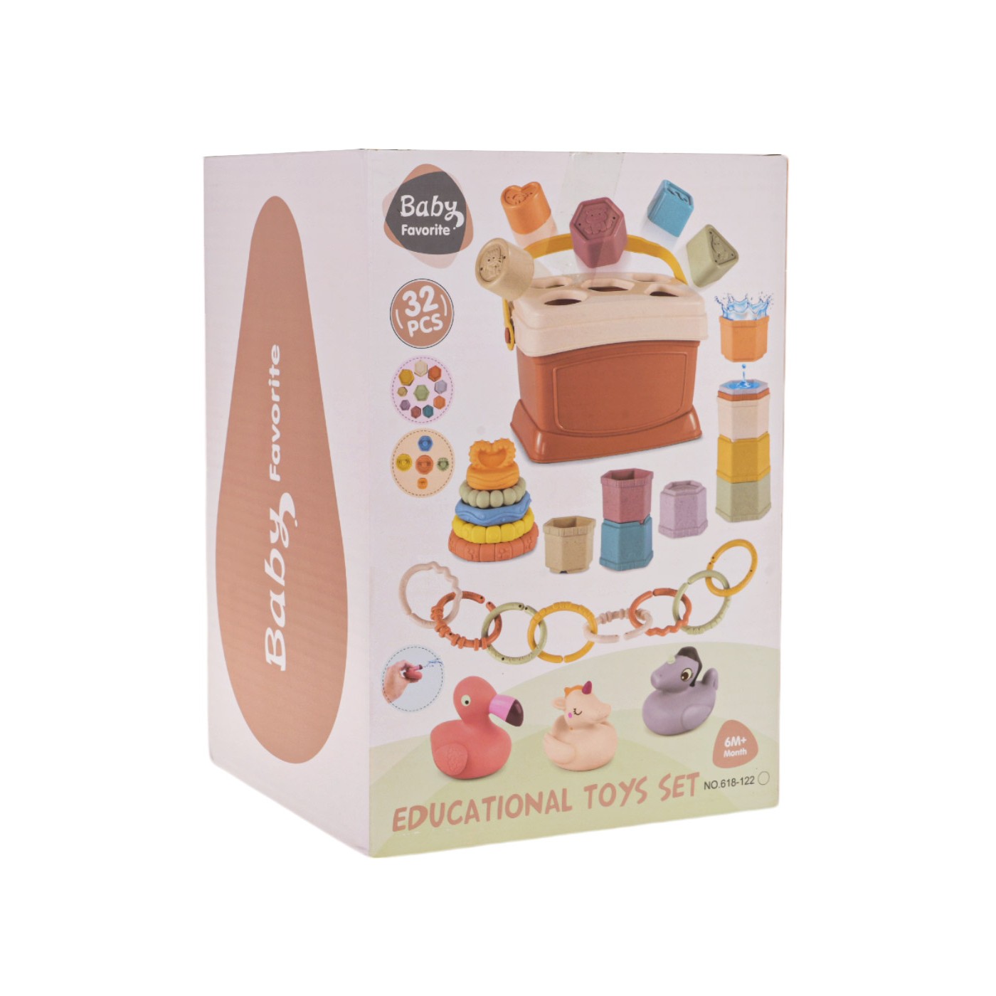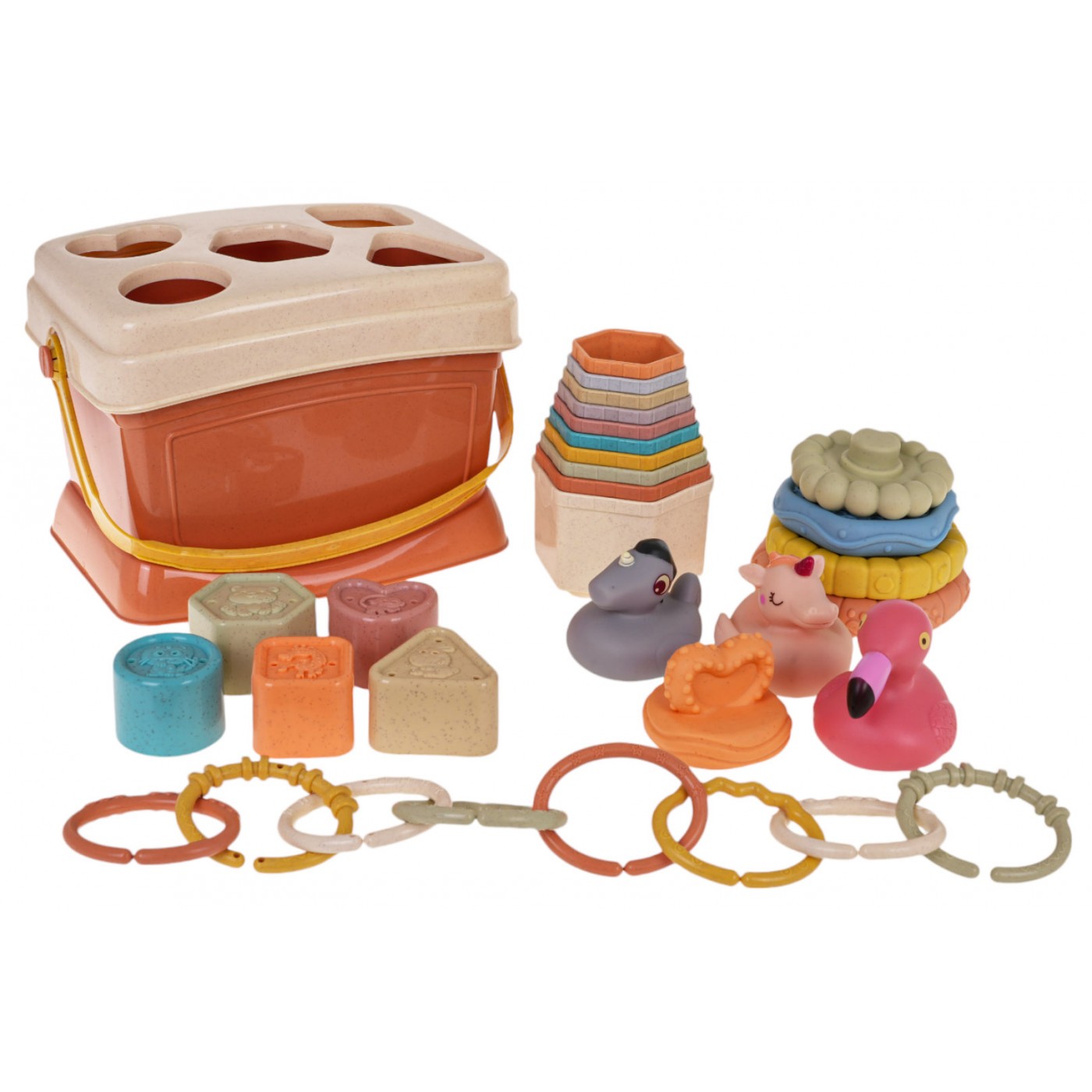 Set farebných edukačných hračiek pre bábätká od 6 mesiacov. Súprava obsahuje triedič tvarov s pohodlnou rukoväťou na prenášanie, bloky, gumené zvieratká, pyramídy na stavbu veží, stavebné kruhy a pripínacie prvky. Rôzne farby a tvary priťahujú detské oči a povzbudzujú ich k hre.