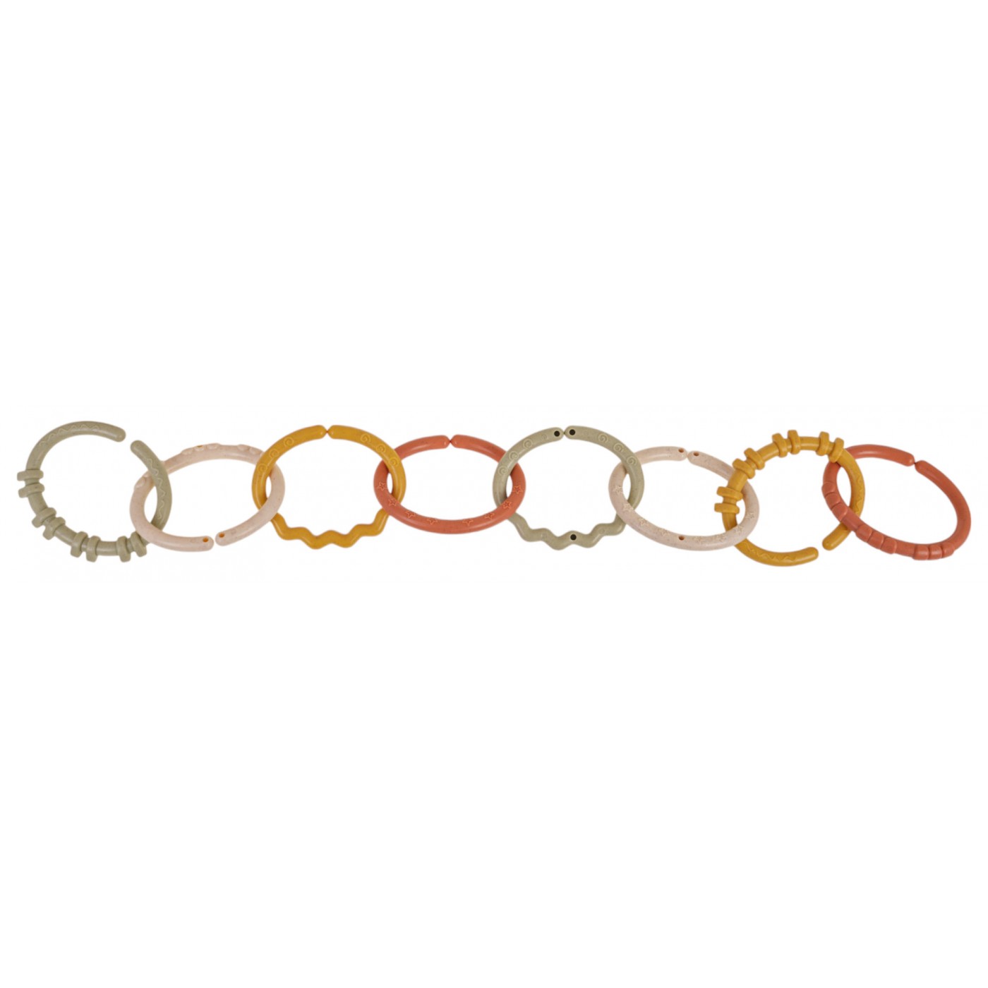 - triedič, box s pohodlnou rukoväťou na prenášanie, - 4 bloky rôznych farieb a tvarov, - 3 gumené zvieratká, - 10 pyramídových stavebných prvkov, - 8 kruhov na pripevnenie a vytvorenie retiazky - 5 gumových prvkov na pyramídu. |