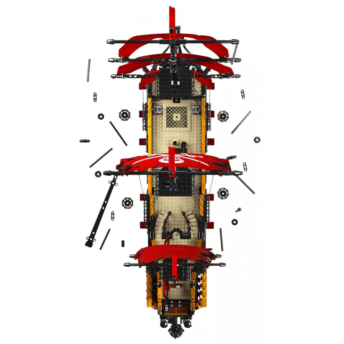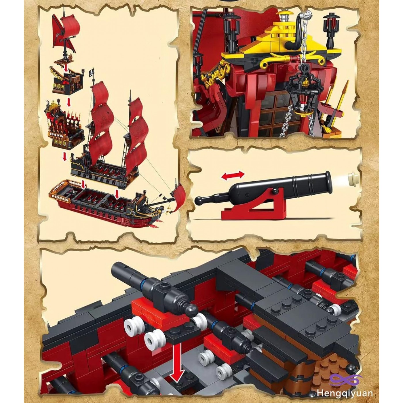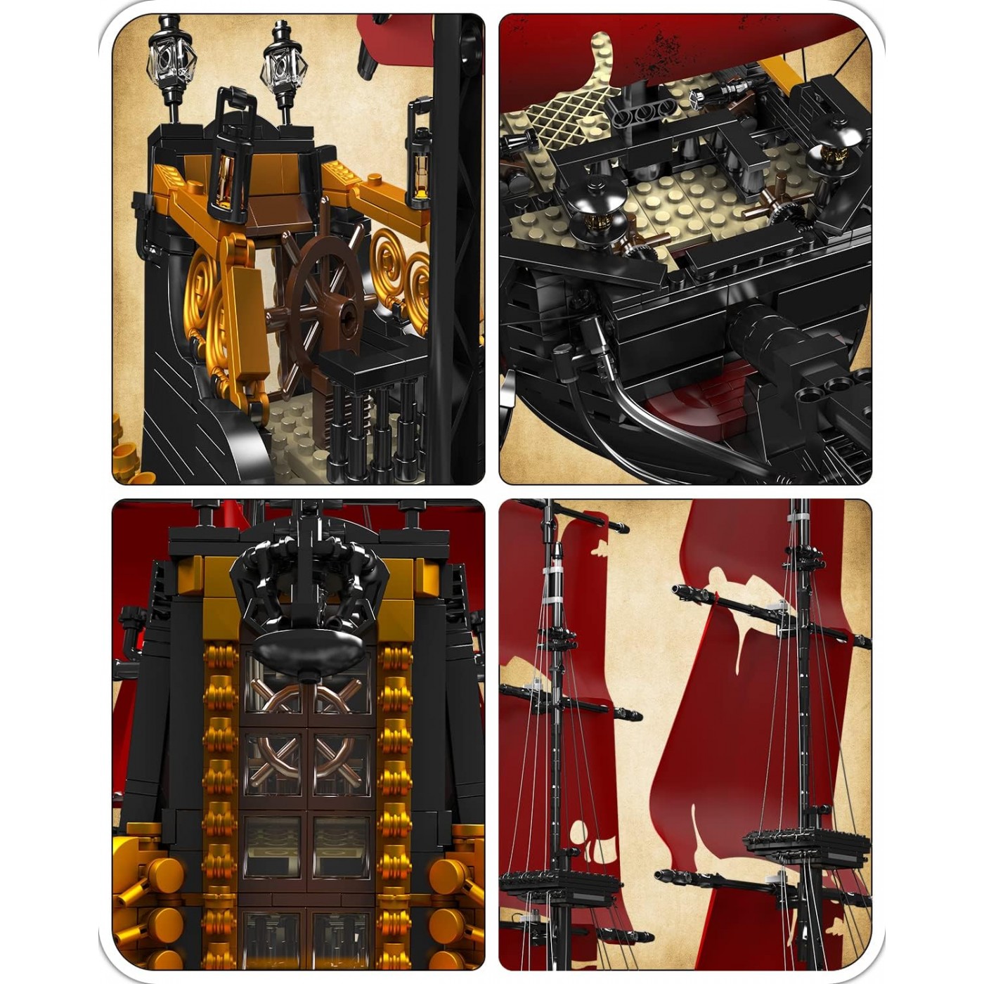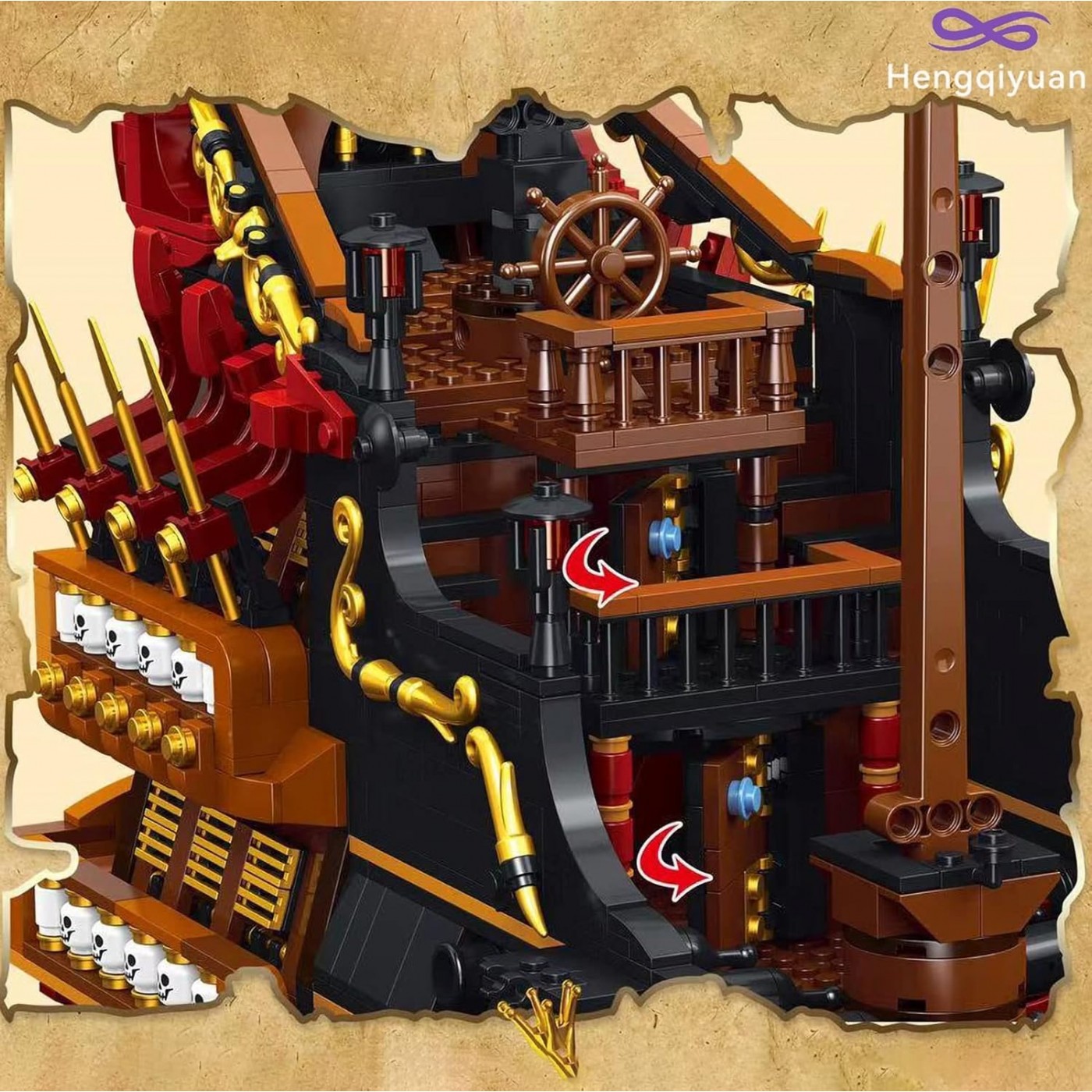 - sada 3139 stavebných blokov, - manuálne otvárané dvere kapitánskej kajuty, - ručne spúšťaná a zdvihnutá kotva, - manuálne zdvihnuté delové klapky, - možnosť ľahkej demontáže trupu a kapitánskej kabíny, aby ste videli stred paluby, - verná reprodukcia skutočnej lode, - určené pre deti od 14 rokov, - súčasťou balenia je obrázkový návod. |