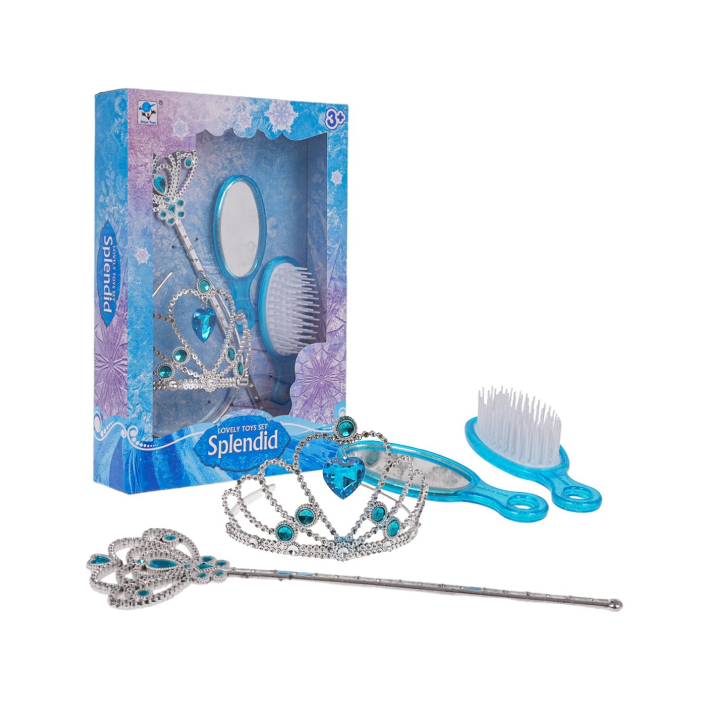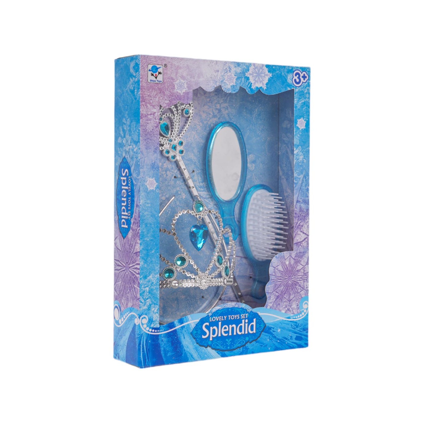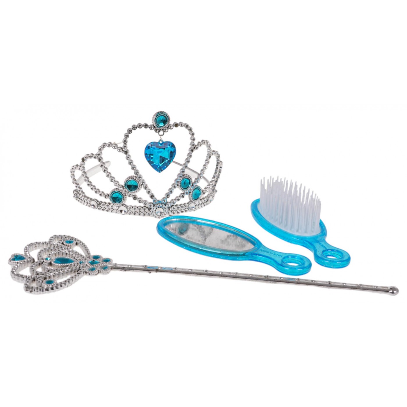 Výborná, krásne vyrobená súprava malá princezná je určená pre deti od 3 rokov. Súprava pozostáva z diadému, prútika, zrkadielka a kefy na vlasy. Diadém a prútik sú zdobené trblietavými modrými kamienkami, čo im dodáva neuveriteľné čaro.