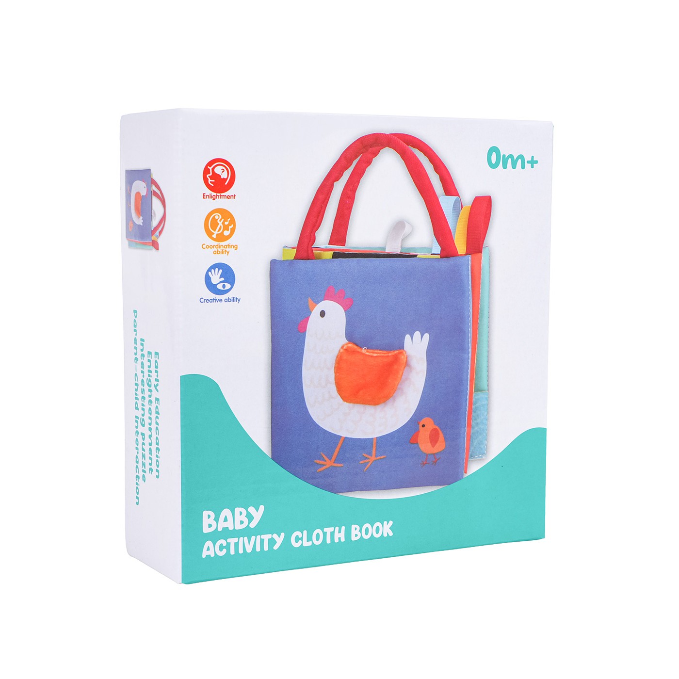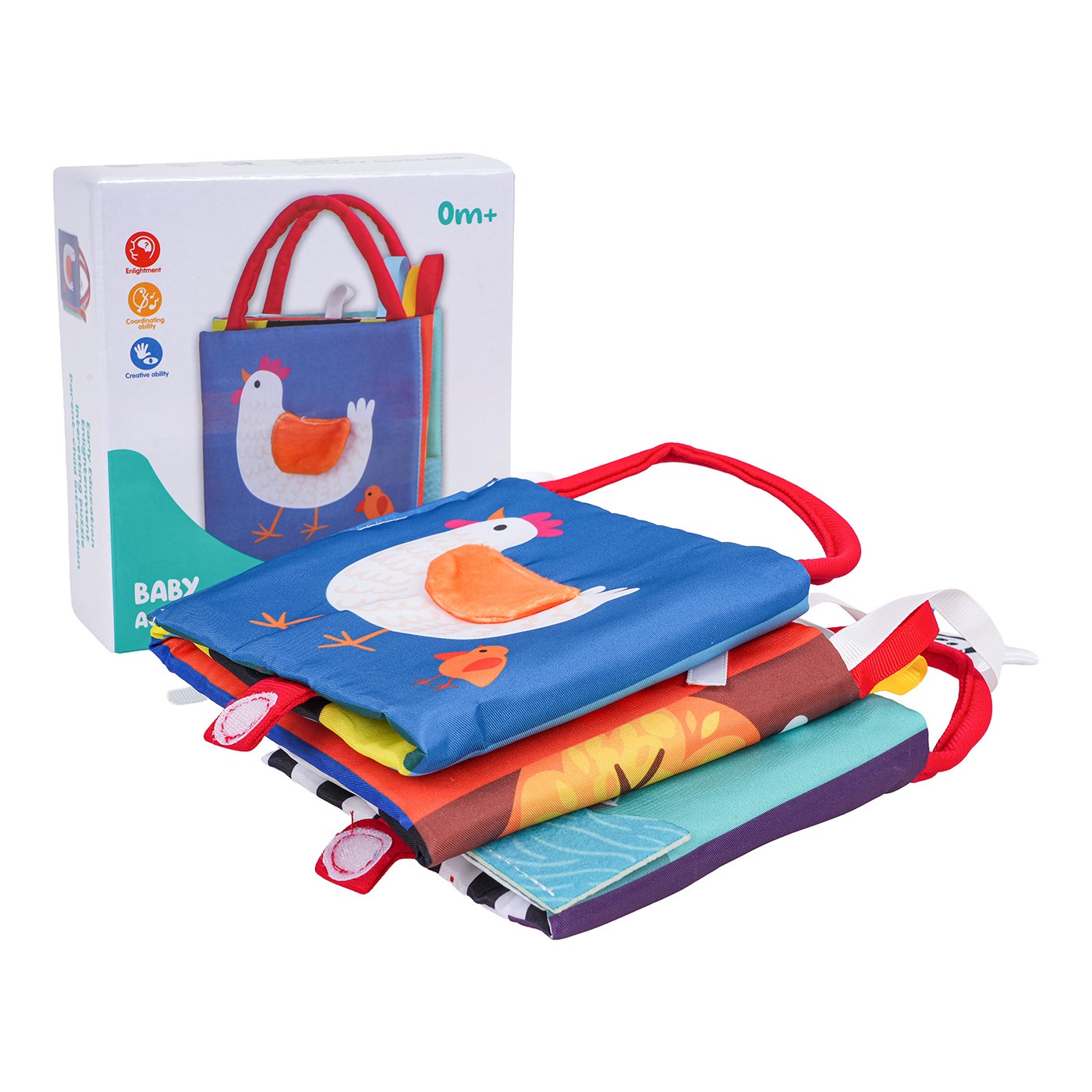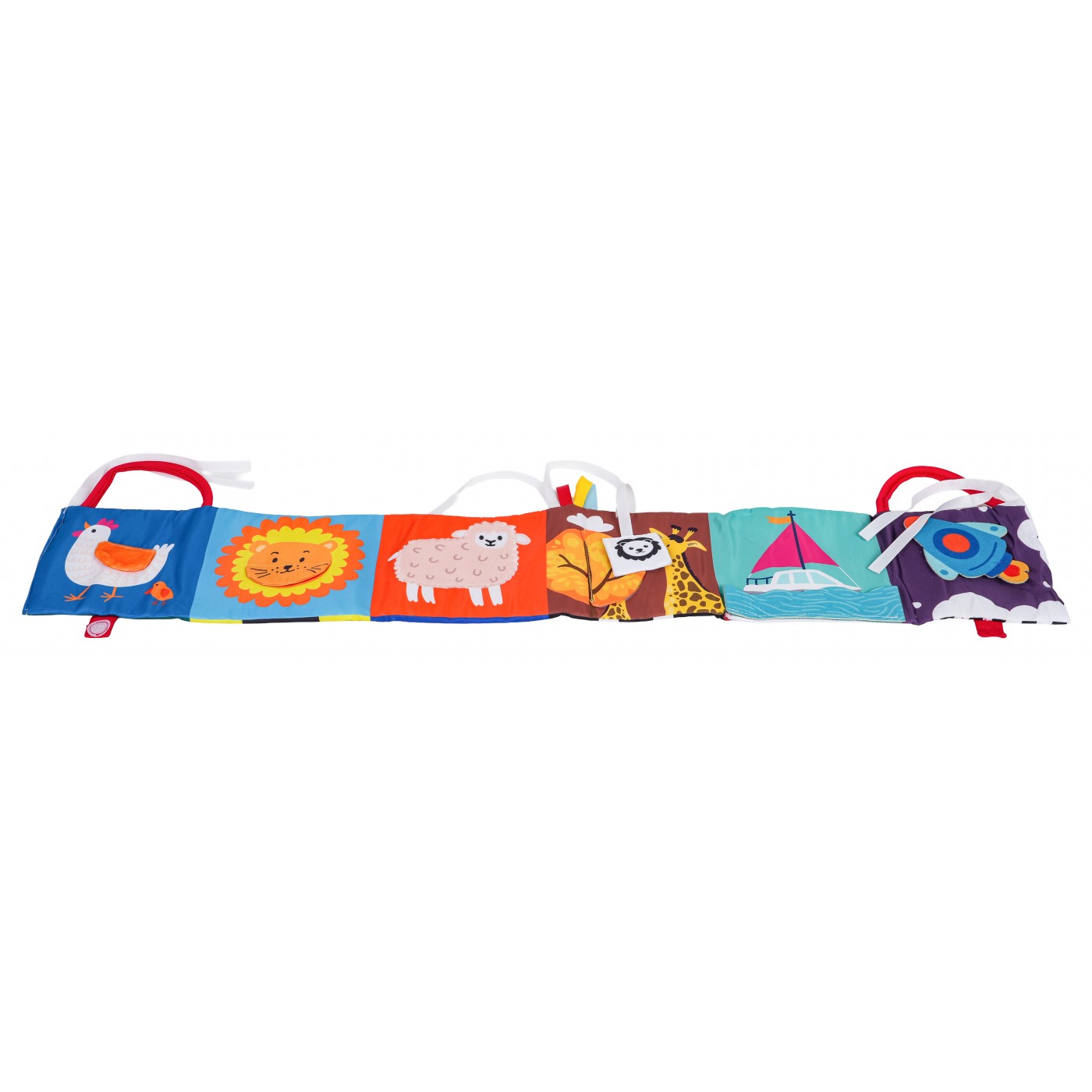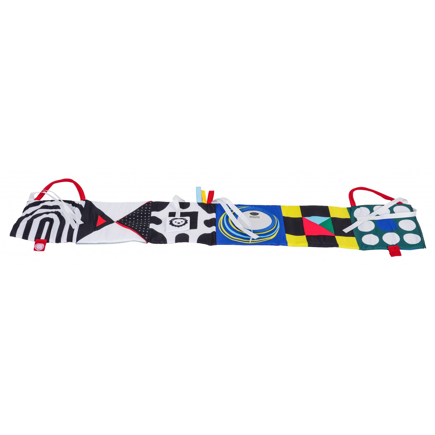 Senzorická kniha pre bábätká od narodenia. Vyrobená z materiálov bezpečných pre dojčatá, obsahuje šesť obrázkov zobrazujúcich kontrastné geometrické tvary, štyri obrázky zvierat a dva obrázky vozidiel. Kniha má dve rúčky prišité v hornej časti pre ľahké prenášanie a stužky na držanie. Kniha pomôže rozvíjať sústredenie, koordináciu ruka-oko a podporí učenie farieb a tvarov.