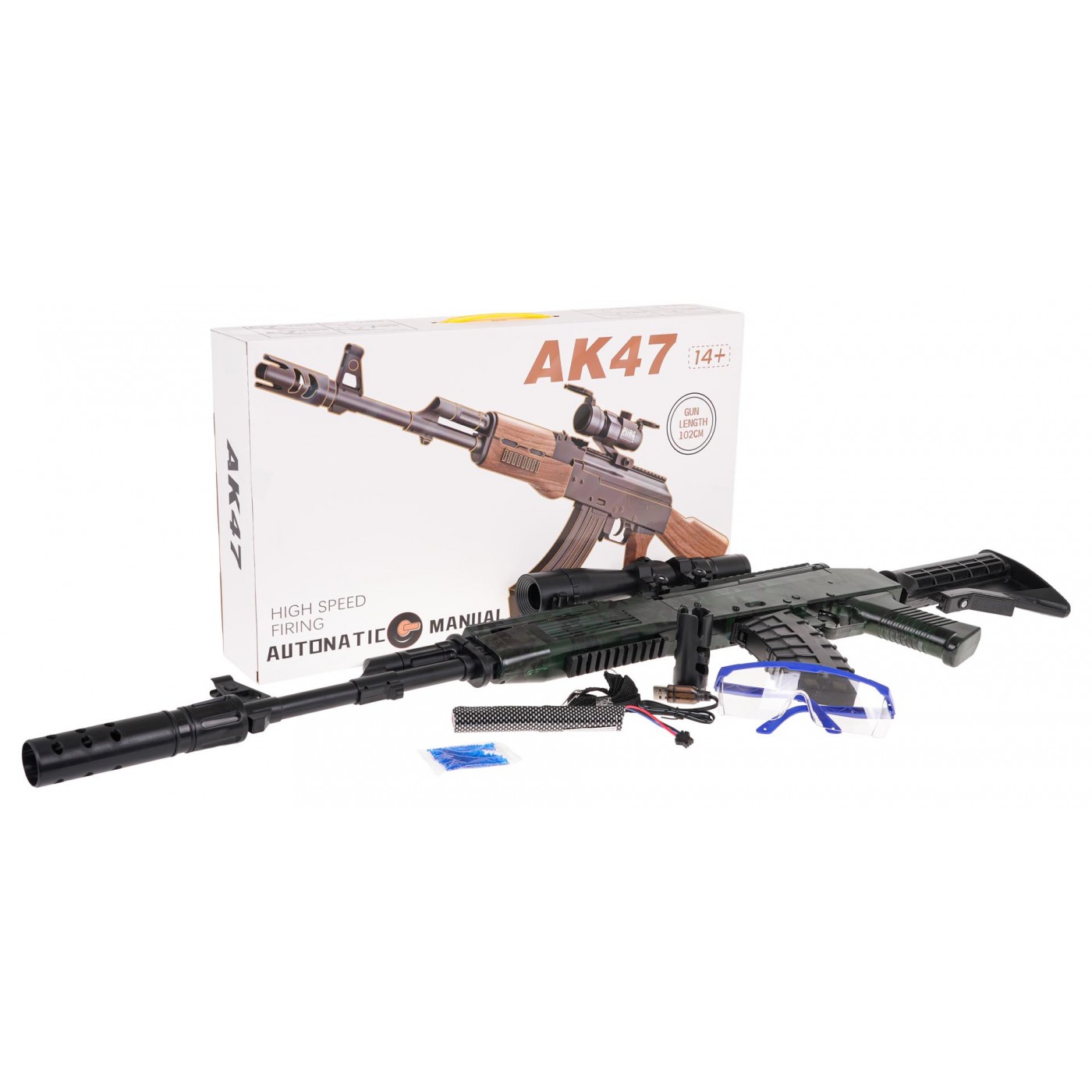- puška, - časopis, - sud, - tlmič, - zameriavač s kolimátorom, - fľaša, - USB kábel, - 7,4V batéria, - vrecko s loptičkami na prípravu, - vodítko, - bezpečnostné okuliare, - manuál v angličtine, - farebné balenie. |