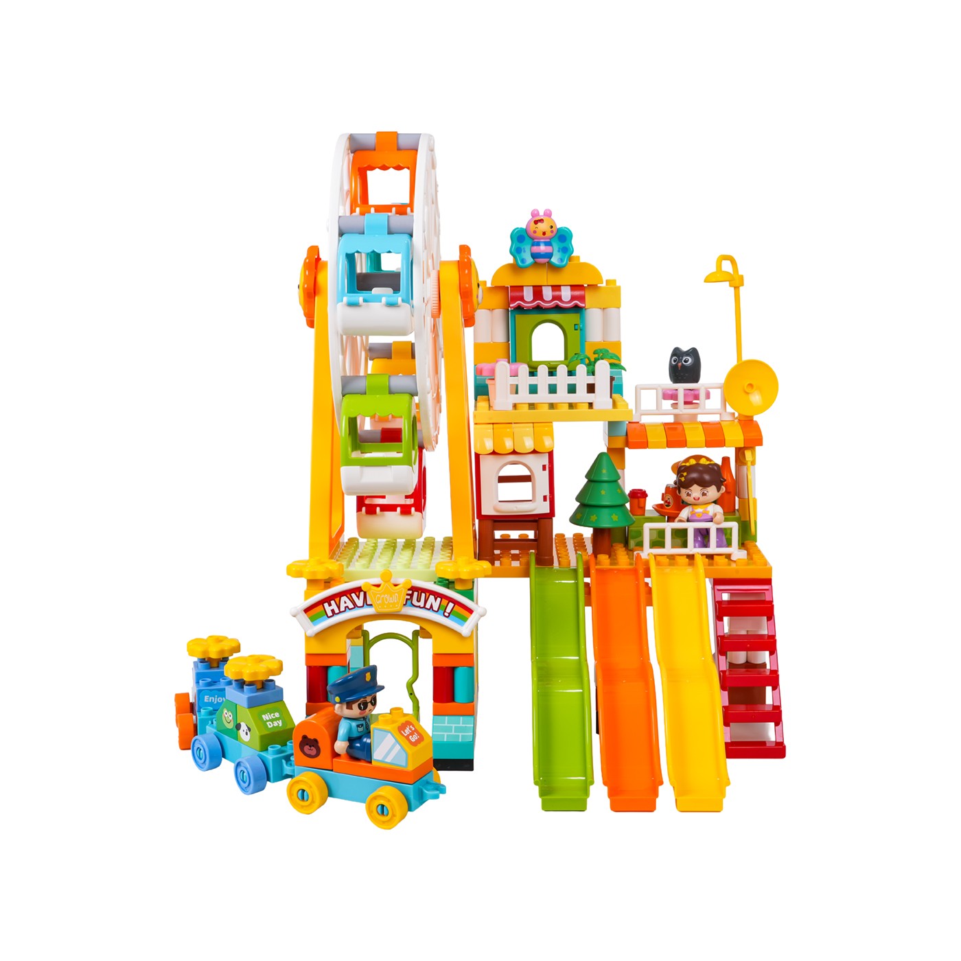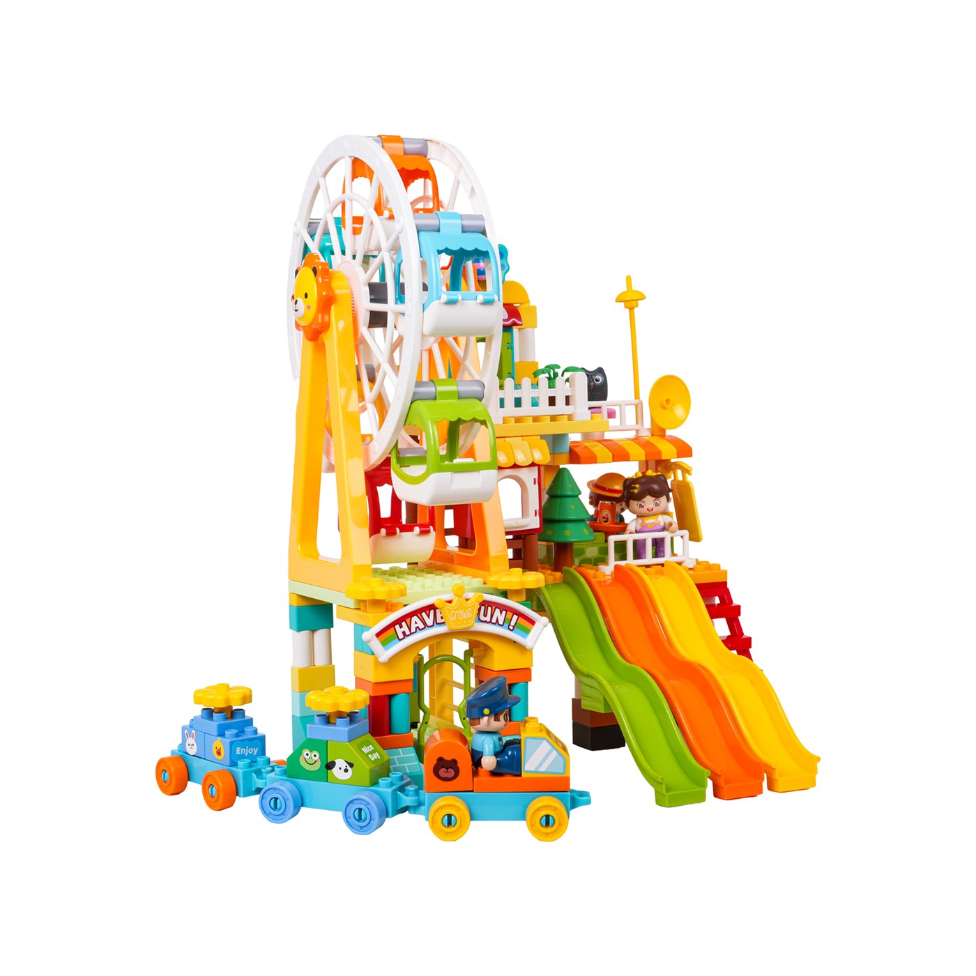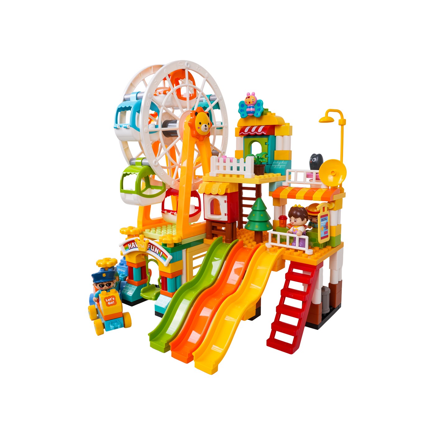 Sada stavebných kociek na stavbu zábavného parku pre deti od troch rokov. Sada pozostáva z 235 dielikov vyrobených z najkvalitnejších a pre deti bezpečných materiálov. Kocky zaujmú svojimi sýtymi farbami a funkčnosťou. Zábavný park obsahuje otočné ruské koleso s otváracími vagónmi na umiestnenie figúrok, pohyblivú hojdačku a tri šmýkačky. Nájdete tu aj vláčik s pohyblivými kolesami a figúrku policajta, ktorý v zábavnom parku udržiava poriadok, ako aj dve detské figúrky.