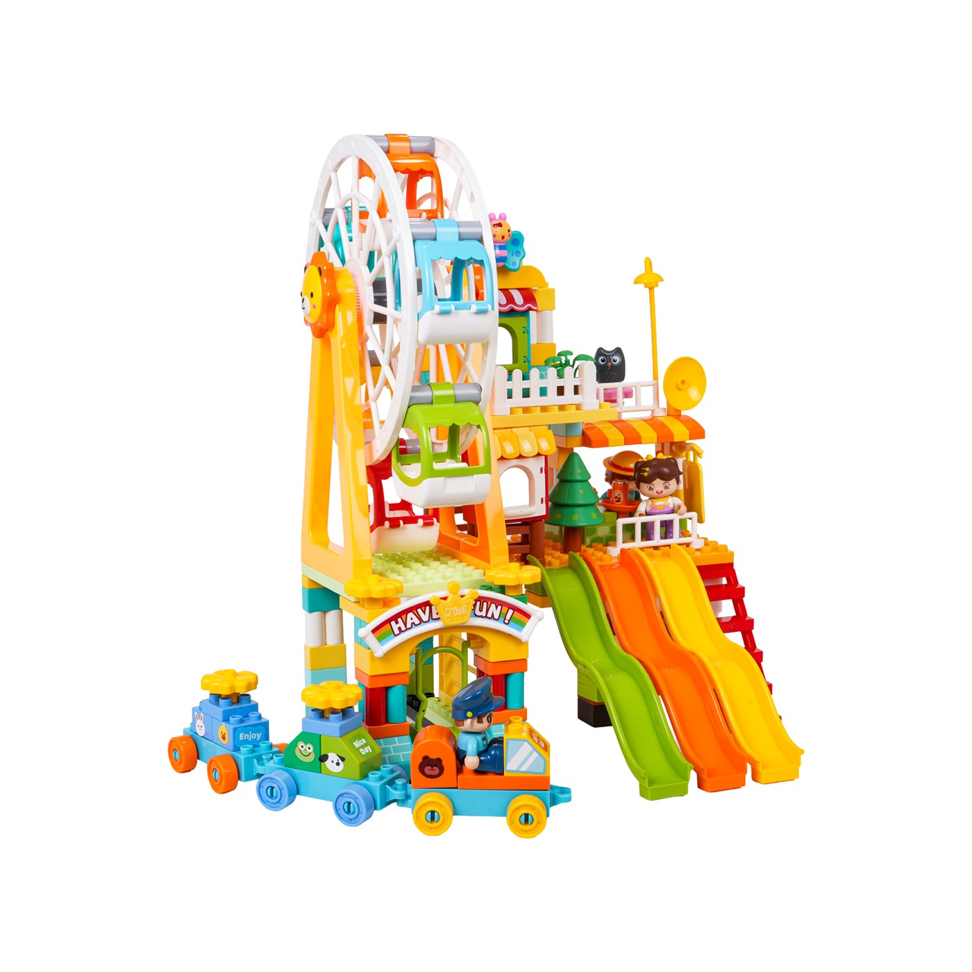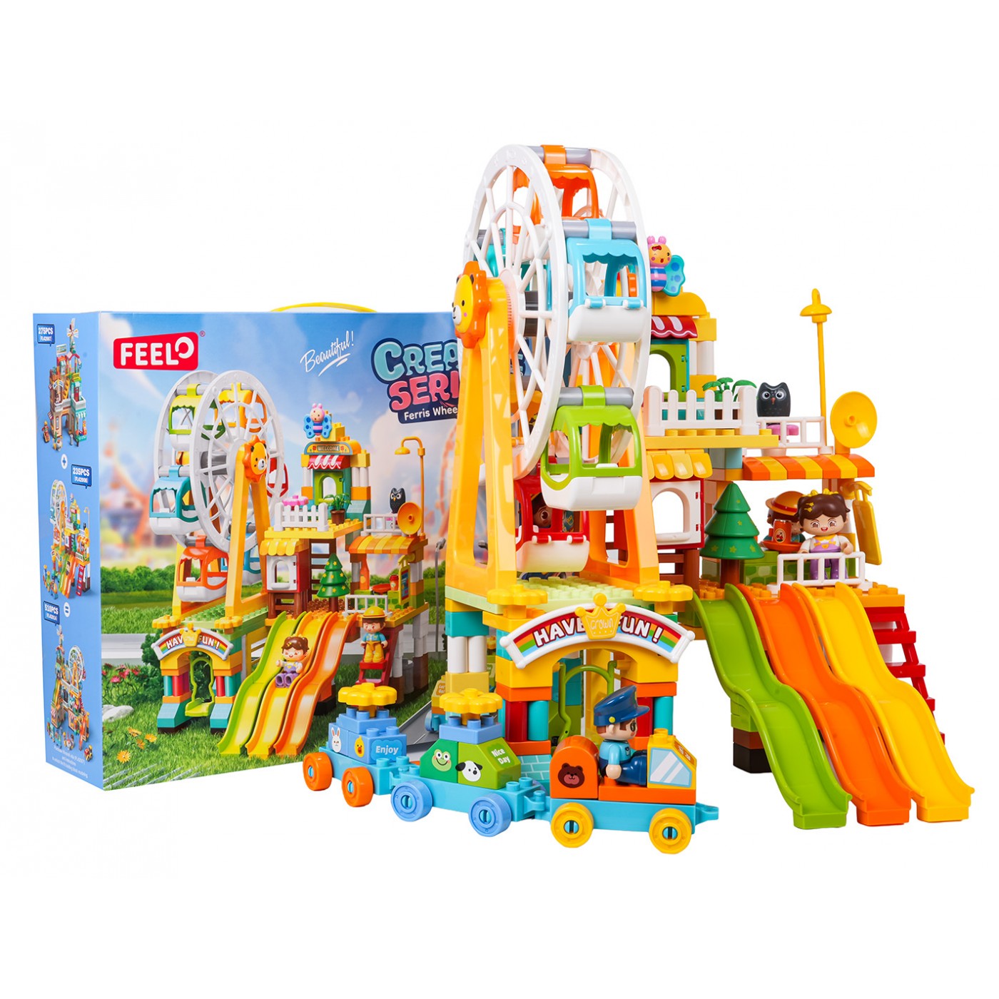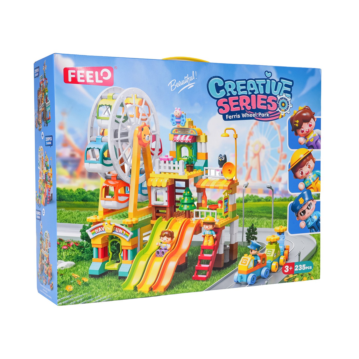 Sada stavebných kociek na stavbu zábavného parku pre deti od troch rokov. Sada pozostáva z 235 dielikov vyrobených z najkvalitnejších a pre deti bezpečných materiálov. Kocky zaujmú svojimi sýtymi farbami a funkčnosťou. Zábavný park obsahuje otočné ruské koleso s otváracími vagónmi na umiestnenie figúrok, pohyblivú hojdačku a tri šmýkačky. Nájdete tu aj vláčik s pohyblivými kolesami a figúrku policajta, ktorý v zábavnom parku udržiava poriadok, ako aj dve detské figúrky.