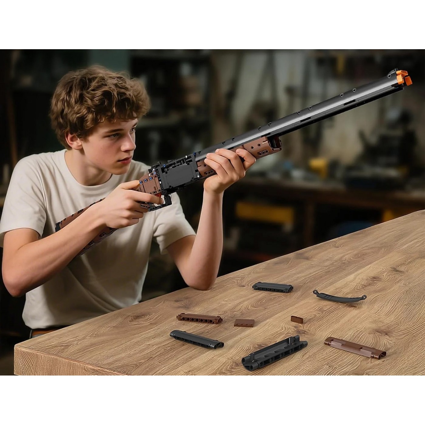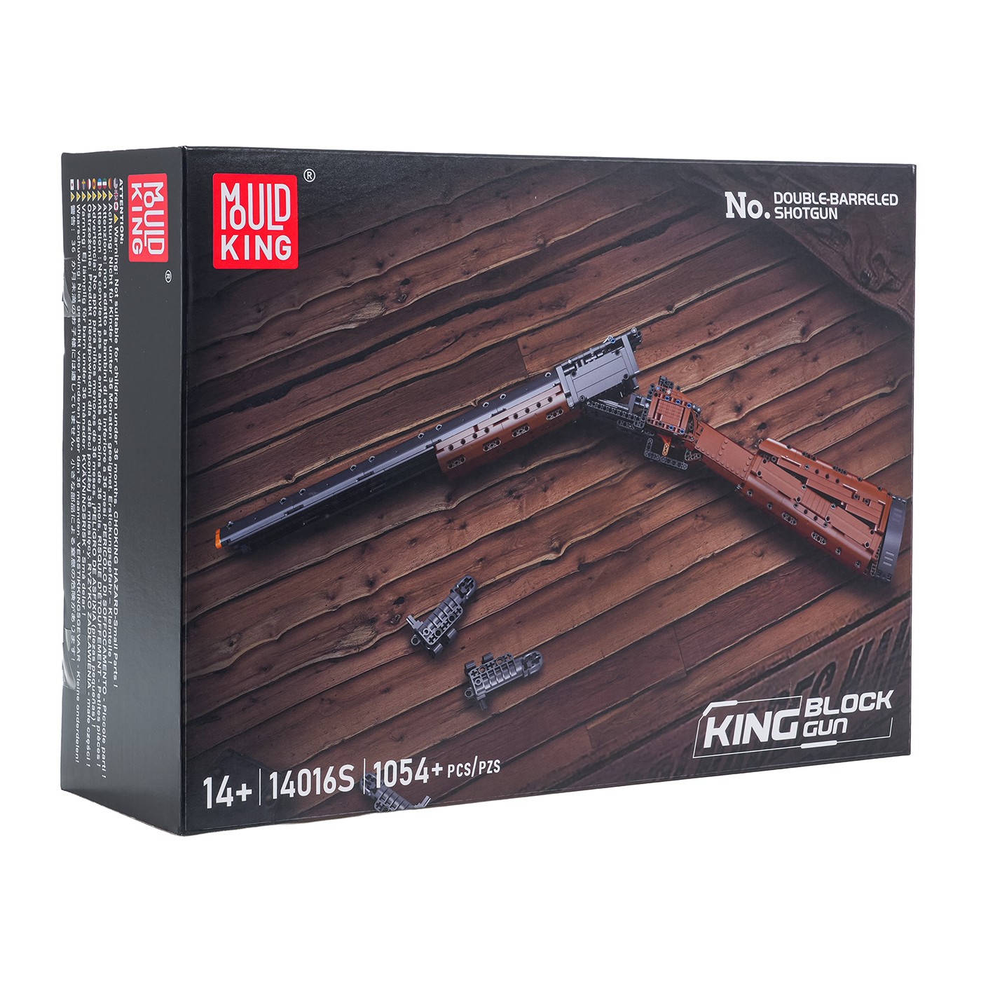 Vysokokvalitné stavebnice Mold King pre deti od štrnástich rokov. Sada obsahuje 1 054 dielikov, ktoré možno použiť na zostavenie dvojhlavňovej pušky, ktorá vystrelí dva projektily súčasne.