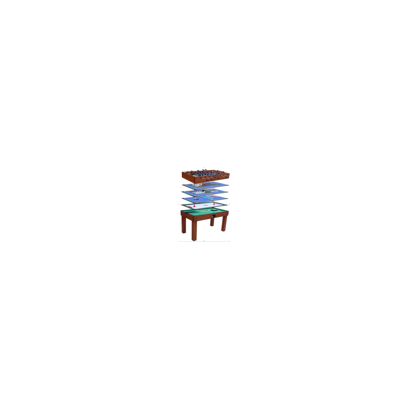 - płyta MDF pokryta elastycznym laminatem, - teleskopowe, bezpieczne rączki, - możliwość złożenia stołu do pionu w celu zaoszczędzenia miejsca, kiedy stół nie jest używany (dodatkowe kółka transportowe), - uchwyty wykonane z perforowanego materiału, minimalizujące ślizganie się dłoni, - zawodnicy dodatkowo poszerzeni w miejscu uderzania piłeczki, - starannie dopasowane prowadnice – gille – nie blokujące się oraz płynnie działające rączki, - blokada maksymalnego wychylenia uchwytu, - prowadnice zabezpieczone gumową nakładką, - stabilne i solidne nogi, dodatkowo wzmocnione poprzeczkami, - dwie piłeczki, - dwa liczniki manualne do liczenia zdobytych goli. |