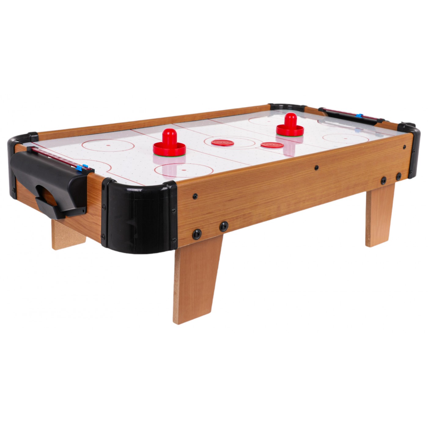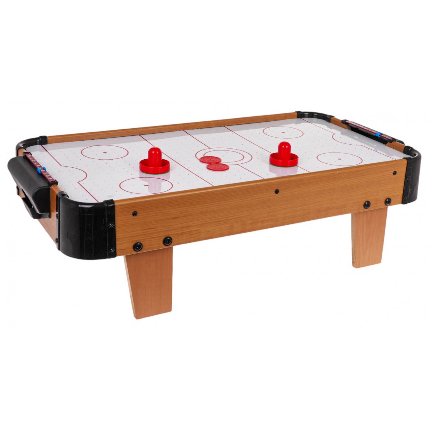 Stôl na vzdušný hokej – vzduch hokej pre deti od 6 rokov. AIR HOCKEY - je typ obľúbenej arkádovej hry určenej pre dvoch hráčov. Na hru sa používa špeciálne pripravený stôl. Povrch stola je pokrytý otvormi, cez ktoré je vyfukovaný vzduch. Vznikne tak vzduchový vankúš, po ktorom puk kĺže bez kontaktu so zemou. Hráči stoja na opačných stranách stola. Každý hráč používa špeciálny plastový nástroj, niekedy nazývaný hríb, ktorý slúži ako raketa. S týmto nástrojom hráči zasiahnu puk. Cieľom hry je vložiť puk do súperovej brány. Puk sa pohybuje vysokou rýchlosťou. Hra sa väčšinou preruší, keď niektorý z hráčov dosiahne vopred stanovený počet bodov (zvyčajne sedem alebo deväť) alebo po uplynutí stanoveného časového limitu. Hračka je napájaná 6 x AA 1,5 V batériami (nie sú súčasťou balenia).