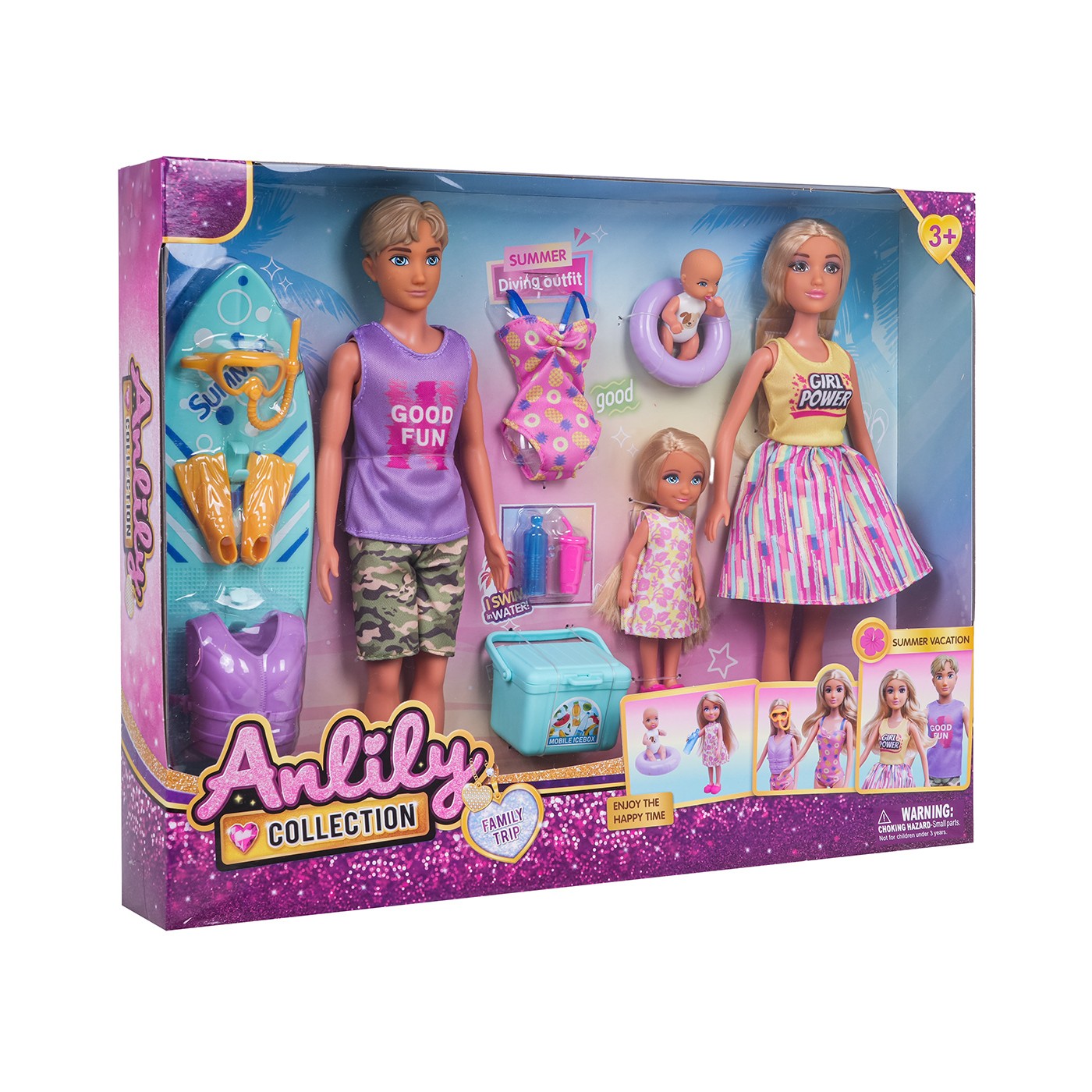 Sada bábik a doplnkov zo série Vacation pre deti od troch rokov. Všetky dieliky sú vyrobené z najkvalitnejších materiálov s dôrazom na detail. Sada obsahuje bábiku mamy, bábiku otca, bábiku dcéry a bábiku bábätka. Bábiky sa dodávajú s nasledujúcim príslušenstvom: surfová doska, potápačská maska, plutvy, bezpečnostná vesta, plavky, chladiaci box, dve nádoby na nápoje a plavecký kruh. S touto sadou zábava nikdy nekončí. Vlastnosti: - vhodné pre deti od troch rokov, - vyrobené z najkvalitnejších materiálov, - bábiky majú pohyblivé ruky, nohy a hlavy, - množstvo príslušenstva v cene, - ideálne na hranie rolí, - perfektná darčeková sada. |