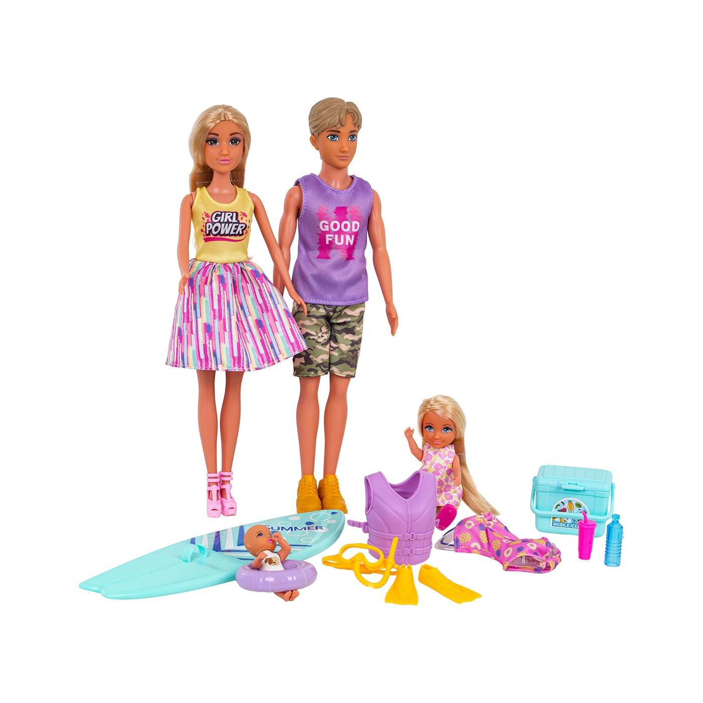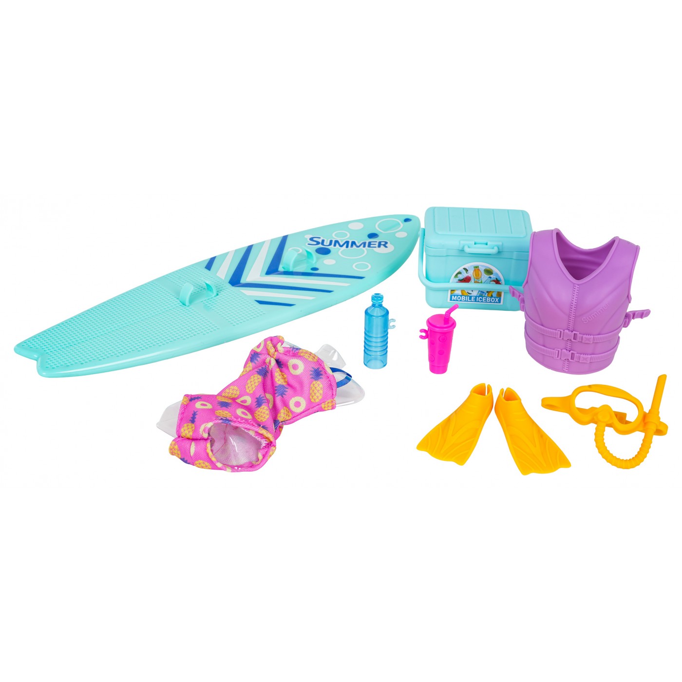 - bábiková mama, - bábika otecka, - dcérska bábika, - bábika, - surfová doska, - kyslíková maska na potápanie, - potápačské plutvy, - ochranná vesta, - plavky, - turistická chladnička, - 2 nádoby na nápoje, - plavecký kruh. |