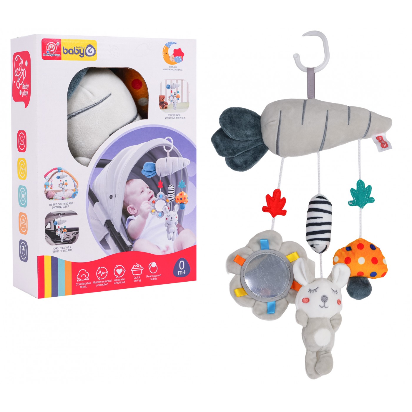 Senzorický prívesok do kočíka, postieľky alebo autosedačky, vhodný pre bábätká od narodenia. Vyrobený z mäkkých, pre deti bezpečných materiálov najvyššej kvality, stimuluje zmysly bábätka na mnohých úrovniach. Jednotlivé prvky šuštia a hrkajú a žiarivé farby pútajú pozornosť bábätka a povzbudzujú k hre.