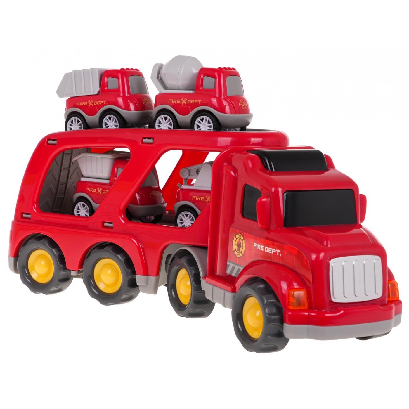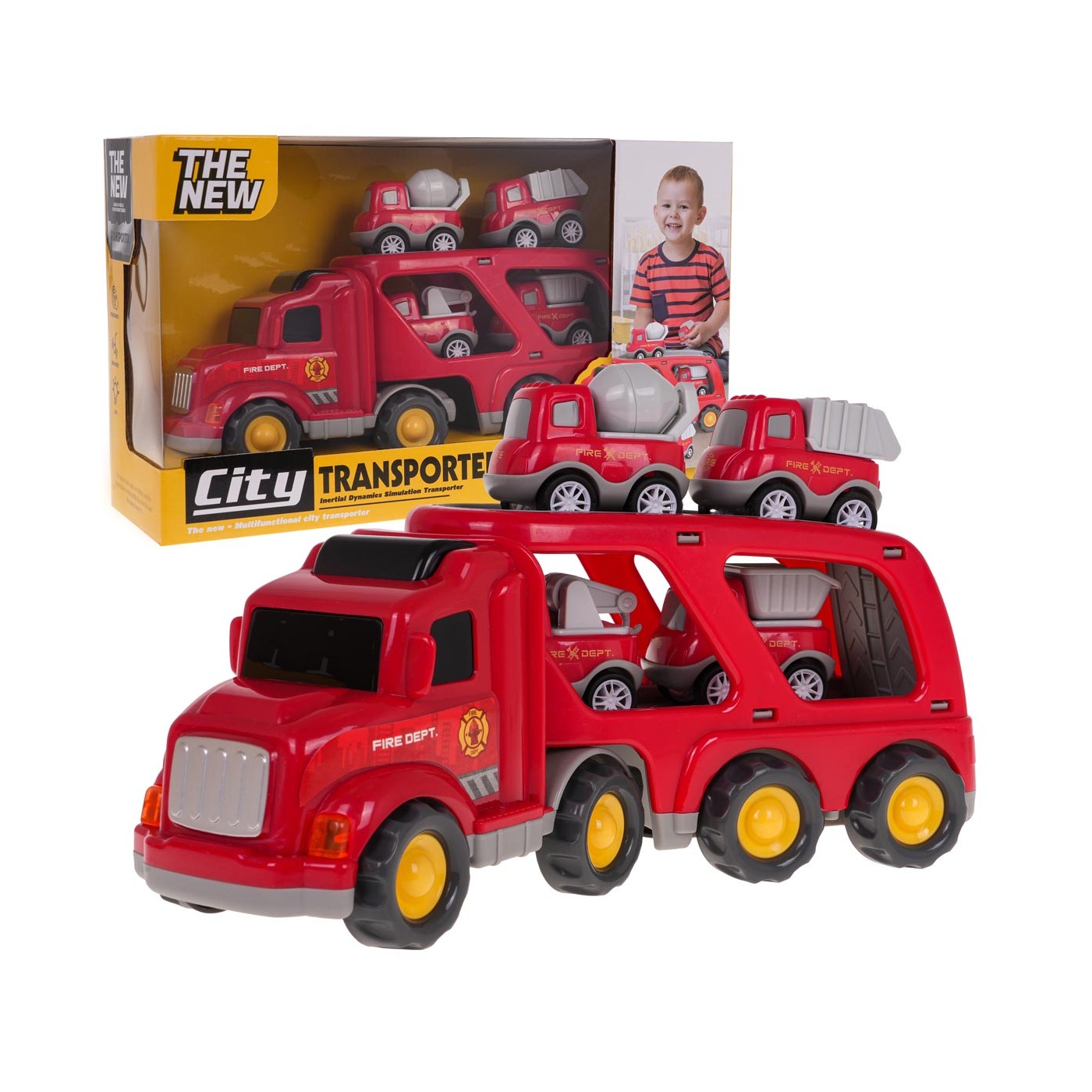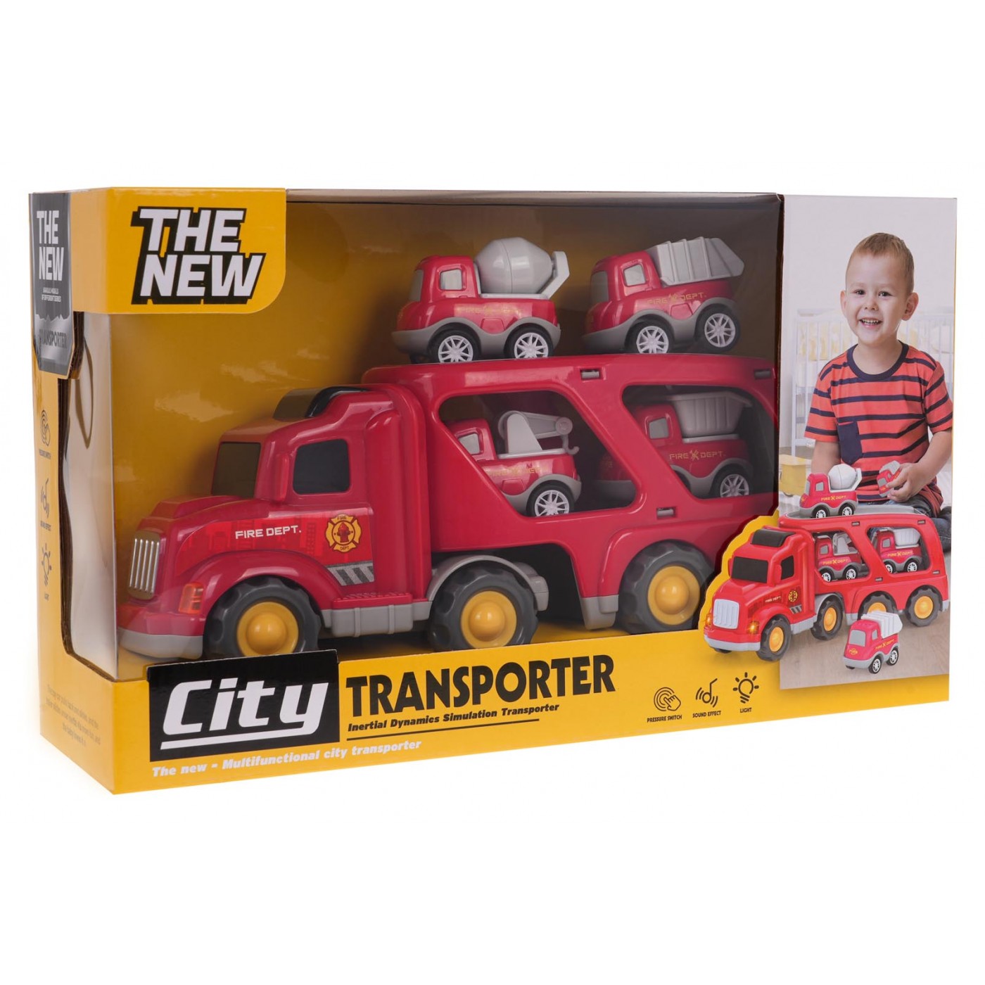 Interaktívna súprava vozidiel, ťahák so štyrmi vozidlami pre deti od 3 rokov. Súprava je vyrobená z najkvalitnejšieho plastu v živých farbách. Auto má odnímateľný príves a otváraciu zadnú stenu. Do odťahového auta sa zmestia štyri vozidlá: sklápač, domiešavač betónu, žeriav a auto s kontajnerom. Po stlačení tlačidla umiestneného na streche kabíny nákladného vozidla zablikajú predné svetlá vozidla a ozvú sa zvuky štartovania, jazdy a trúbenia vozidla. Autíčko je napájané 3 x AG13 batériami (batérie sú súčasťou balenia).