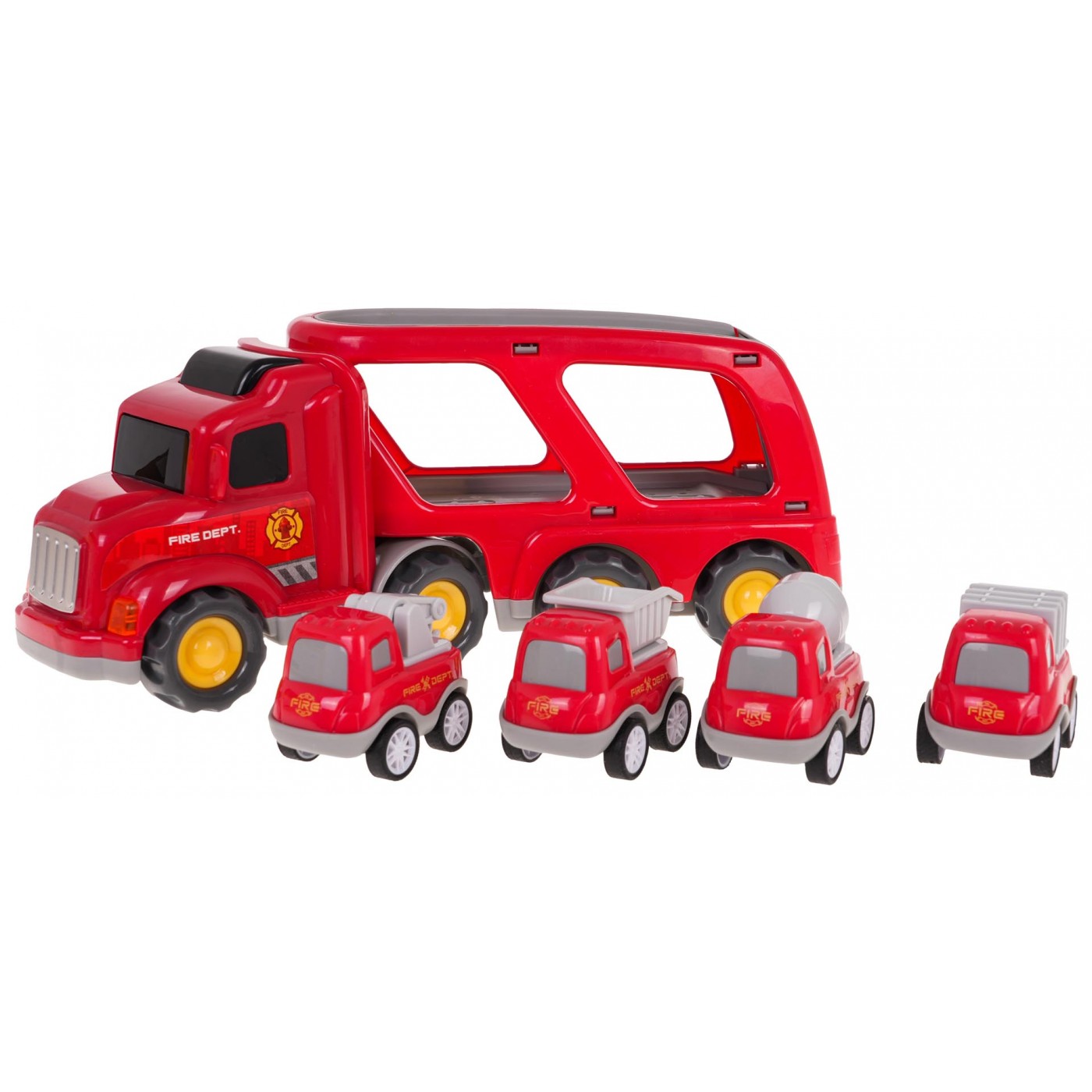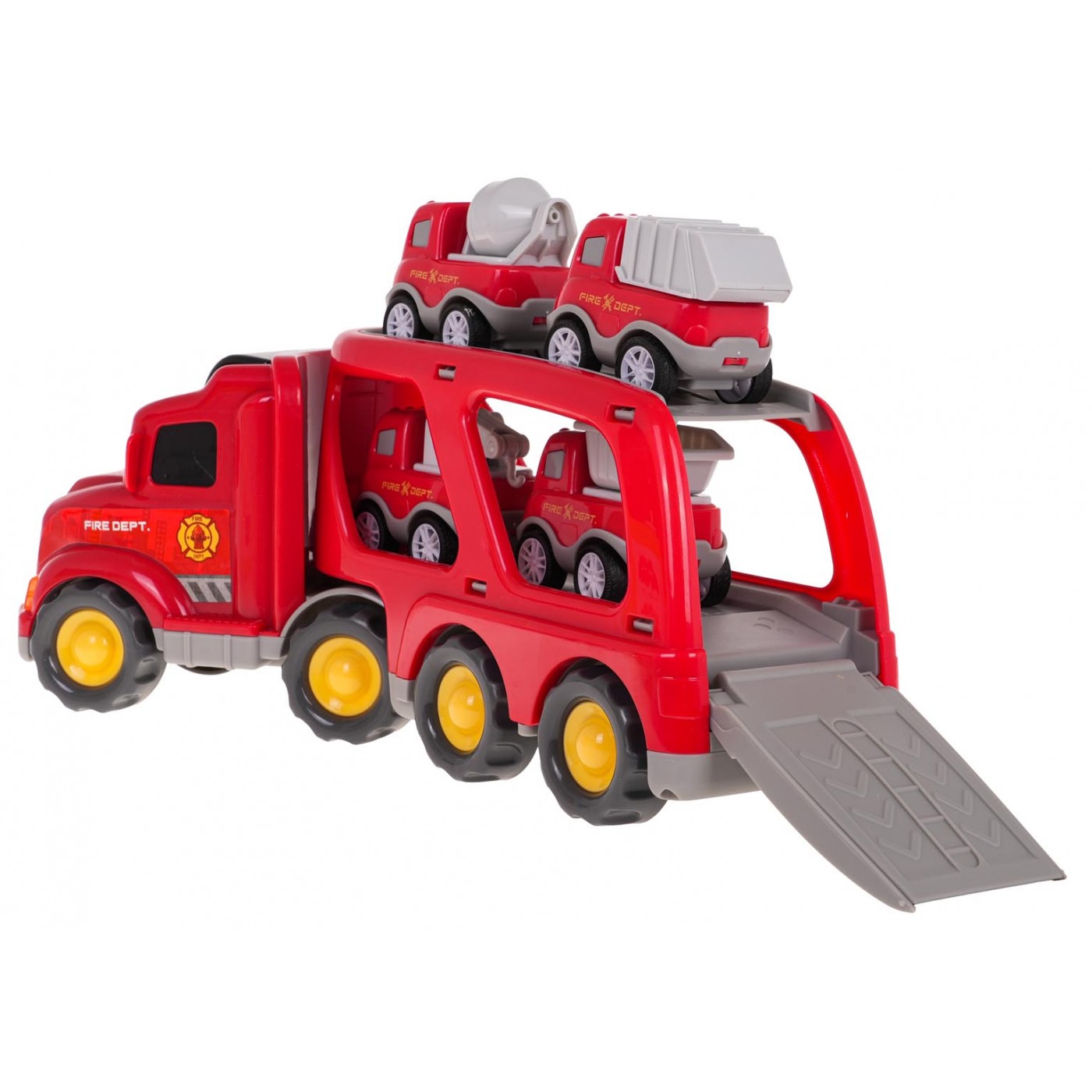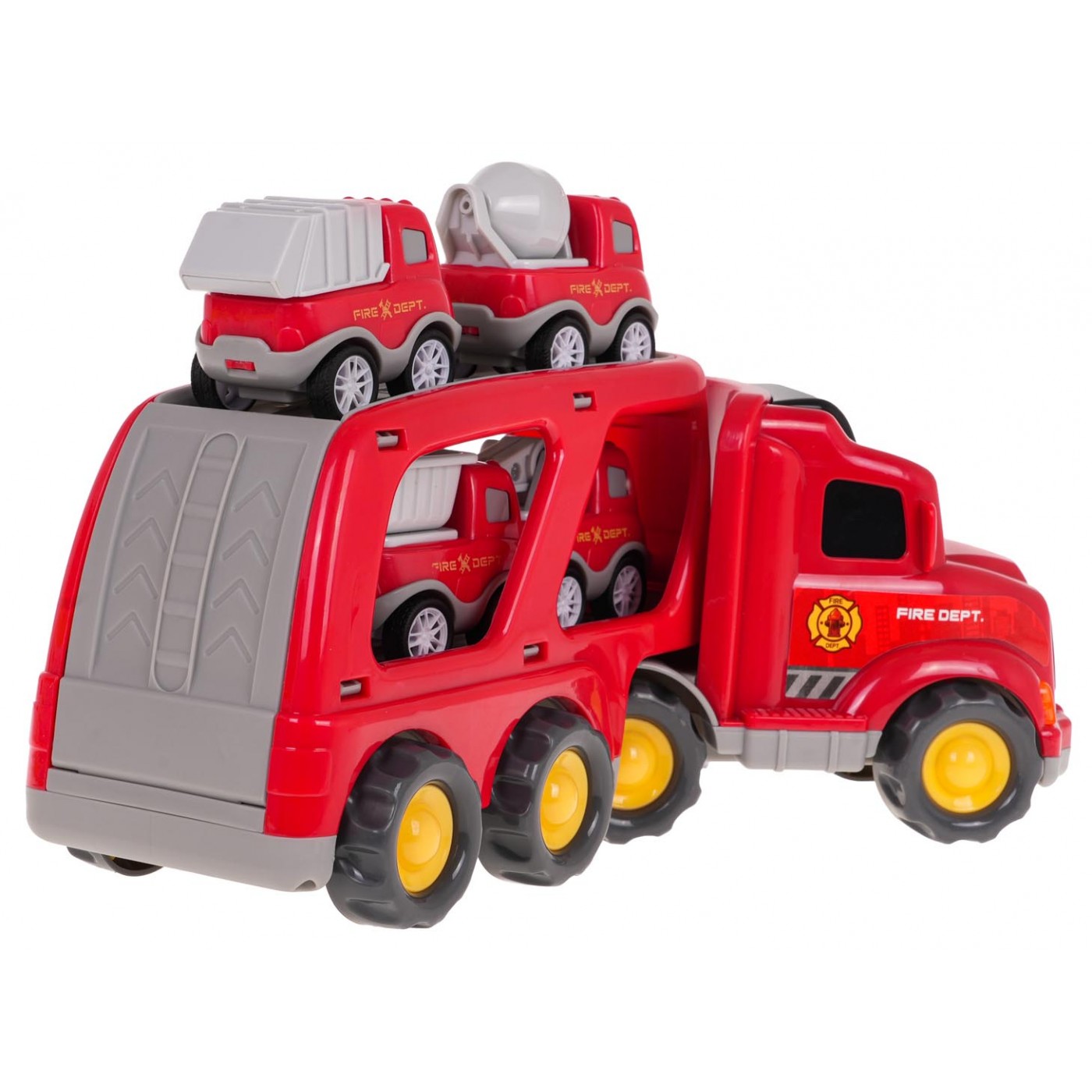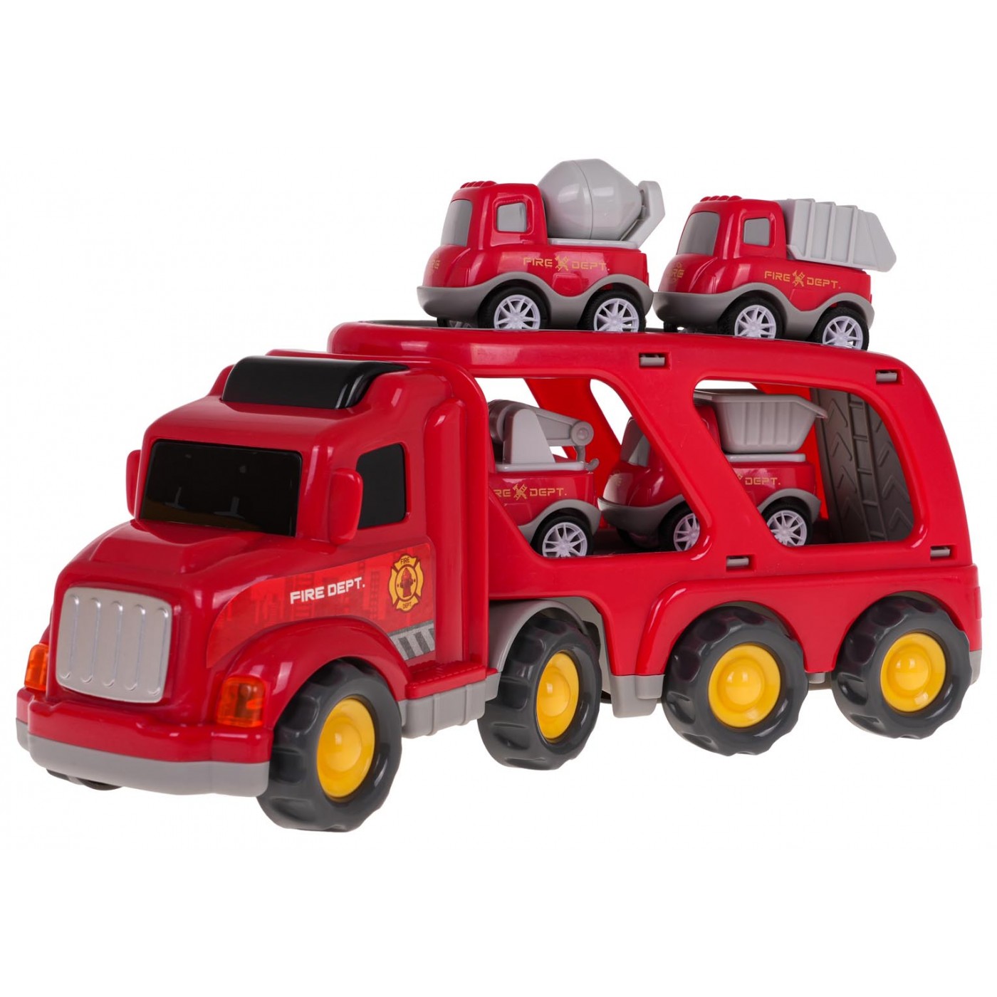 Interaktívna súprava vozidiel, ťahák so štyrmi vozidlami pre deti od 3 rokov. Súprava je vyrobená z najkvalitnejšieho plastu v živých farbách. Auto má odnímateľný príves a otváraciu zadnú stenu. Do odťahového auta sa zmestia štyri vozidlá: sklápač, domiešavač betónu, žeriav a auto s kontajnerom. Po stlačení tlačidla umiestneného na streche kabíny nákladného vozidla zablikajú predné svetlá vozidla a ozvú sa zvuky štartovania, jazdy a trúbenia vozidla. Autíčko je napájané 3 x AG13 batériami (batérie sú súčasťou balenia).
