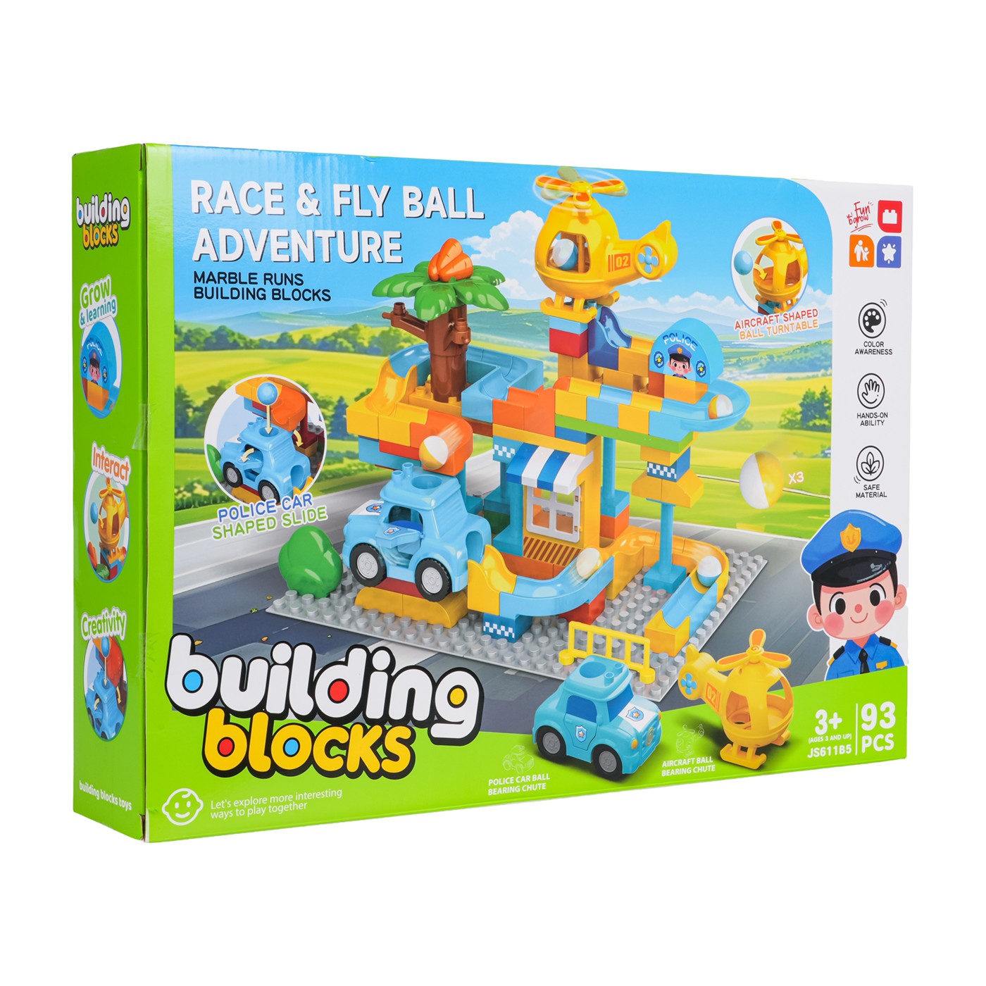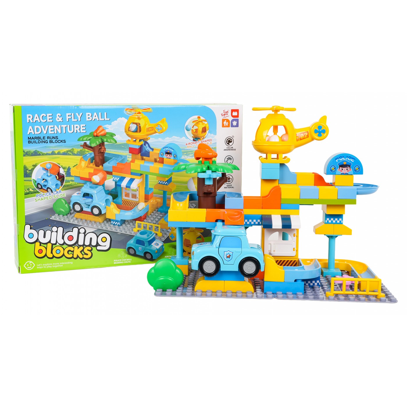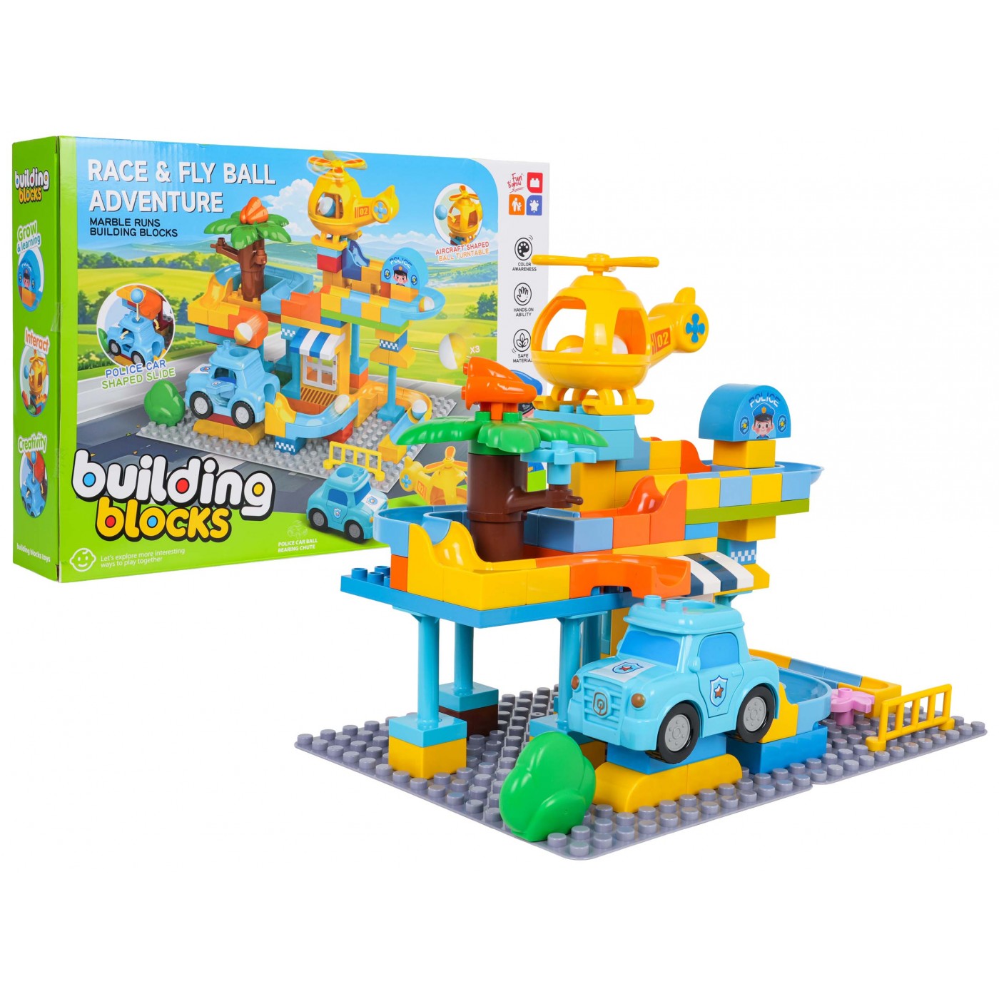 Vlastnosti: - pre deti od troch rokov, - vyrobené z najkvalitnejších materiálov, - jednoduché spájanie prvkov a stabilná konštrukcia, - bohatstvo farieb stimuluje zmysly dieťaťa, - policajné auto a vrtuľník majú otvory, cez ktoré môže preletieť lopta, - perfektná sada pre kreatívne hranie. |