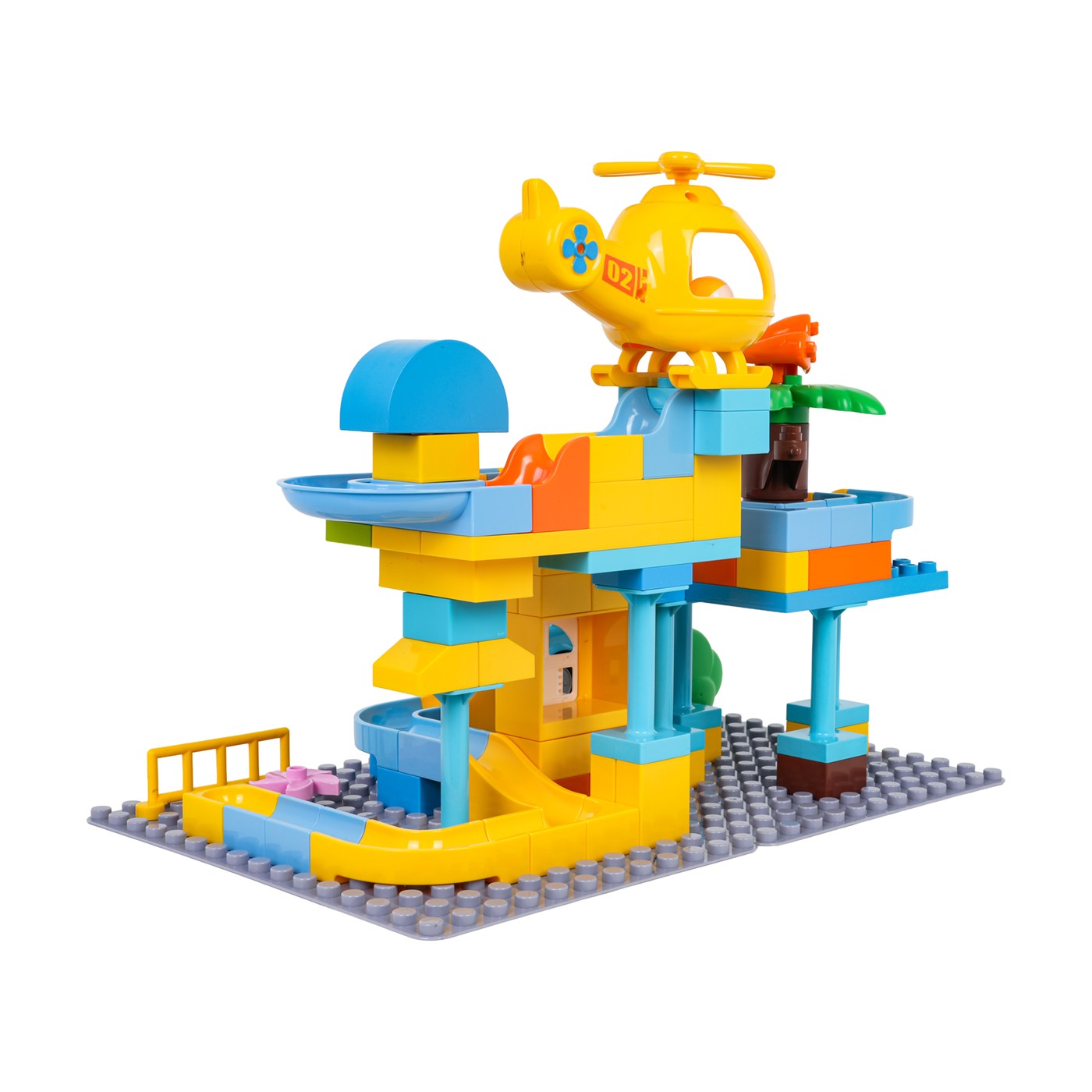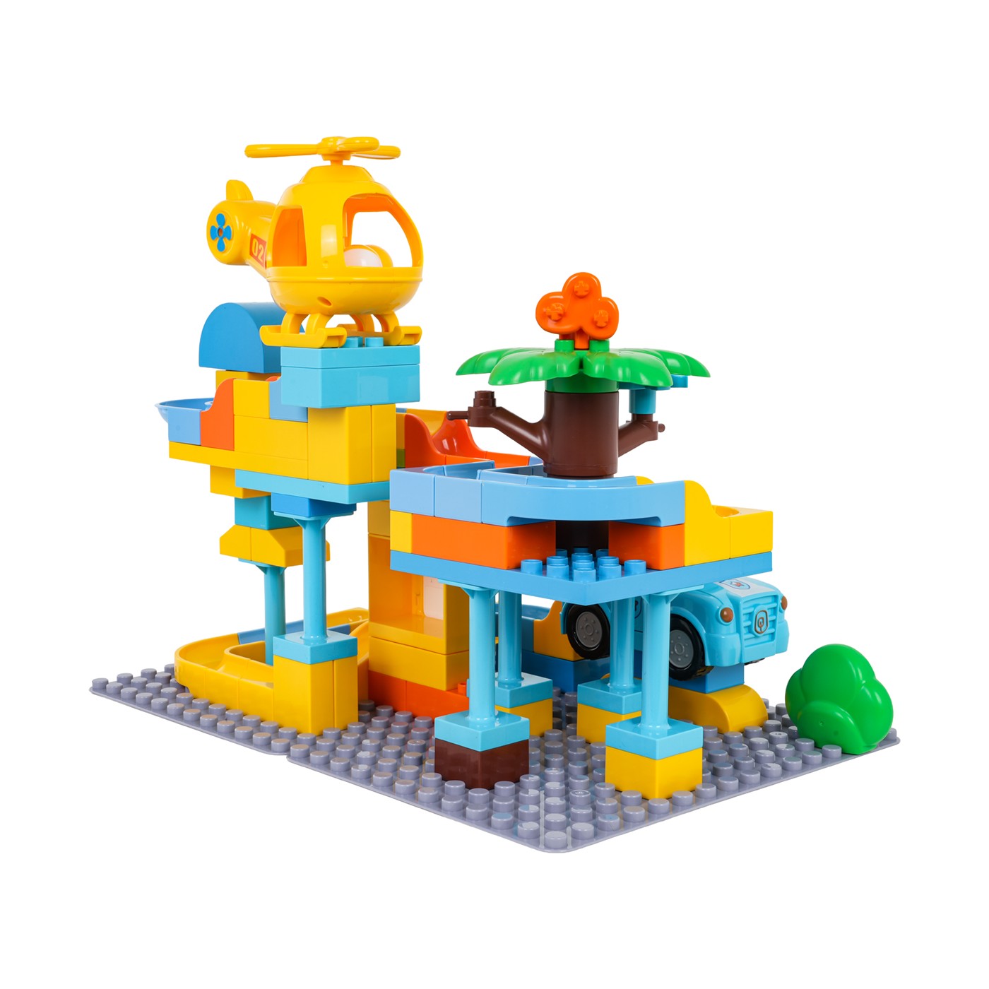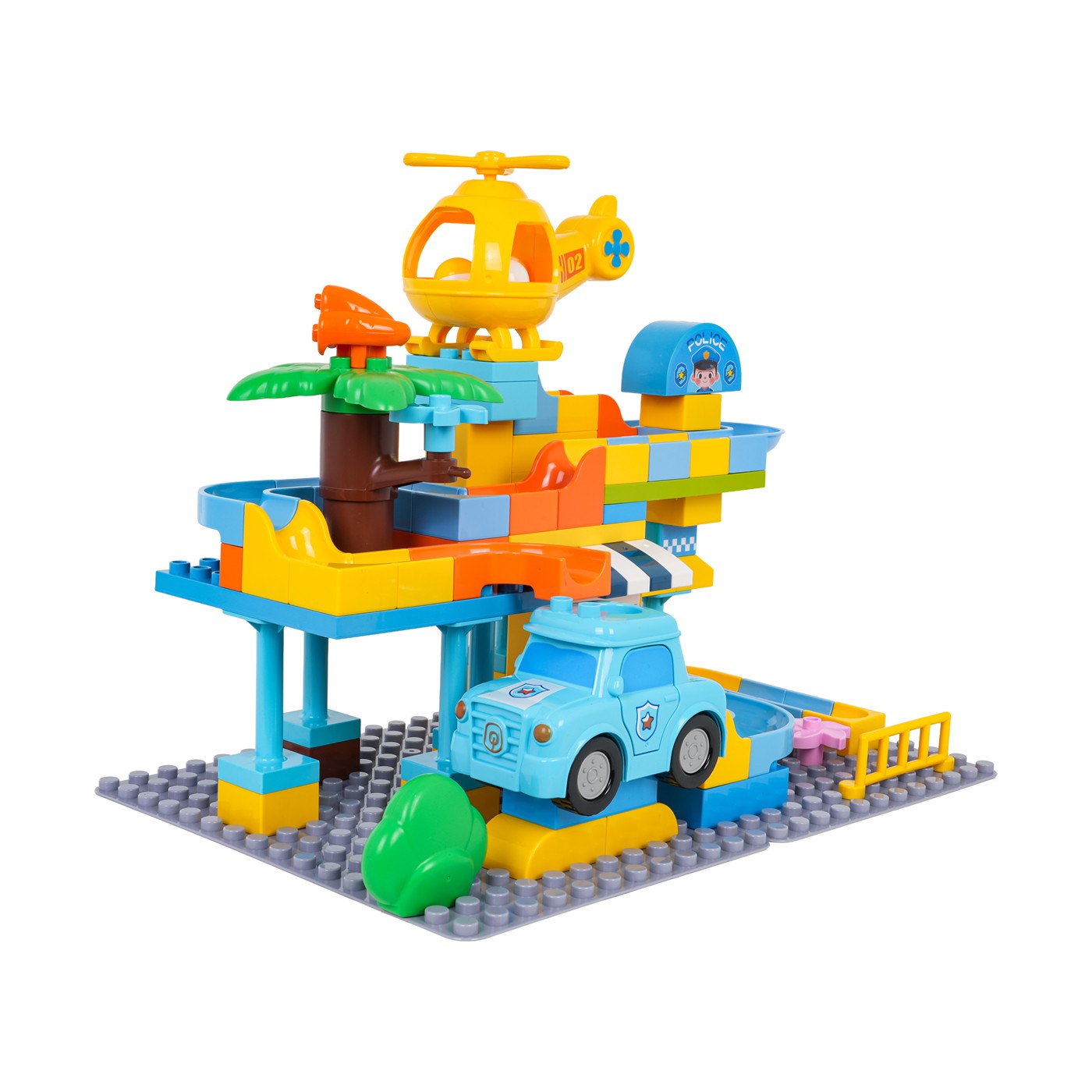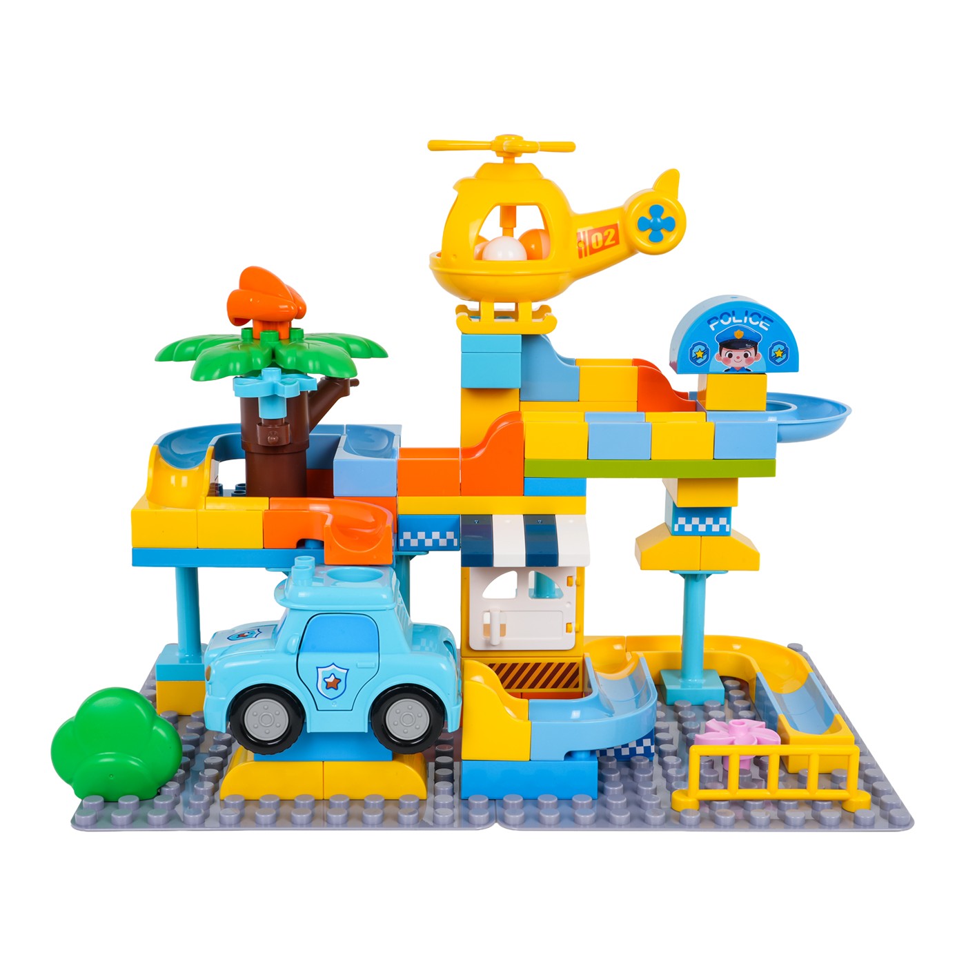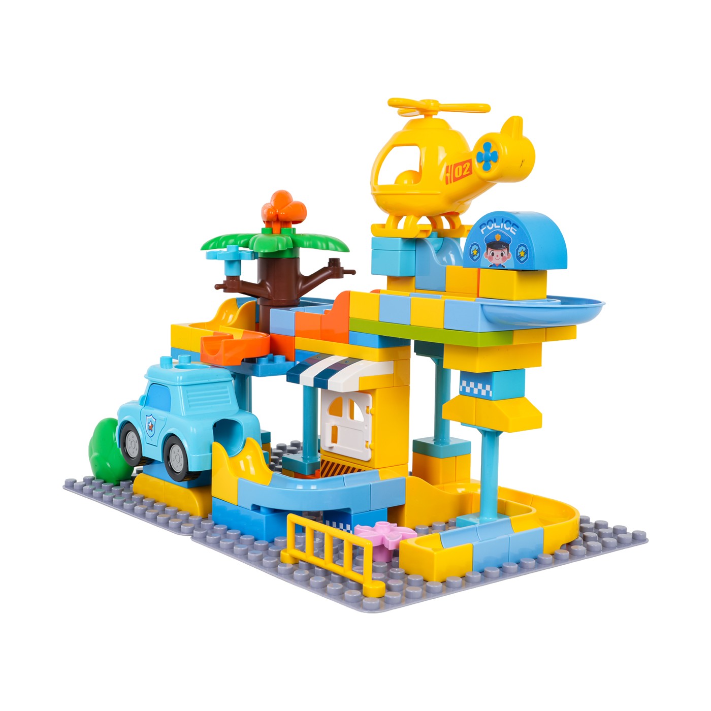 Táto sada veľkých, farebných kociek umožňuje deťom od troch rokov postaviť si policajnú stanicu. Kocky sa dajú ľahko spojiť a vytvoriť stabilné konštrukcie. Sýte farby podporujú kreatívnu hru. Sada obsahuje aj šmykľavku, autíčko, vrtuľník a tri loptičky. Vrtuľník a policajné auto majú otvor, cez ktorý môže prejsť loptička. Táto sada je ideálna na kreatívnu hru.