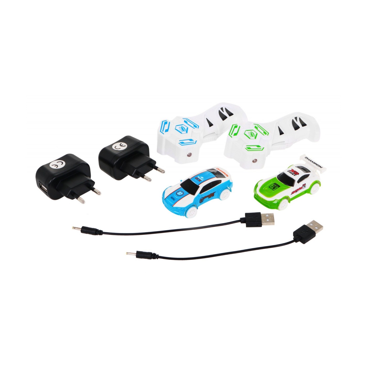 | - tor, - 2 samochodziki, - 2 piloty, - 2 ładowarki, - części składowe toru, - instrukcja montażu. | |
