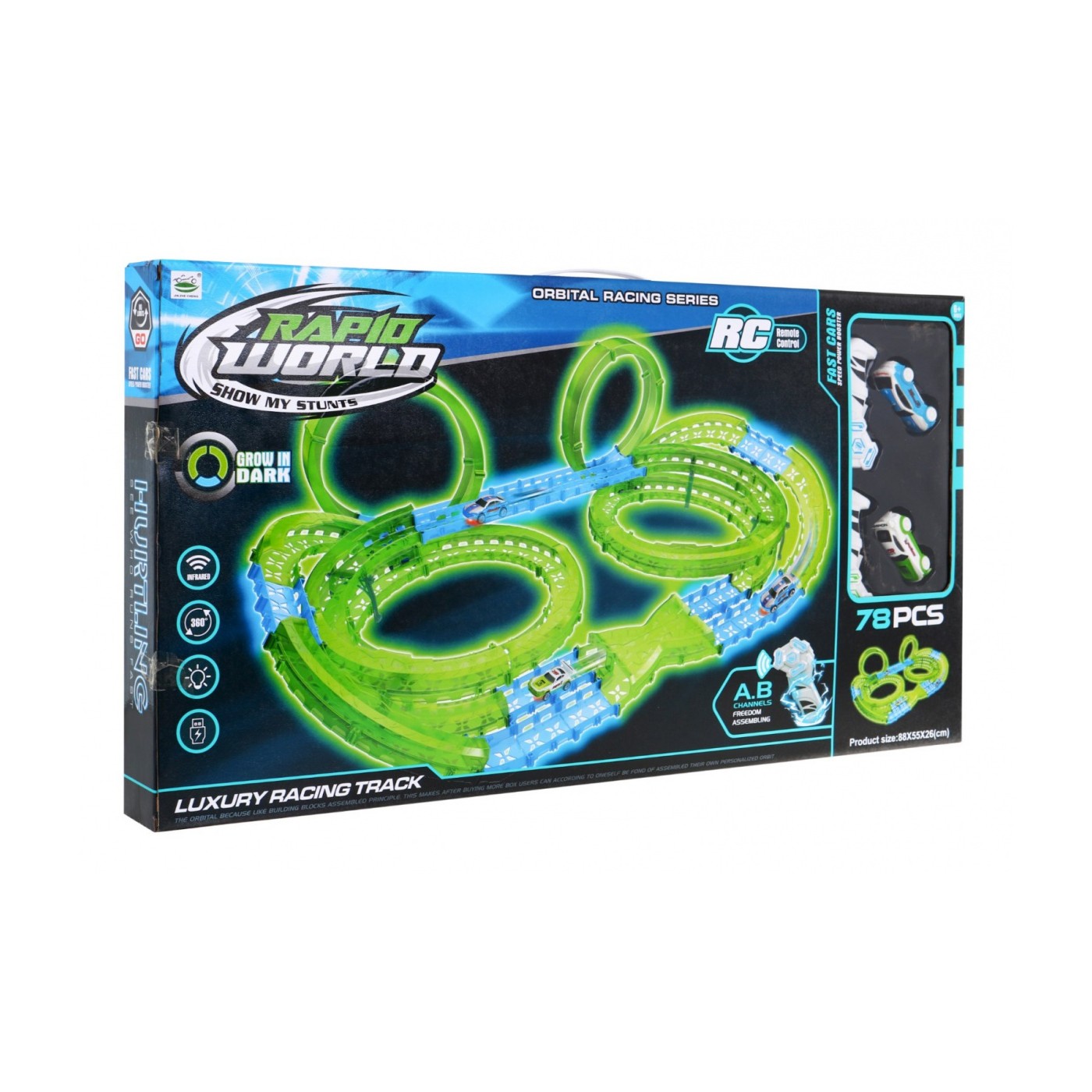 | | Duży tor świecący w ciemności to propozycja dla dzieci od 3-go roku życia. Zabawka zasilana jest bateriami typu 4 x AAA (brak w zestawie) - piloty oraz akumulatorami 2 x 3,7V (zawarte w zestawie) – samochody. Tor jest fluorescencyjny, świeci w ciemności. Samochodziki posiadają podświetlenie LED, jeżdżąc tworzą niesamowite efekty. Zabawa torem pozytywnie wpływa na koordynację wzrokowo-ruchową, budowanie toru pobudza wyobraźnię dziecka oraz rozwija zdolności manualne. |