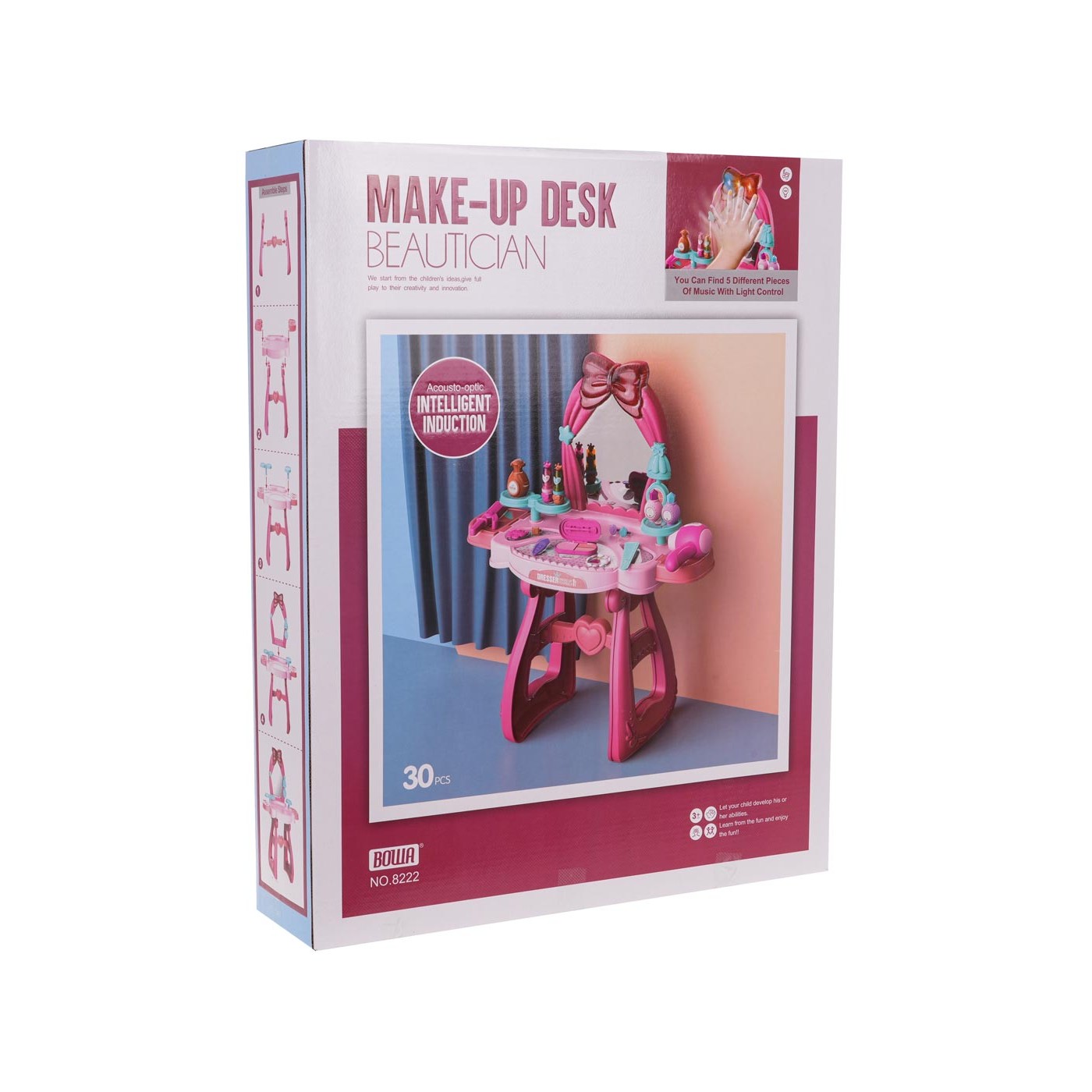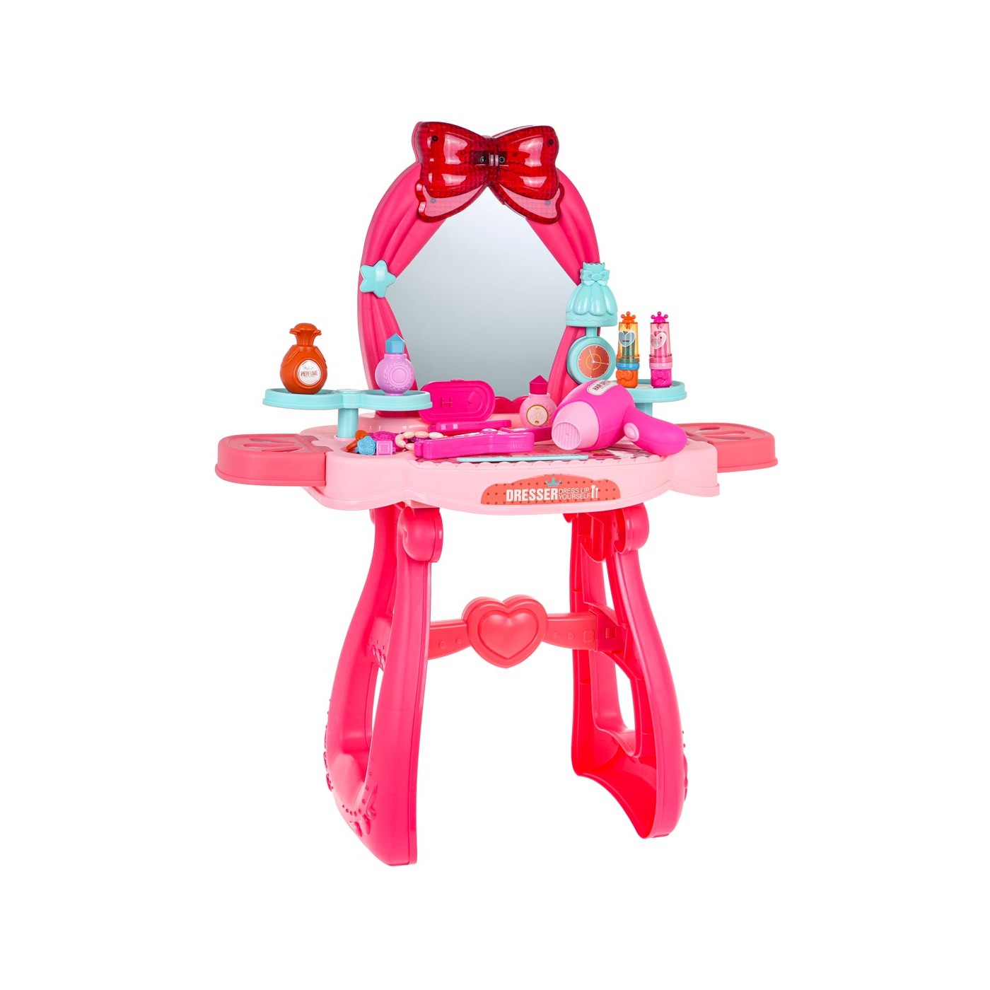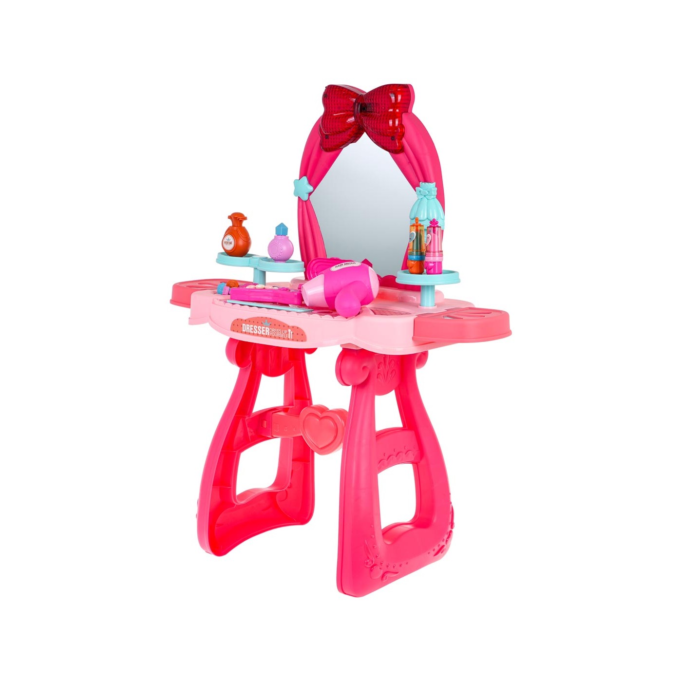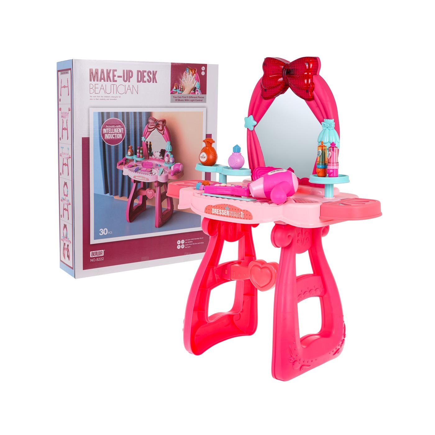 Dobre vybavený toaletný stolík s množstvom doplnkov so svetelnými a zvukovými funkciami pre deti od 3 rokov. Toaletný stolík je vyrobený z najkvalitnejšieho plastu v sýtych farbách. Je napájaný 3 x AA 1,5 V batériami (nie sú súčasťou balenia). Mašlička nad zrkadlom má senzor, ktorý pri pohybe spúšťa svetelné efekty v podobe blikajúcich svetiel a zvukové efekty v podobe veselých melódií.