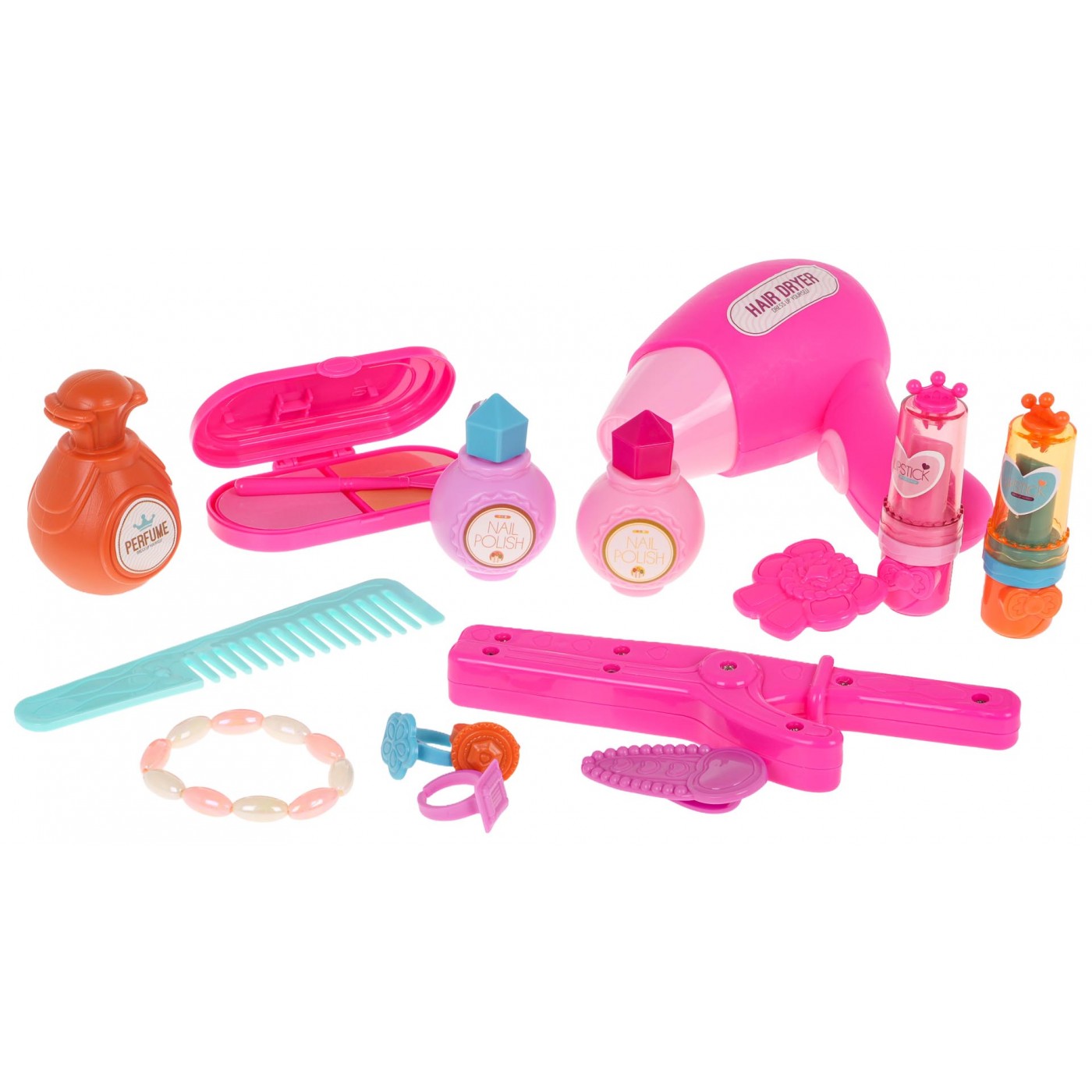 - toaletný stolík cca 70 cm x 56 cm x 27 cm, - sušička cca 10 cm x 6 cm, - rovnačka cca 16 cm x 4 cm x 2 cm, - kozmetická taštička cca 9 cm x 5 cm x 2 cm, - flakón na parfum cca 7 cm x 4,5 cm, - lak na nechty cca 6,5 cm x 3,5 cm, - rúž cca 8 cm x 2 cm, - prsteň s vonkajším priemerom cca 1,5 cm, - sponka do vlasov cca 5 cm x 2,5 cm, - hrebeň cca 13 cm x 3 cm, - balenie cca 54 cm x 42,5 cm x 10,8 cm. |