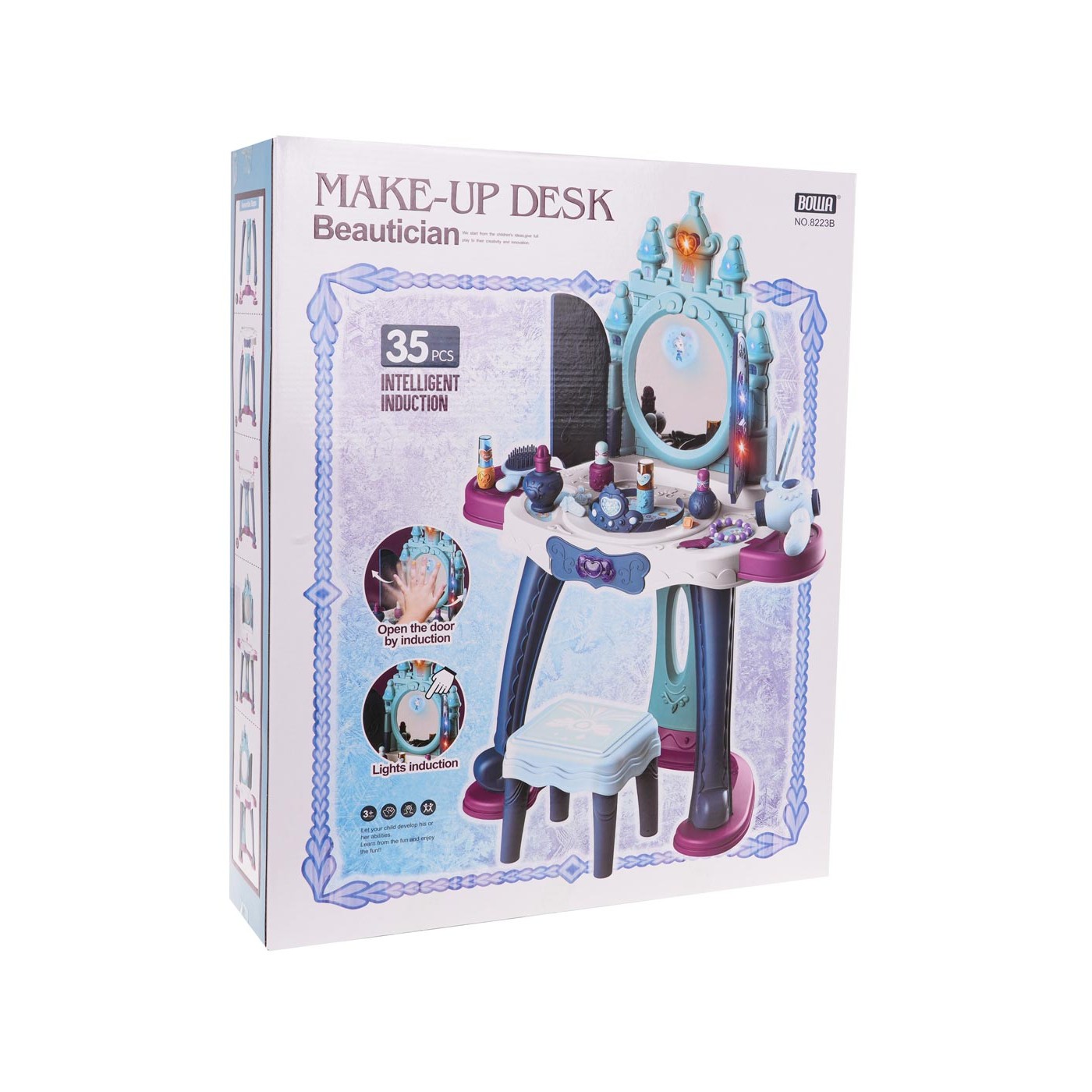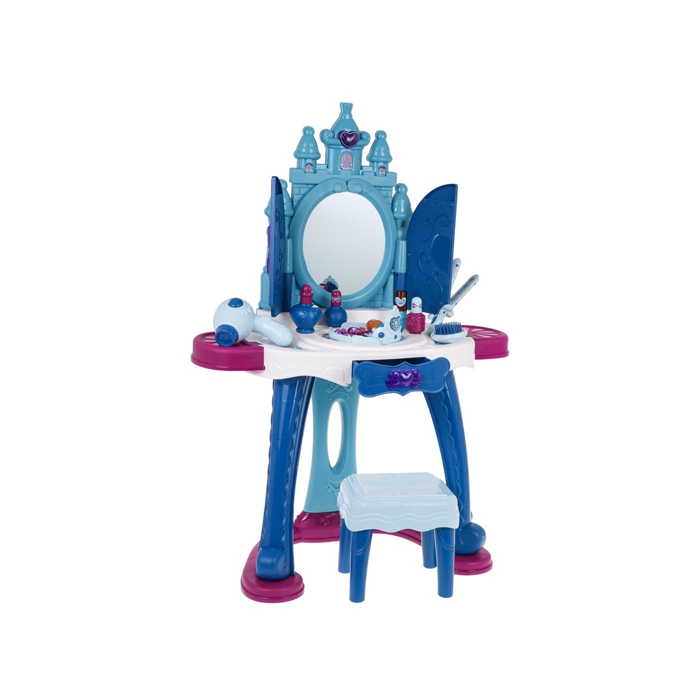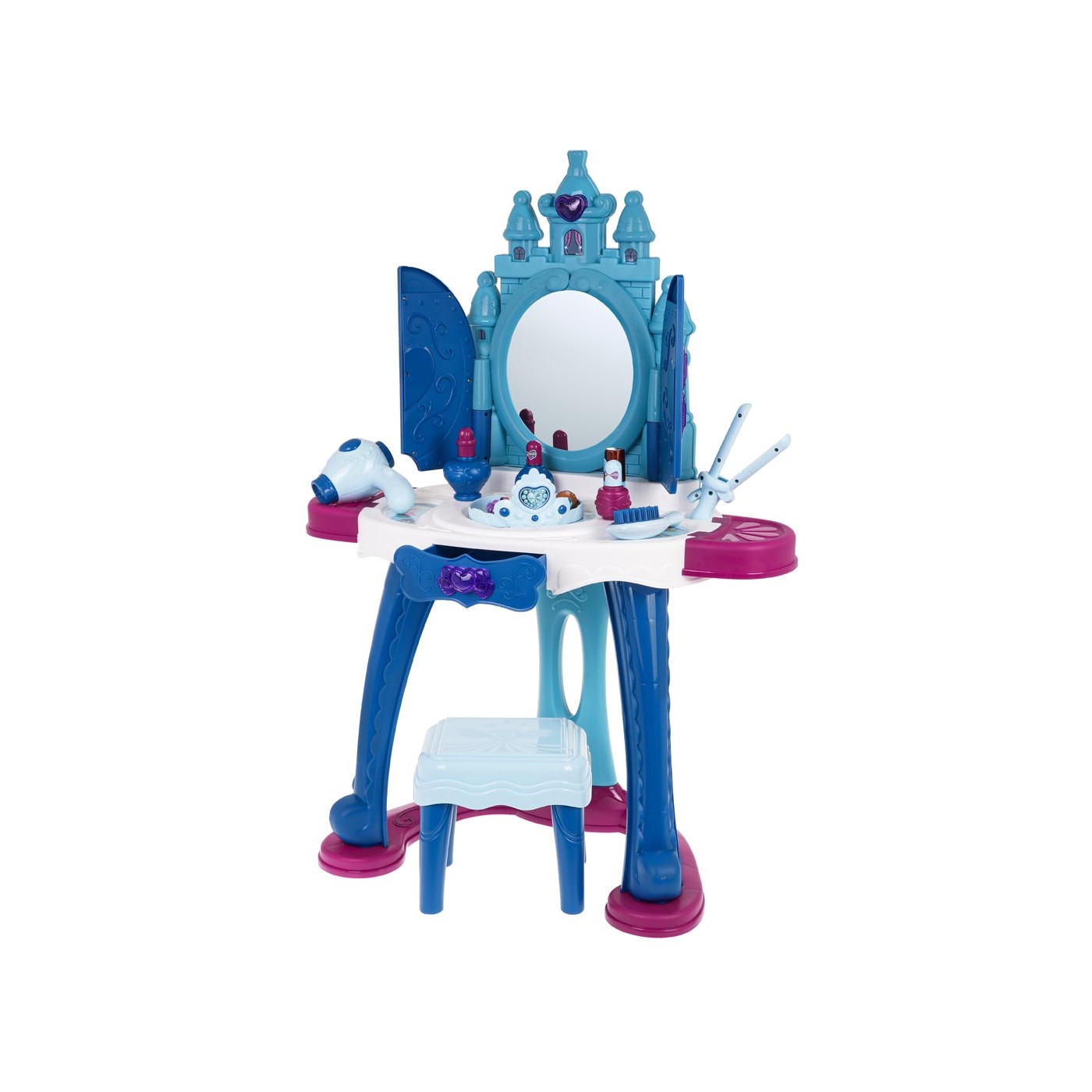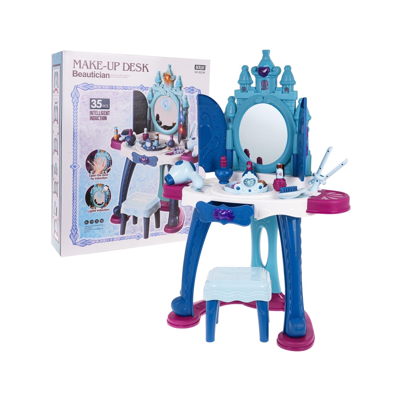 Dobre vybavený interaktívny toaletný stolík so svetelnými a zvukovými funkciami pre deti od 3 rokov. Hračka je vyrobená z najkvalitnejšieho plastu v živých farbách. Toaletný stolík je vybavený veľkou stolovou doskou, zásuvkou, policami a veľkým otváracím zrkadlom so zvukovými efektmi ako sú veselé melódie a svetelné efekty. Nad zrkadlom je senzor, ktorý otvára a zatvára magickú bránu do zrkadla. Figúrky princezien sú zobrazené na zrkadle toaletného stolíka. Toaletný stolík je dodávaný s taburetom a množstvom maliarskych doplnkov. Toaletný stolík je napájaný 3 x AA 1,5 V batériami (batérie nie sú súčasťou balenia).