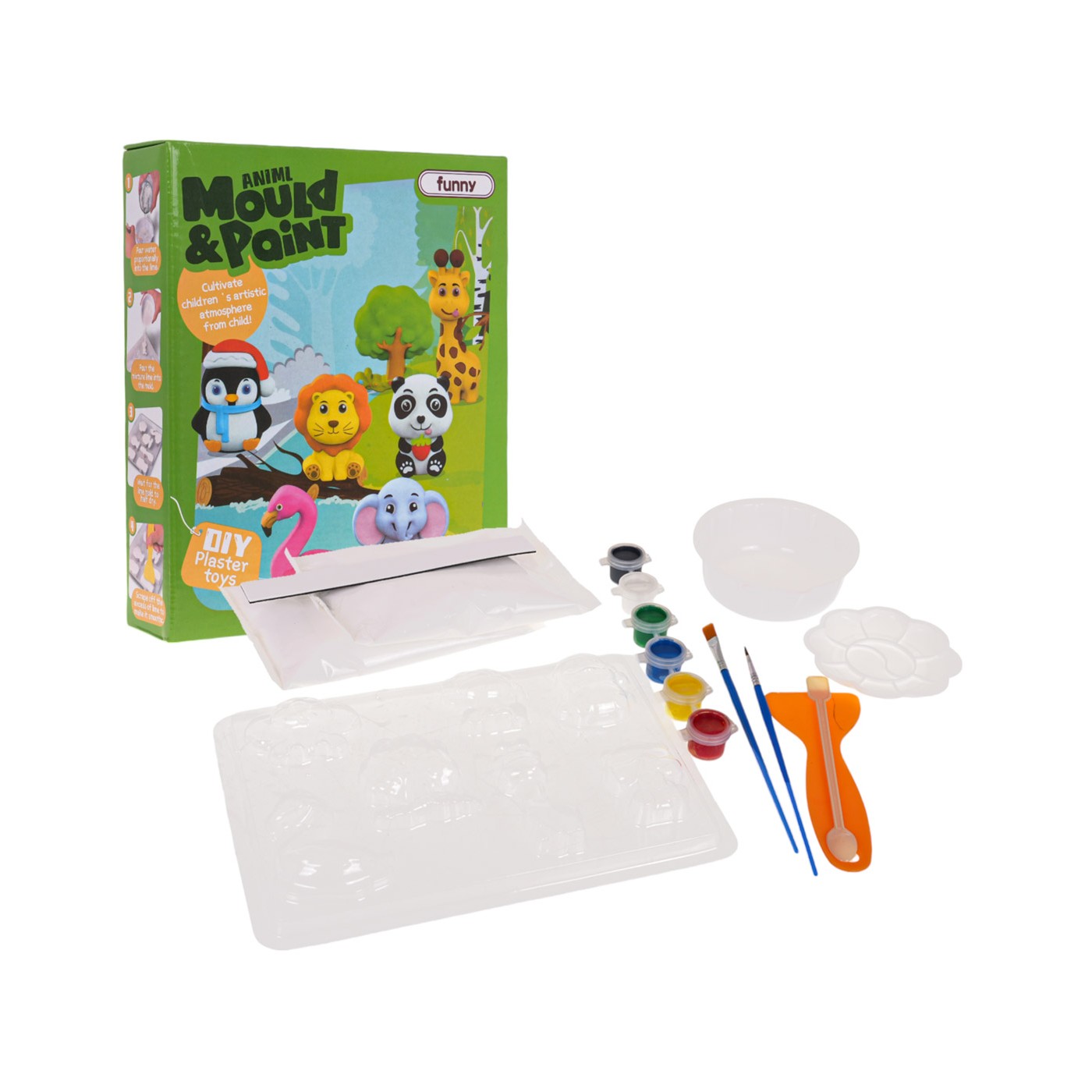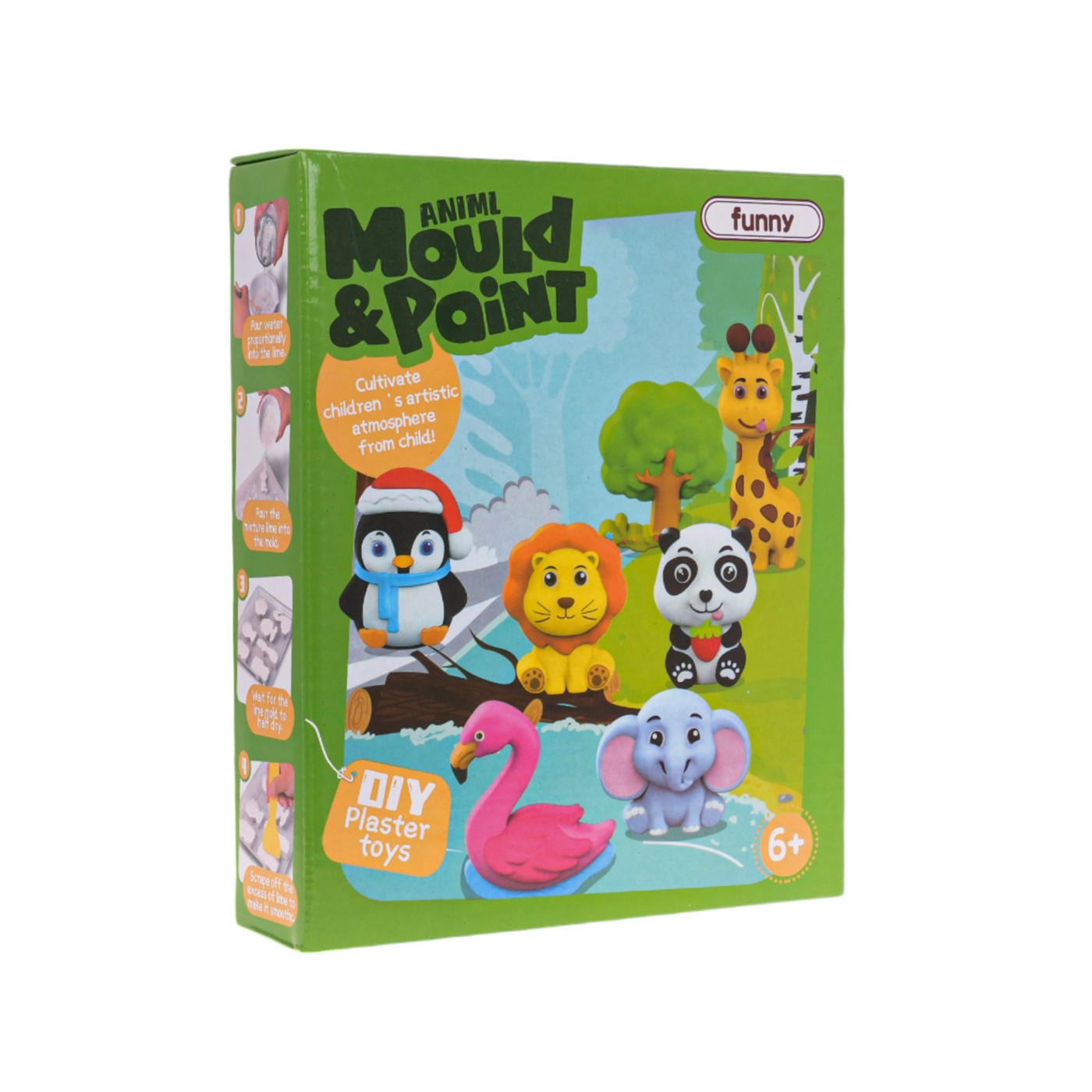 Kreatívna súprava na vytváranie sadrových odliatkov pre deti od 6 rokov. S touto sadou si vyrobíte 6 zvieratiek (slon, plameniak, žirafa, panda, tučniak, lev) a stromček. Súprava obsahuje všetko potrebné na vytvorenie odliatku a jeho nafarbenie. Ide o súpravu, ktorá spája vedu a kreatívne nápady. Rozvíja manuálne a estetické zručnosti dieťaťa. Prášok nasypte do misky, potom zalejte vodou a intenzívne premiešajte a potom počkajte, kým odliatok stuhne. Potom vyberte odliatok z formy a namaľte ho podľa seba. Ak na hotový odliatok nalepíme pásik magnetu (súčasť balenia), vytvoríme dokonalé, ručne vyrobené magnetky na chladničku.