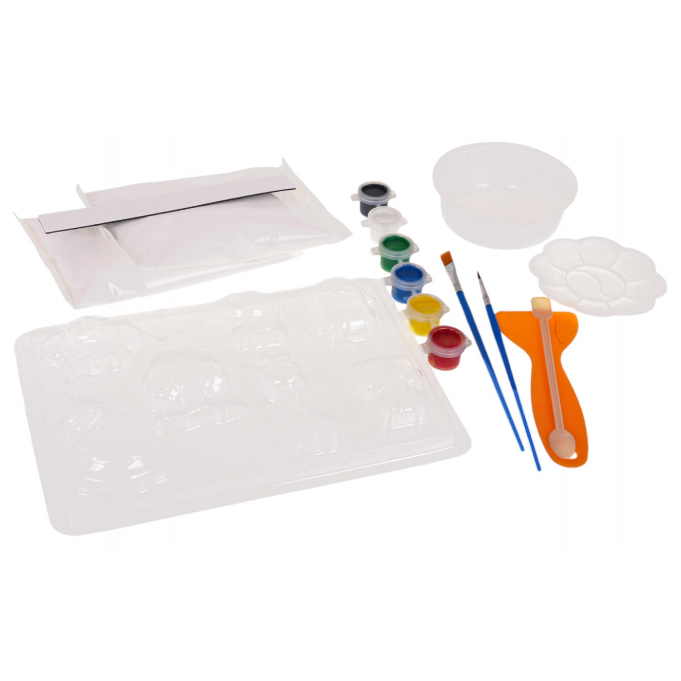 - odlievacia forma, - 2 vrecká prášku zo sadry, - misku na zmes, - paleta farieb, - 2x štetec, - 6x farba, - rameno, - lyžička, - magnetický pásik, - manuál. |
