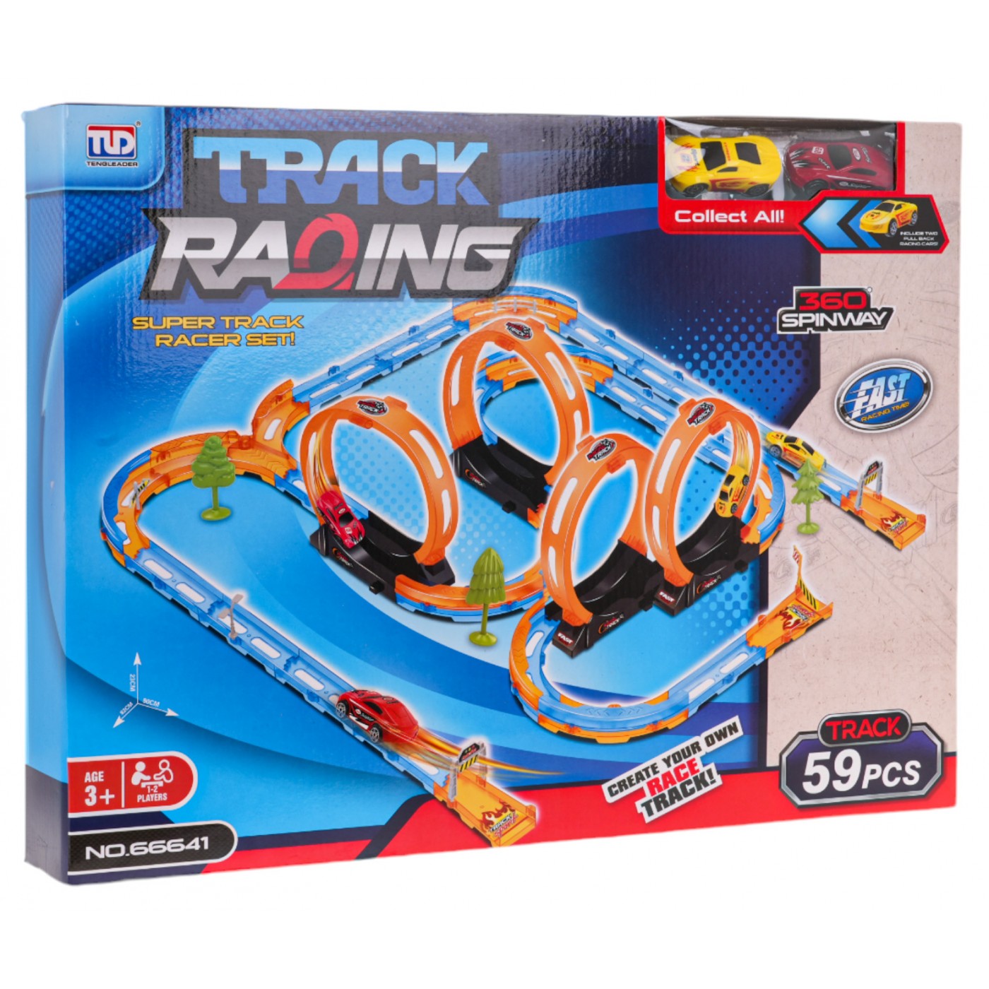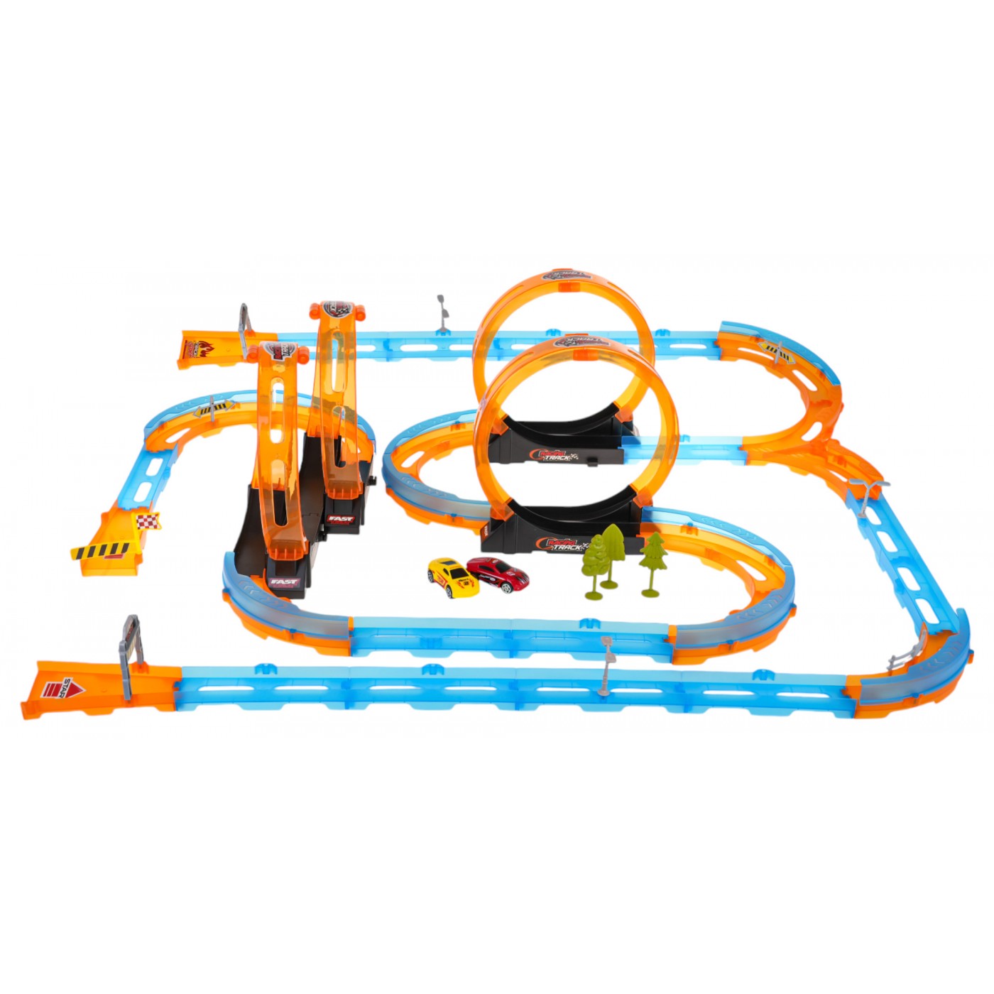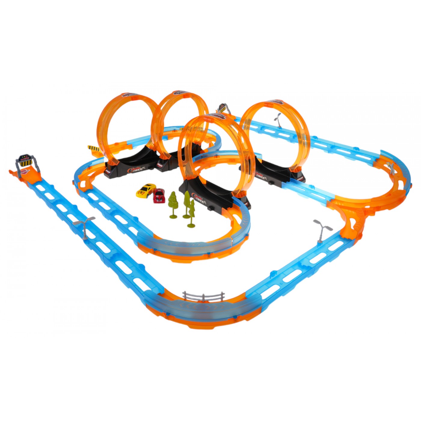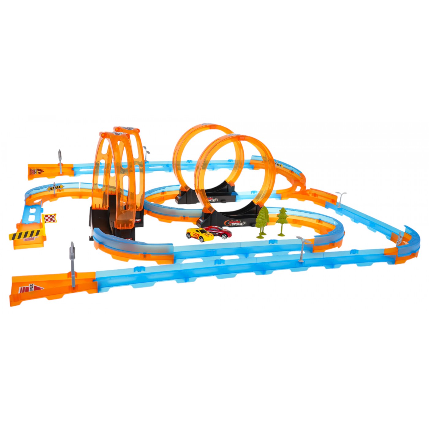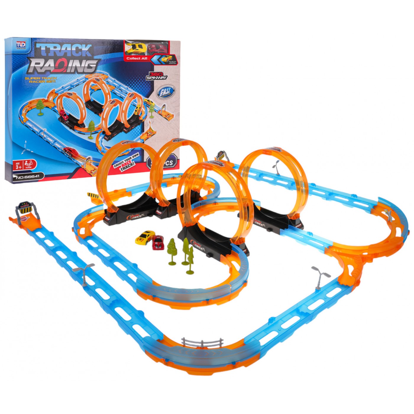 Dvojitá pretekárska dráha s 360-stupňovými slučkami, pre deti od 3 rokov. Dráha je vyrobená z najkvalitnejšieho plastu v živých farbách. Súprava pozostáva z 59 prvkov pre vlastnú montáž. Trať má rovné úseky na zrýchlenie vozidla, 4 360-stupňové slučky a dve vozidlá. Vozidlá sú poháňané ťahovým pohonom späť . Stačí jemne zatlačiť vozidlo dozadu a rozbehne sa po trati na plný výkon