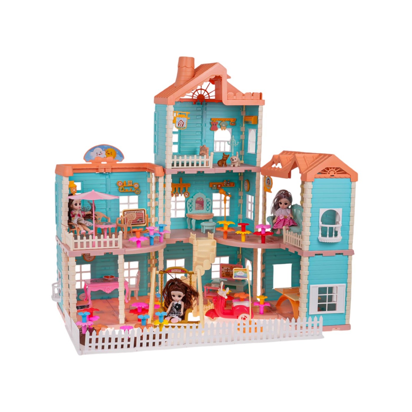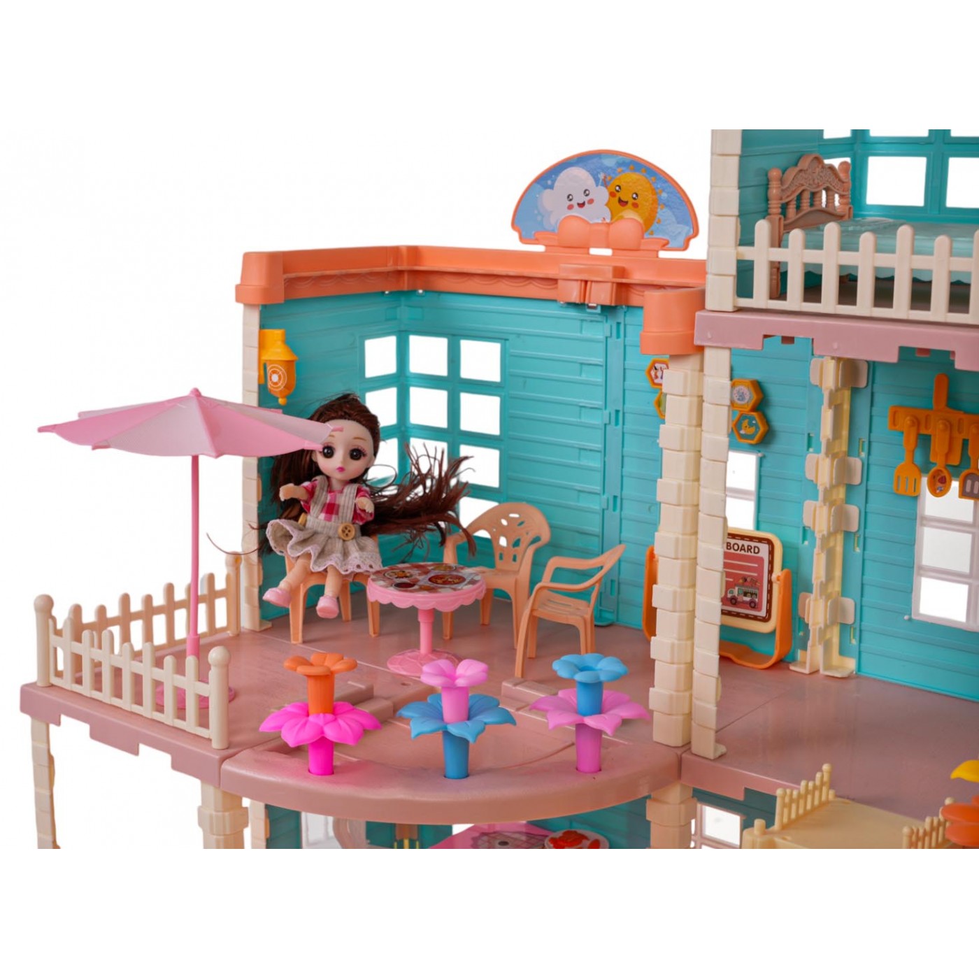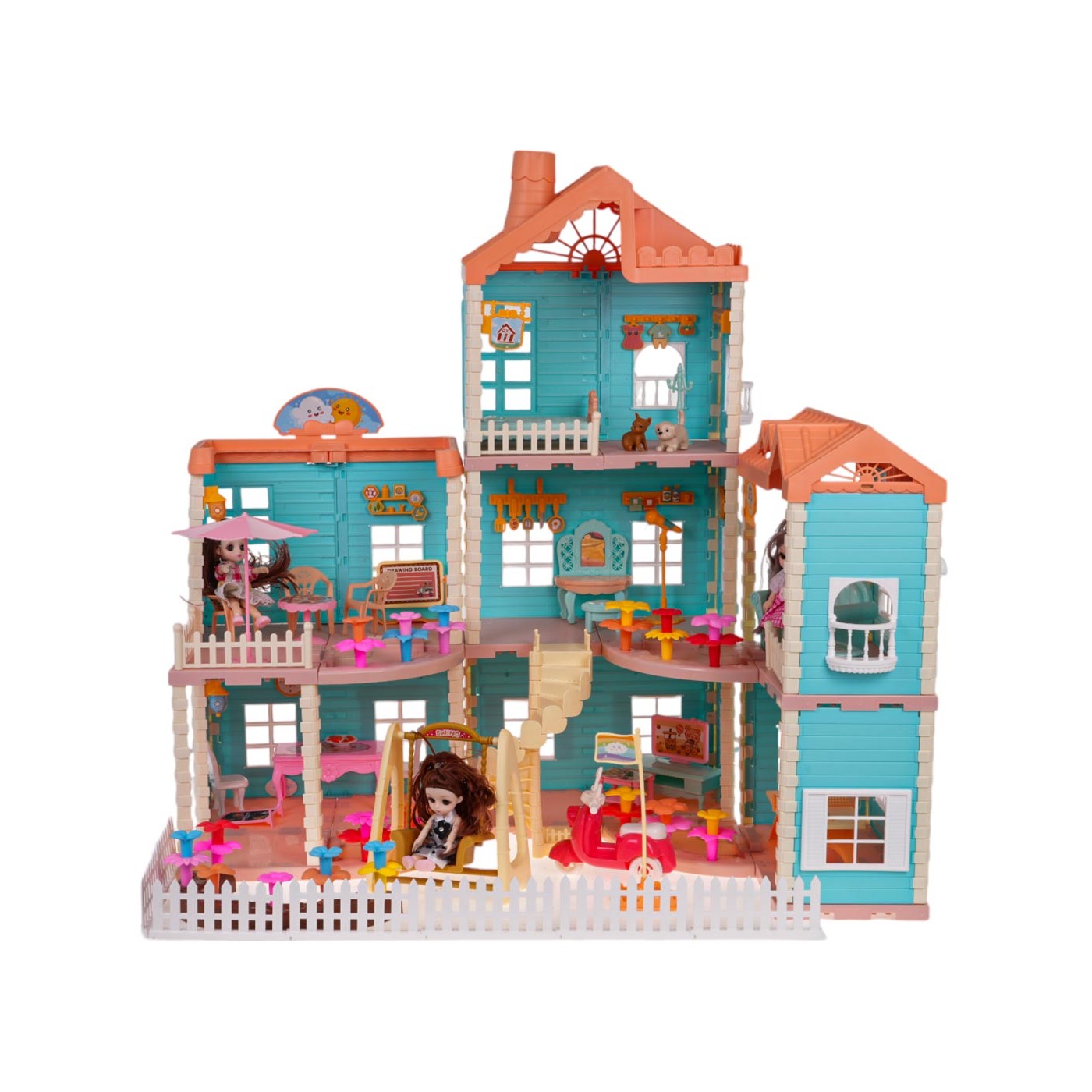 Krásny, veľký, interaktívny domček pre bábiky s plnou výbavou a tromi bábikami v súprave pre deti od 3 rokov. Domček má svetelnú funkciu (2 svietidlá svietia) a dymovú funkciu (z komína vychádza para pripomínajúca dym). Svietidlá sú napájané 3 x AG13 batériami (každá), batérie sú súčasťou sady, komín je napájaný 3 x AAA 1,5 V batériami (nie sú súčasťou). Dom pozostáva z 3 poschodí a miestností ako kuchyňa, spálňa, obývačka, hudobná miestnosť a terasa. Celý dom je vyzdobený množstvom kvetov. Vonku je tiež oddychová zóna s hojdačkou a biliardovým stolom. Hračka je vyrobená z najkvalitnejšieho plastu v živých farbách, ktoré upútajú pozornosť dieťaťa.