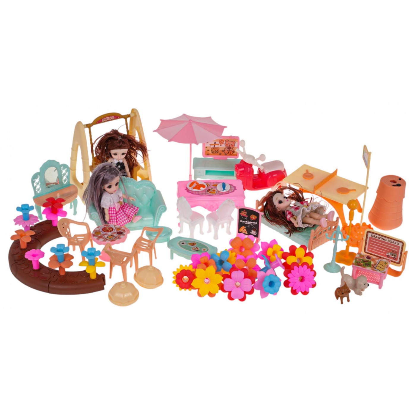 - konštrukčné časti domu, - 3x bábika, - záhradná hojdačka, - záhradný slnečník, - gauč, - stôl, - posteľ, - vešiak, - kozmetický stolík, - stolica, - pingpongový stôl, - veľký stôl, - 2x stolička, - komoda s TV, - okrúhly konferenčný stolík, - štvorcový stôl, - 3x záhradné kreslo, - 2 lampy, - 36 kvetov, - 2 psy, - mikrofón na stojane, - skúter, - návod na použitie, - dekoratívne nálepky. |