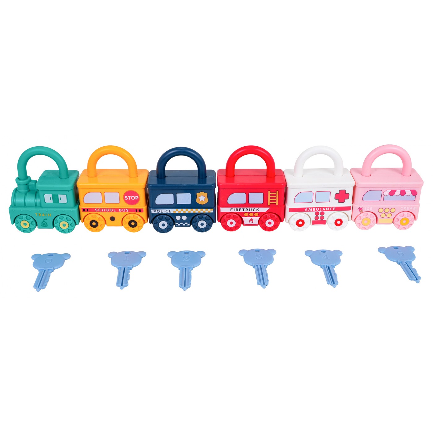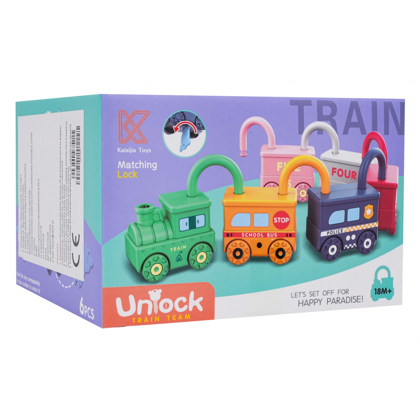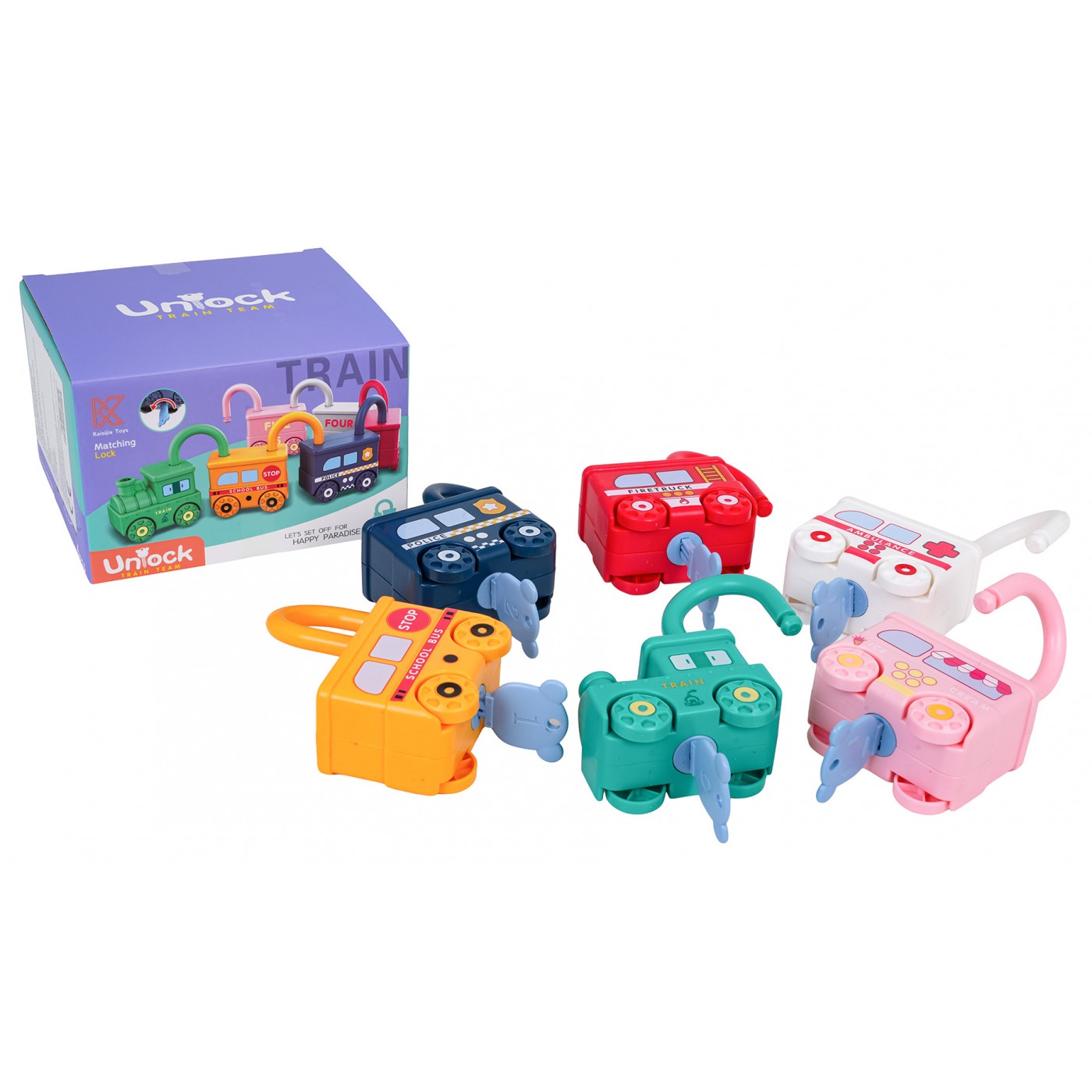 Vzdelávací, farebný vláčik s farebnými vagónmi so zámkami pre batoľatá od osemnástich mesiacov. Táto sada je vyrobená z najkvalitnejších materiálov, bezpečných pre malé deti, a spája zábavu s učením. Sada obsahuje šesť rôznych vozidiel: lokomotívu, školský autobus, policajné auto, hasičské auto, sanitku a zmrzlinársku dodávku. Lokomotíva a vagóny sú označené číslami od 0 do 5 a anglickými názvami vozidiel (Train, School Bus, Police, Firetruck, Ambulance, Ice Cream). To pomáha deťom učiť sa čísla a slová v angličtine. Každý vagón má na spodnej strane kľúčovú dierku a sada obsahuje sedem kľúčov. Jeden kľúč je univerzálny a otvára všetky vagóny, zatiaľ čo ostatné sú priradené ku konkrétnemu vozidlu. Kľúče sú označené číslami, rovnako ako vozidlá, čo pomáha deťom rozvíjať logické myslenie a učí asociácie. Vrchná časť zámku sa po otvorení dá otočiť o 360 stupňov. Vďaka tomu sa vagóny dajú spojiť a vytvoriť tak farebný vláčik.
