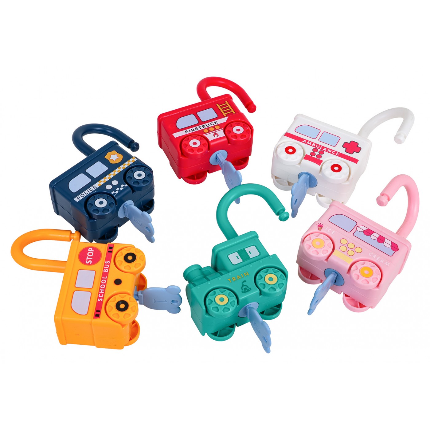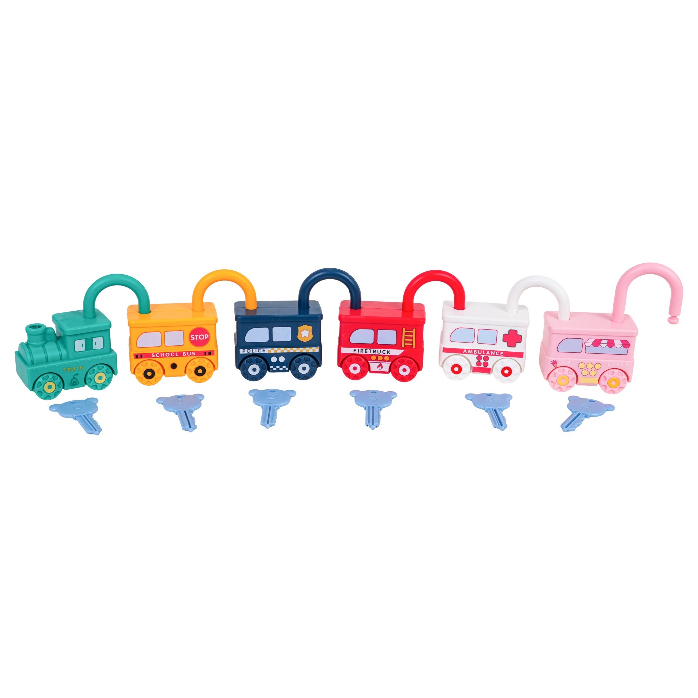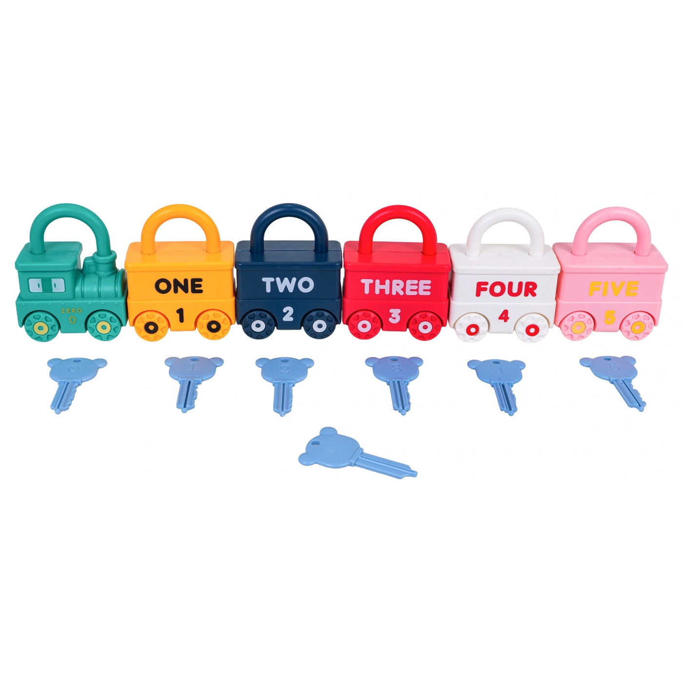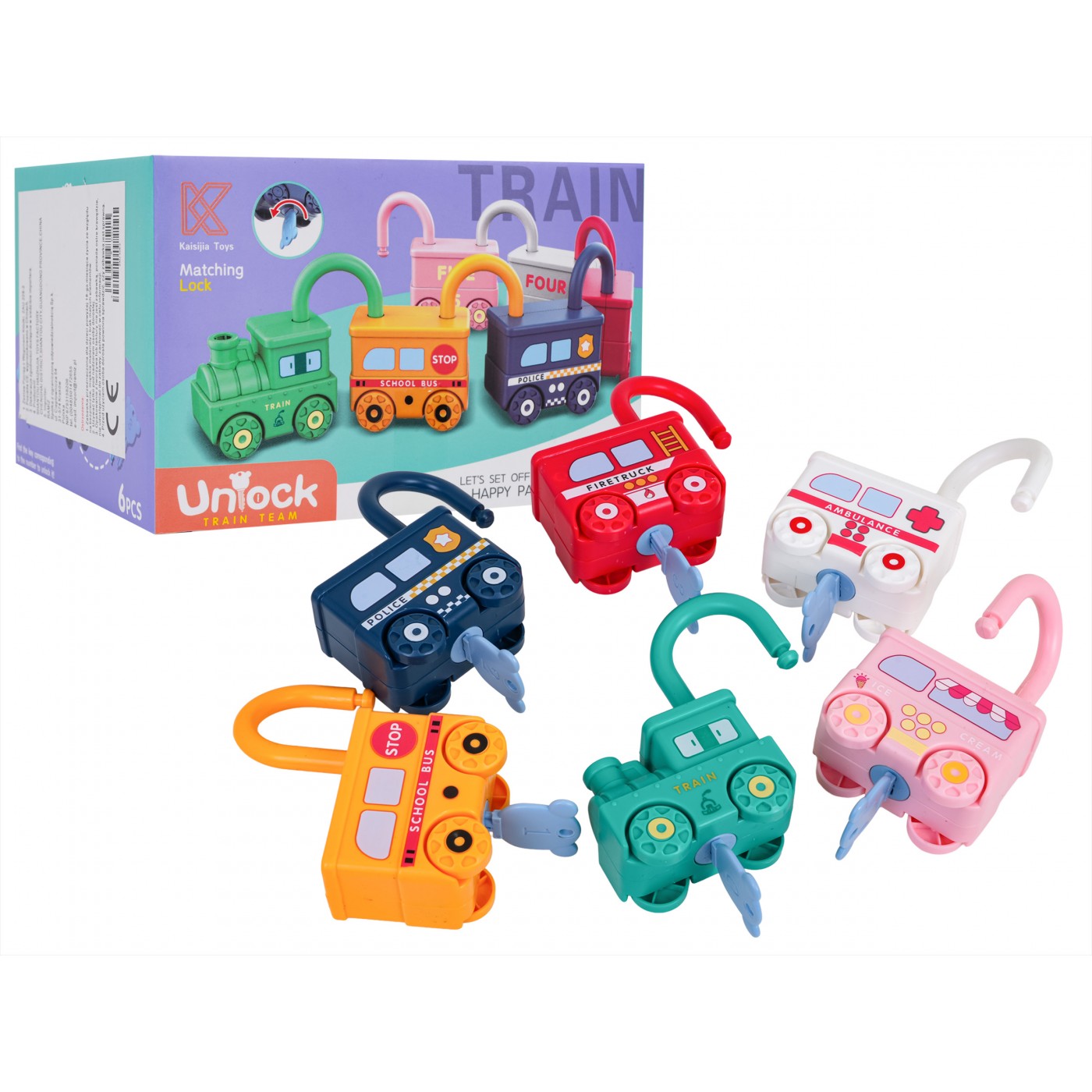 Vzdelávací, farebný vláčik s farebnými vagónmi so zámkami pre batoľatá od osemnástich mesiacov. Táto sada je vyrobená z najkvalitnejších materiálov, bezpečných pre malé deti, a spája zábavu s učením. Sada obsahuje šesť rôznych vozidiel: lokomotívu, školský autobus, policajné auto, hasičské auto, sanitku a zmrzlinársku dodávku. Lokomotíva a vagóny sú označené číslami od 0 do 5 a anglickými názvami vozidiel (Train, School Bus, Police, Firetruck, Ambulance, Ice Cream). To pomáha deťom učiť sa čísla a slová v angličtine. Každý vagón má na spodnej strane kľúčovú dierku a sada obsahuje sedem kľúčov. Jeden kľúč je univerzálny a otvára všetky vagóny, zatiaľ čo ostatné sú priradené ku konkrétnemu vozidlu. Kľúče sú označené číslami, rovnako ako vozidlá, čo pomáha deťom rozvíjať logické myslenie a učí asociácie. Vrchná časť zámku sa po otvorení dá otočiť o 360 stupňov. Vďaka tomu sa vagóny dajú spojiť a vytvoriť tak farebný vláčik.