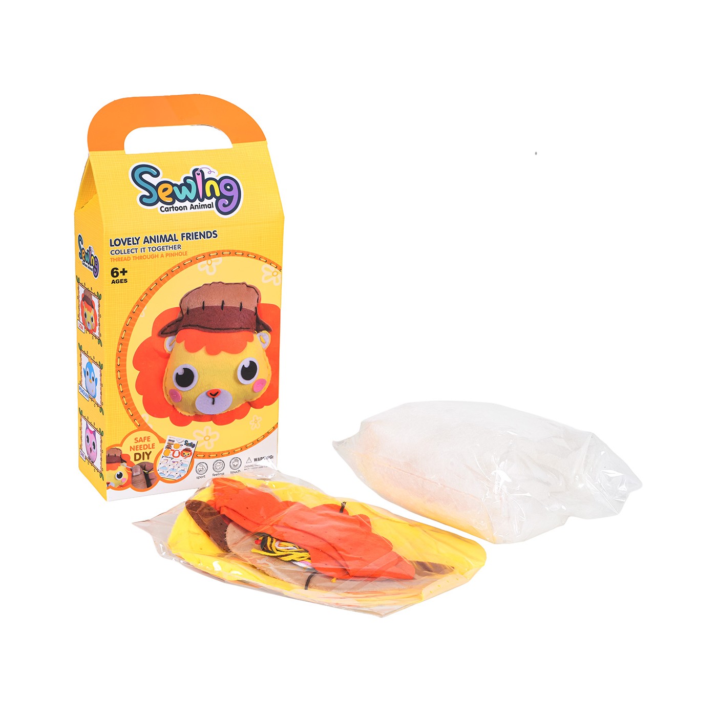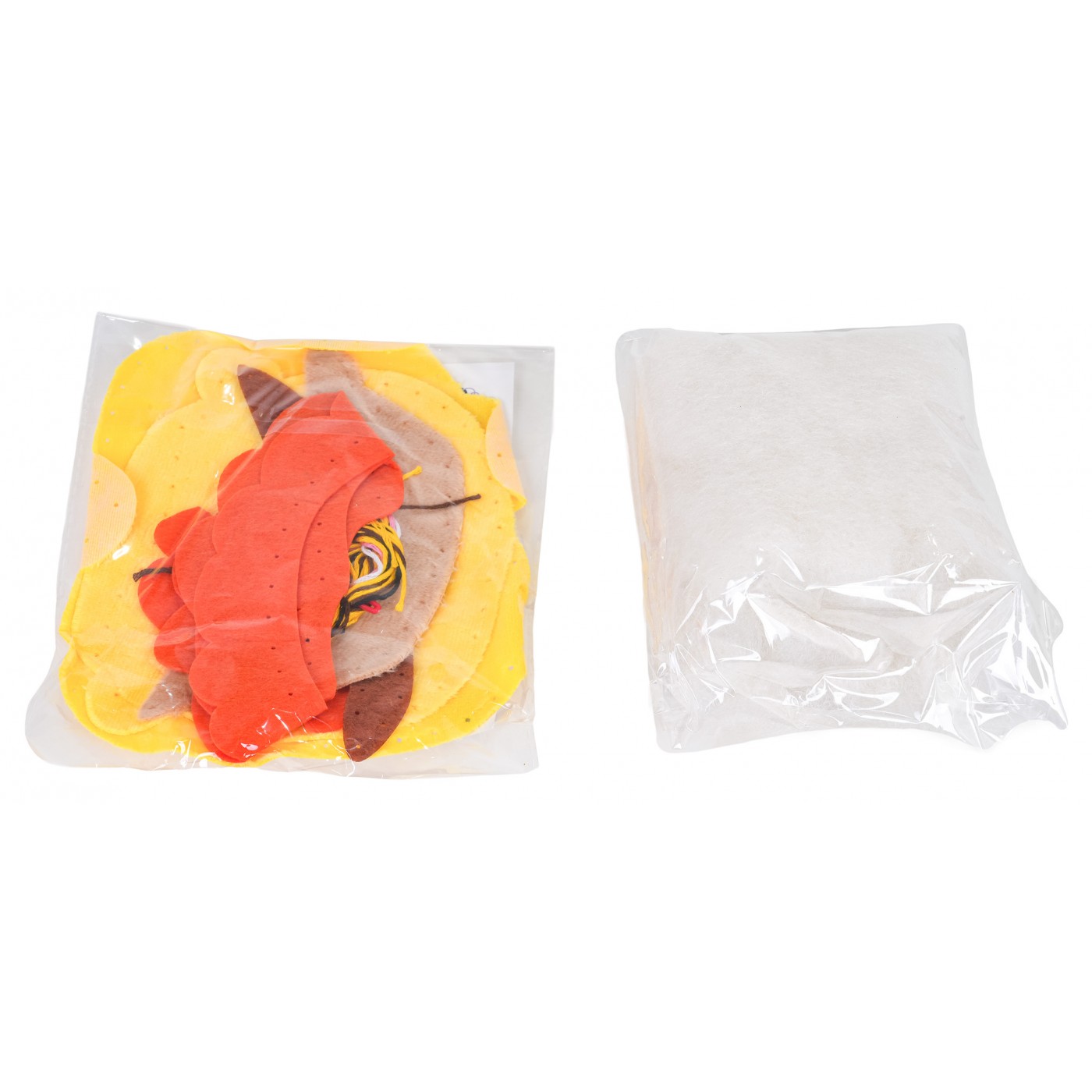 - výrez z látky v tvare leva, - iné dekoratívne prvky, - náplň, - nite, - plastová ihla, - pokyny. |
